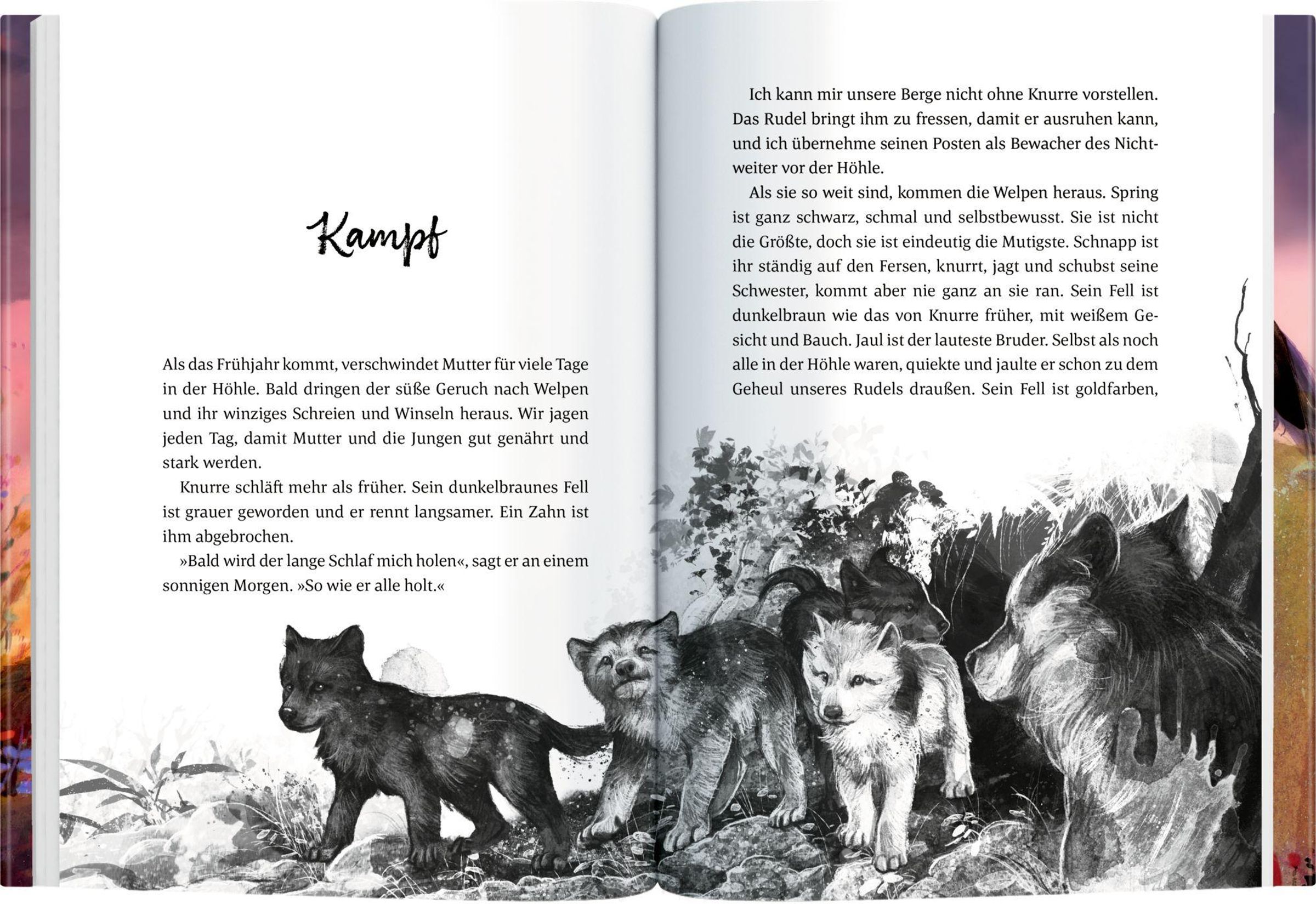 Mutter zieht mich mit ihrer Pfote näher zu sich heran. 'Ich weiß ein Geheimnis', sagt sie leise. 'Groß sein ist nicht das Einzige, was zählt für einen Wolf.'