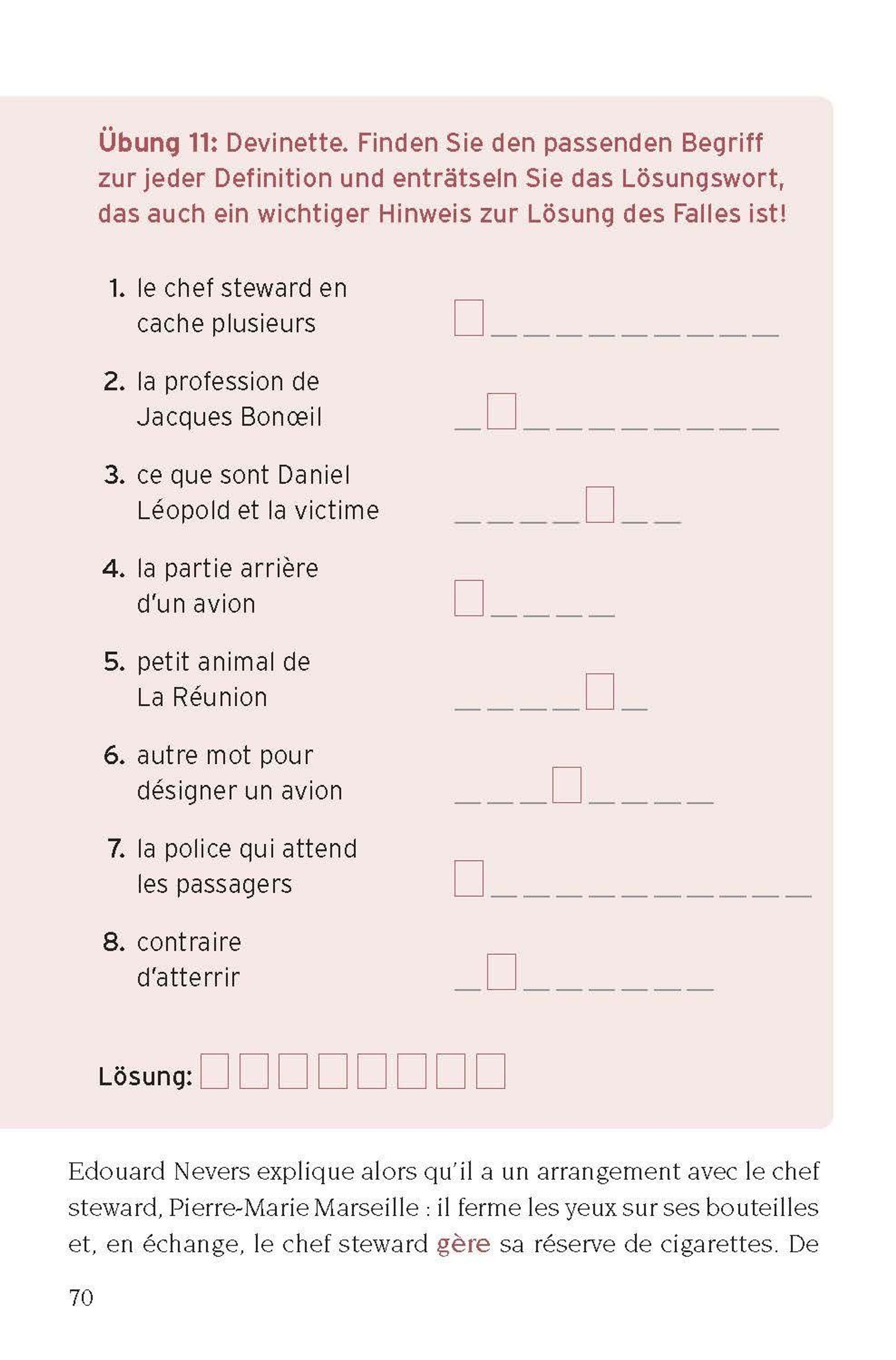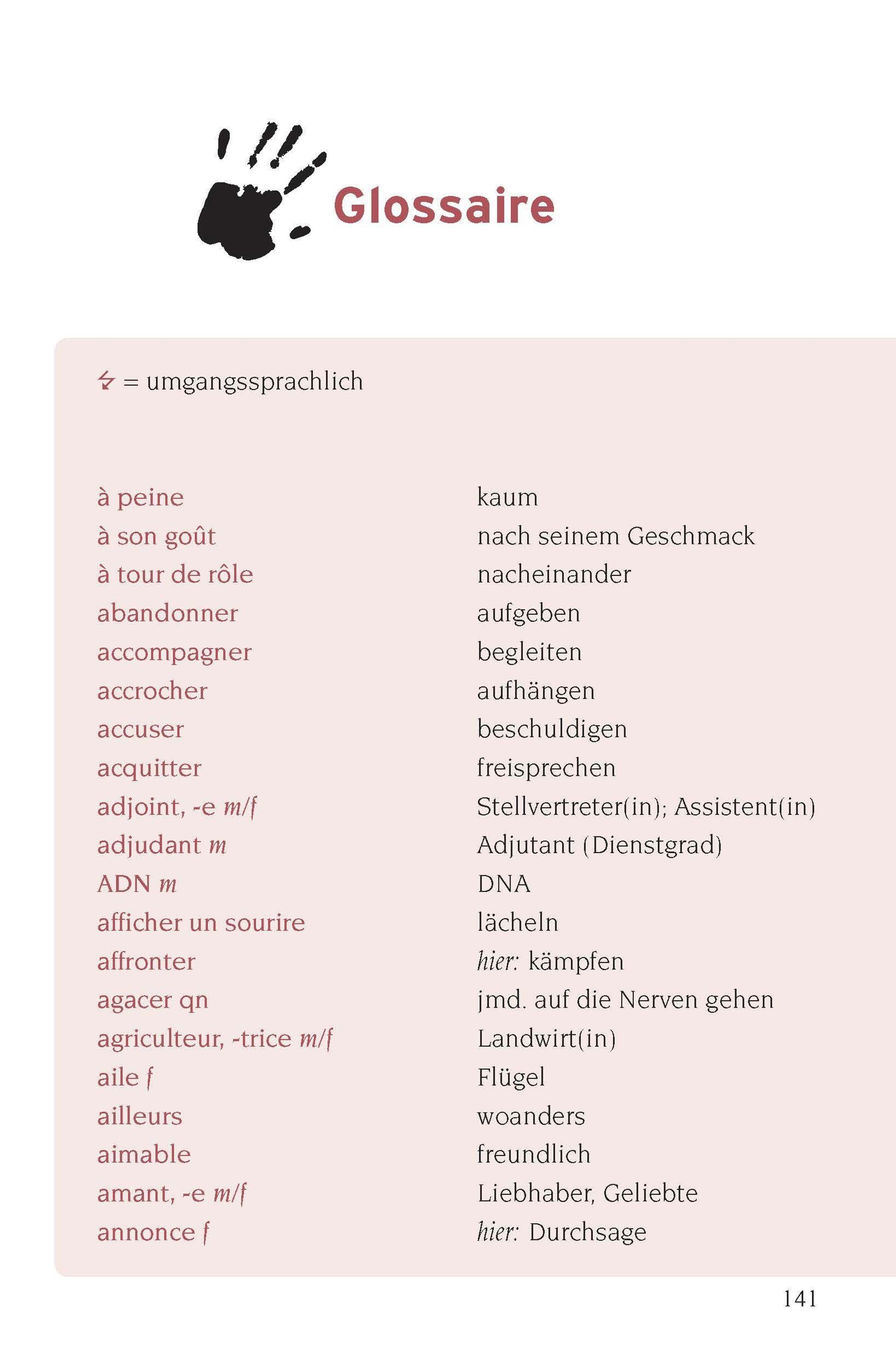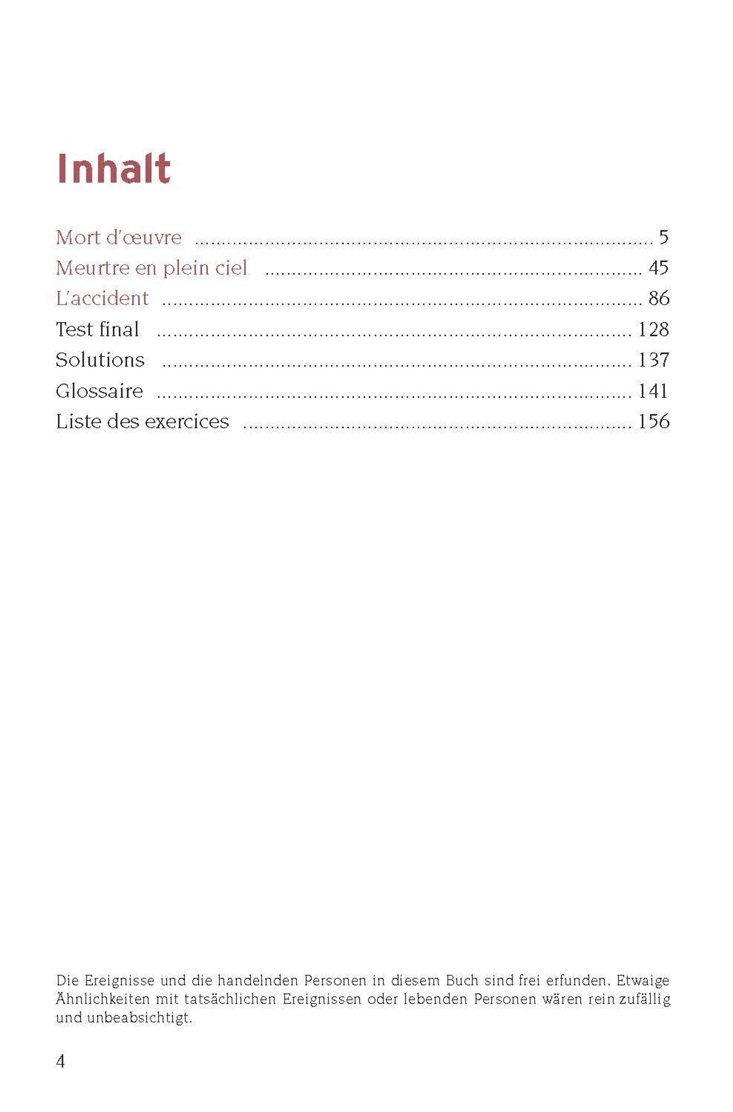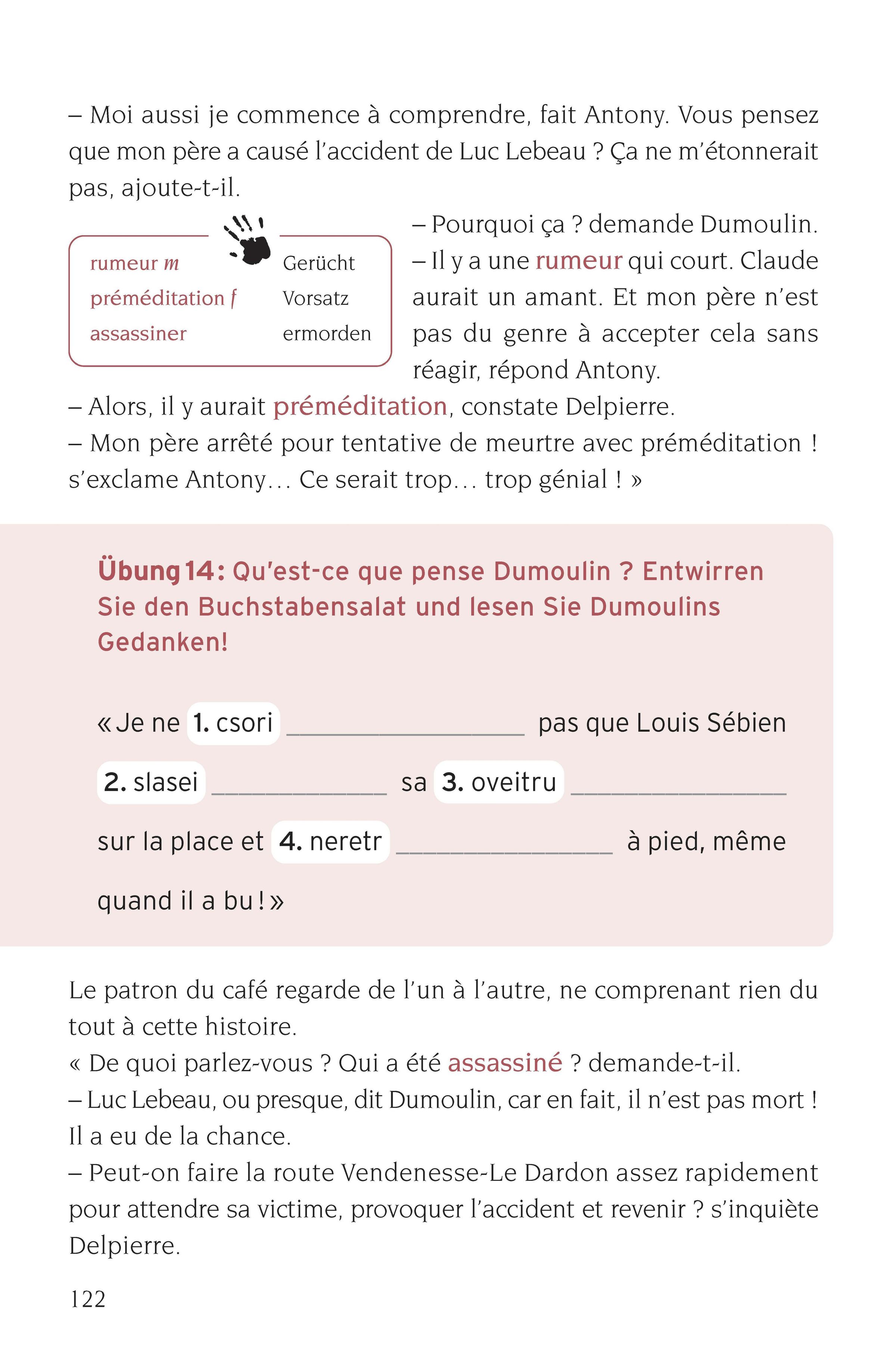 - Infokästen zu Sprache und Grammatik: Zusätzliche Informationen, Tipps und Wissenswertes zu Sprache, Grammatik und Landeskunde runden den Lernkrimi "Mort d'oeuvre" ab.