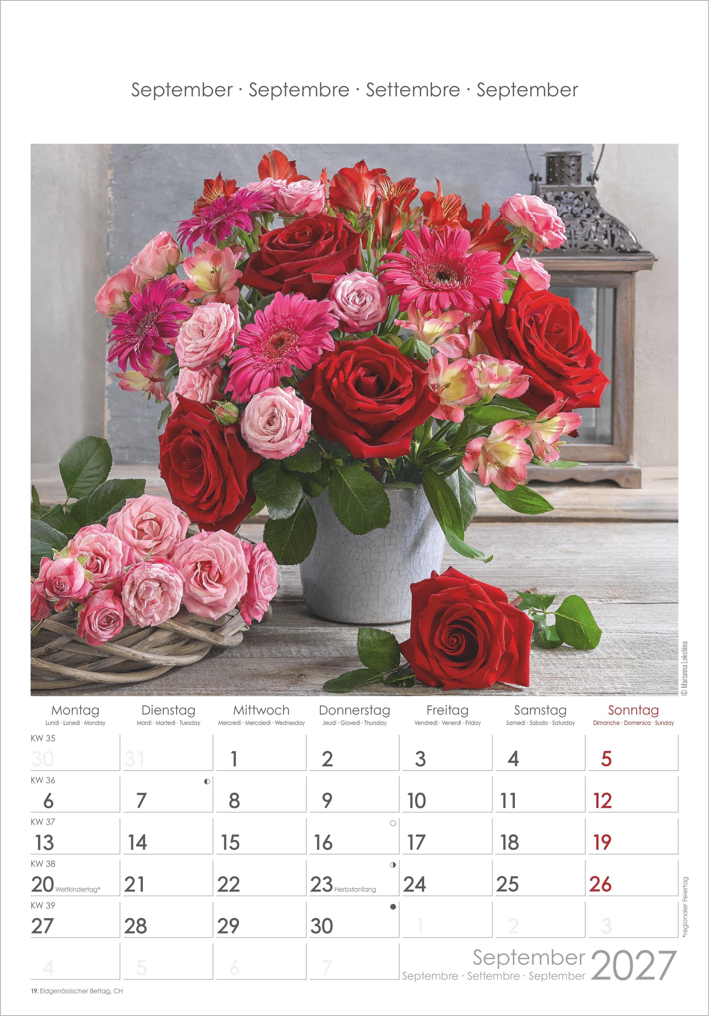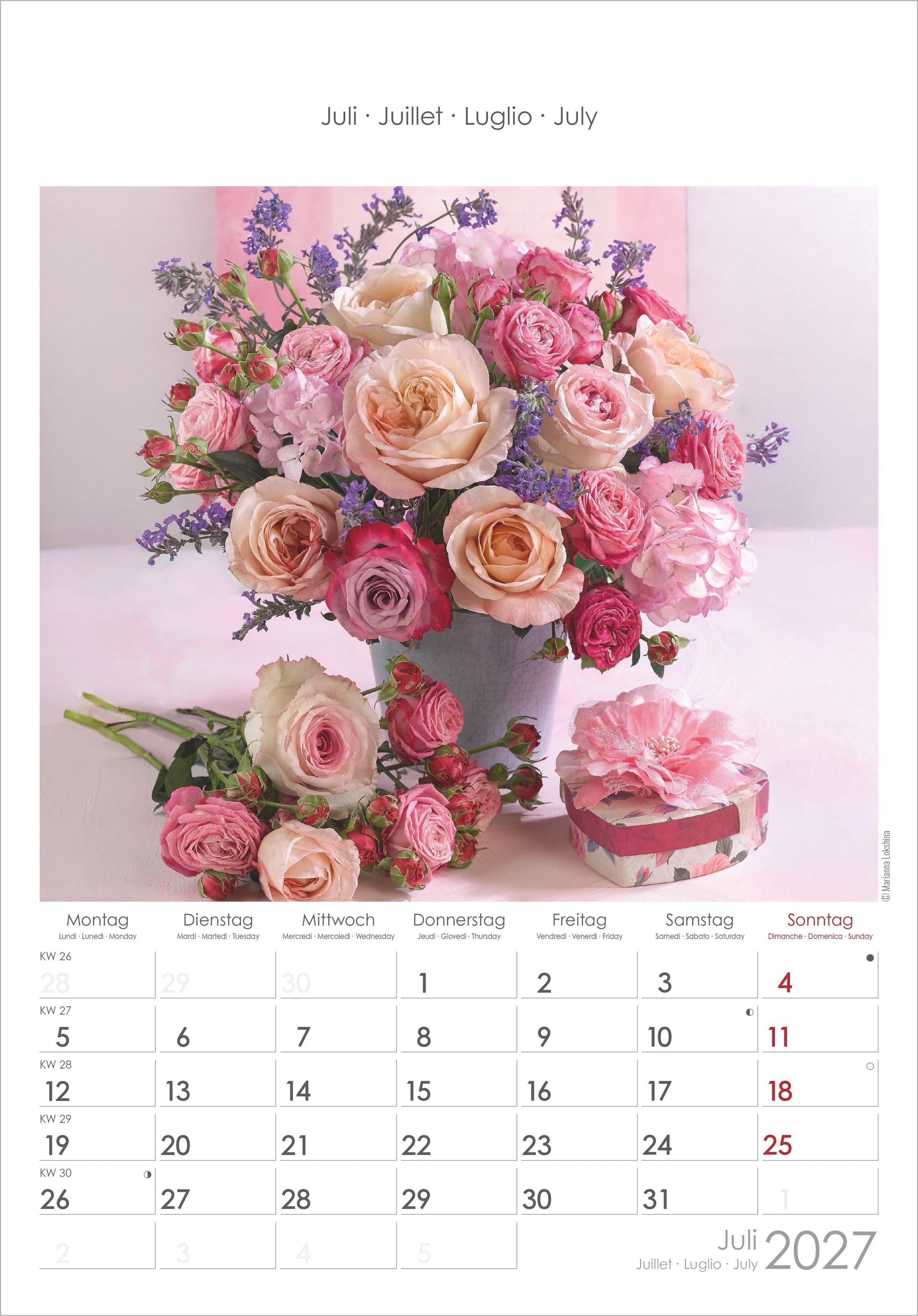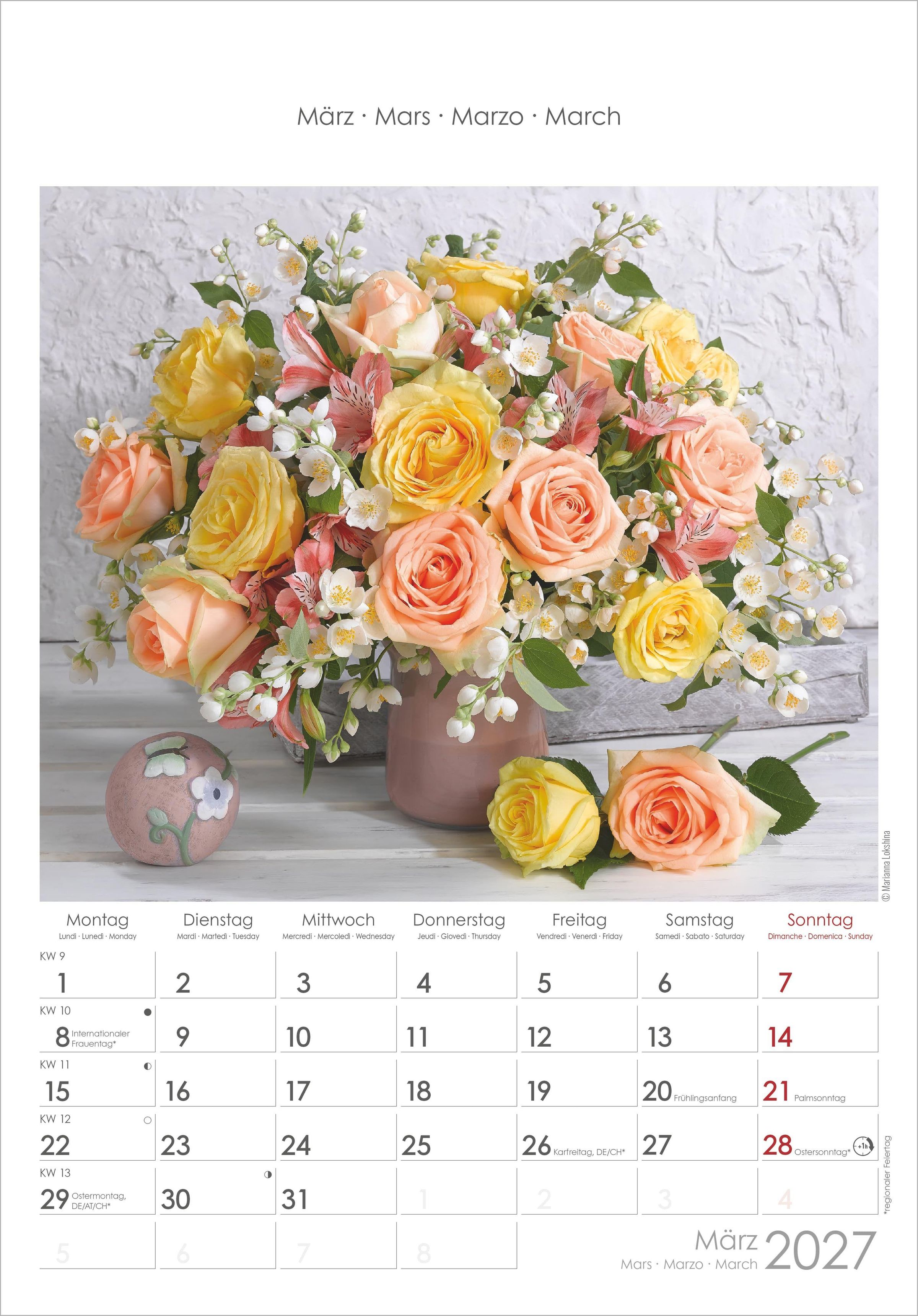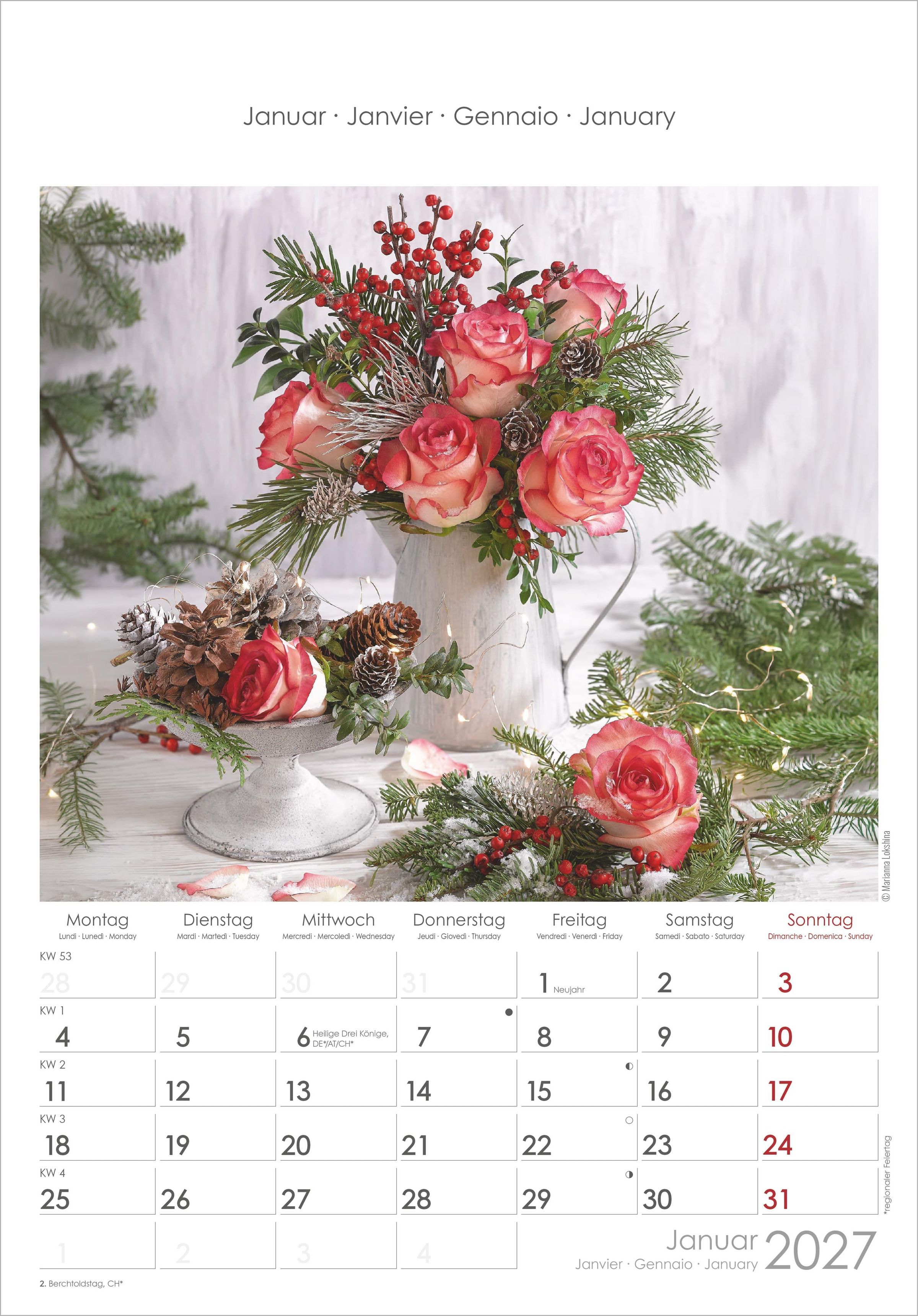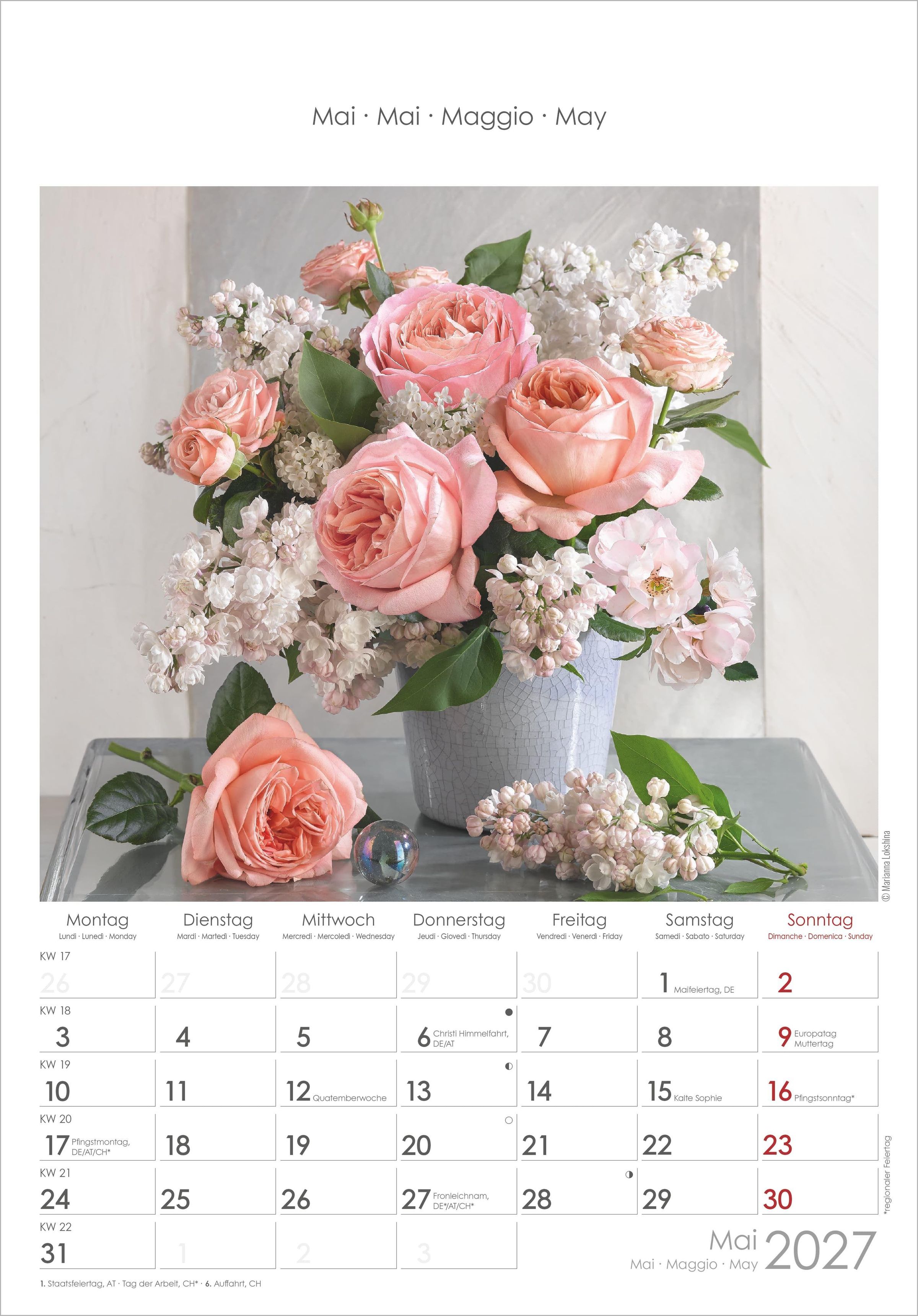 Im Format 23, 7 x 34 cm kommen die detailreichen Blumenmotive auf hochwertigem 150 g / m² Bilderdruckpapier besonders schön zur Geltung. Das übersichtliche, 4-sprachige Kalendarium bietet nicht nur Platz für persönliche Notizen, sondern enthält auch viele nützliche Zusatzinformationen wie Feiertage, Mondphasen und Ferientermine (DE/AT/CH). Auf den Rückseiten der Kalenderblätter finden sich weitere praktische Extras, darunter ein Pollenflugkalender, ein 100-jähriger Kalender sowie Jahresübersichten für 2027 und 2028.