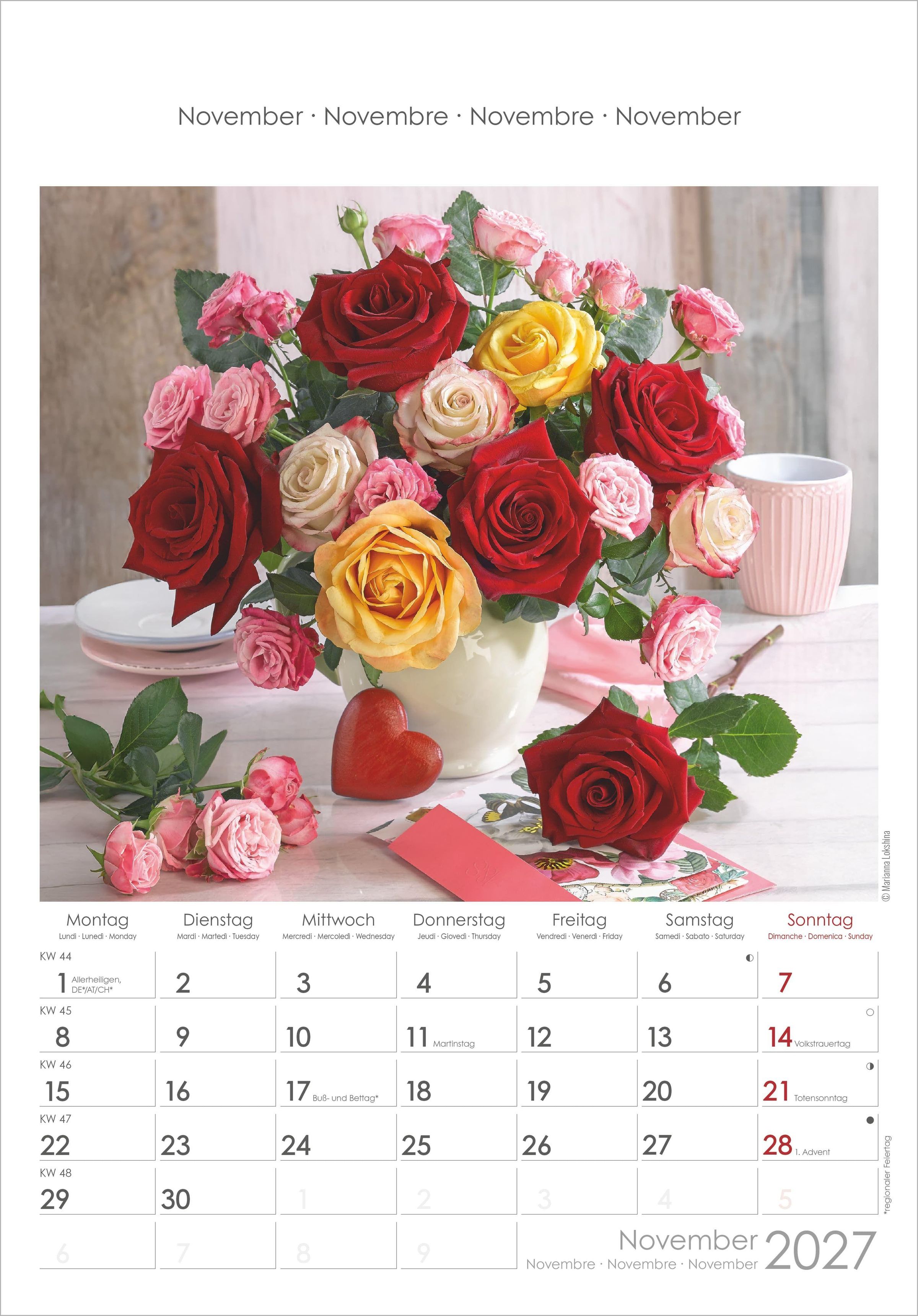 Ein Kalender, der Rosenliebhaber das ganze Jahr über mit floraler Schönheit und praktischen Alltagshelfern erfreut.