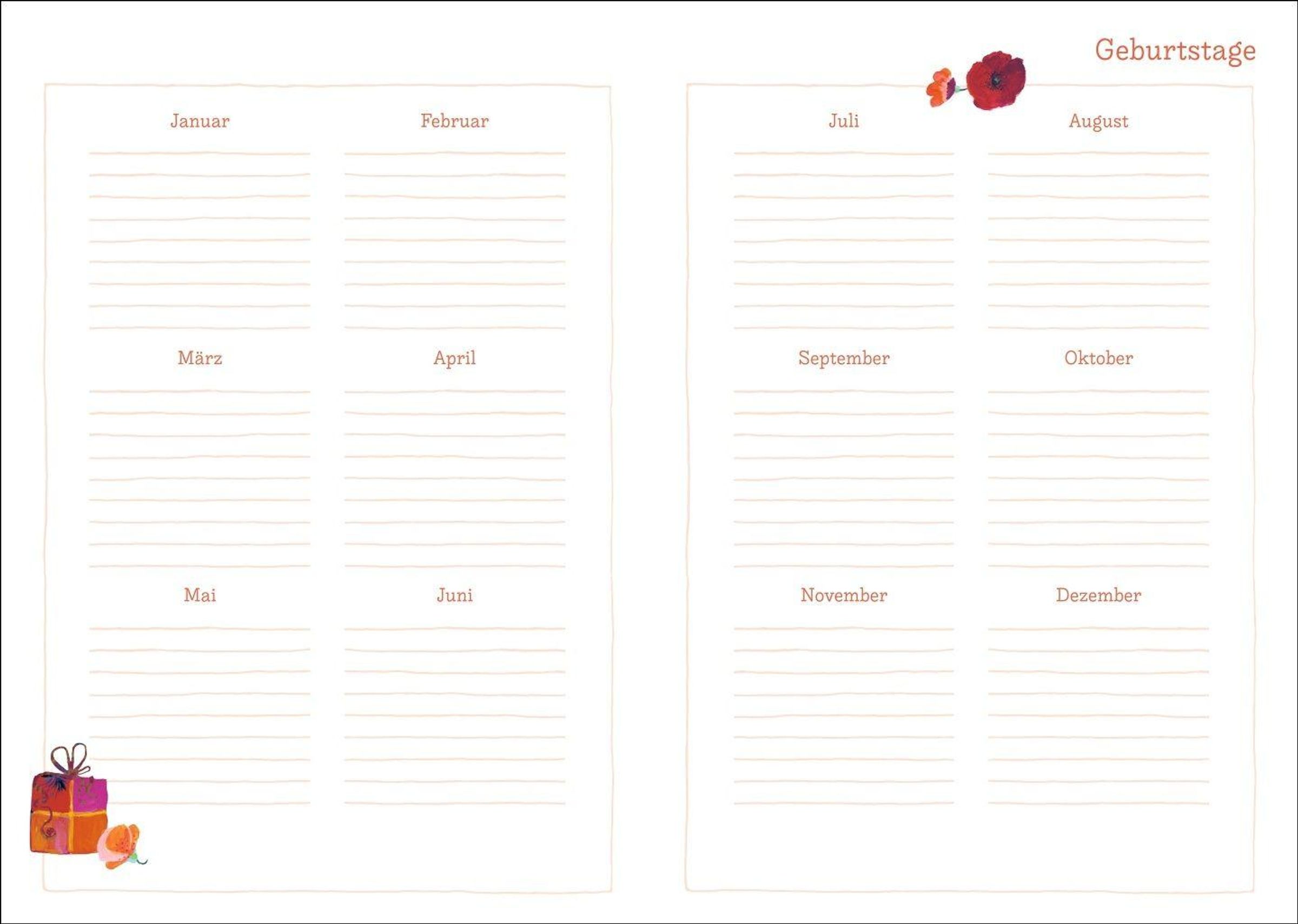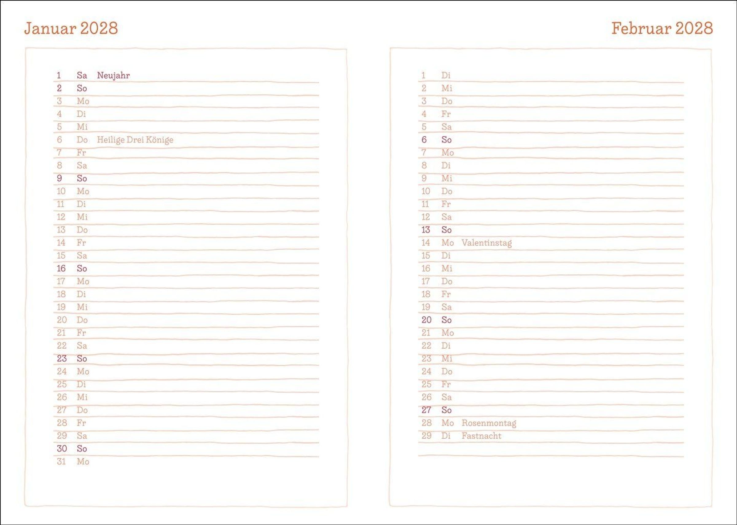 Buchkalender im handlichen Format 11, 5 x 16, 3 cm: eine ganzseitige Zeichnung pro Monat, kleine Schmuckvignetten und viel Platz für Notizen