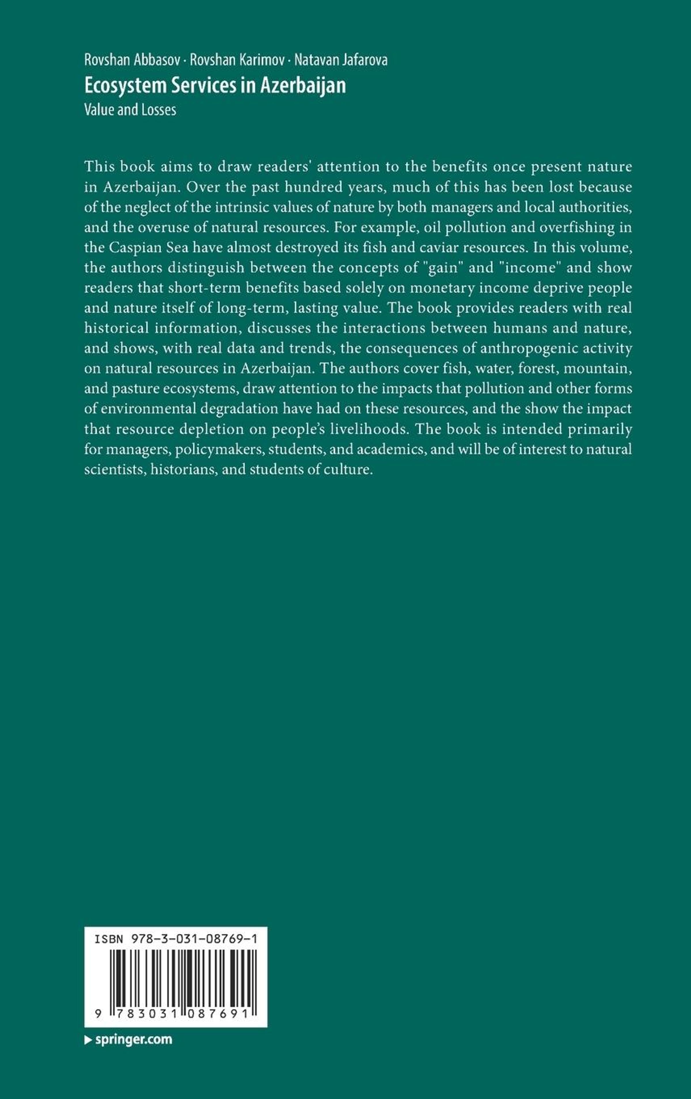 Chapter1. Caspian Sea and its values in Azerbaijan.- Chapter2. Mountain ecosystem values.- Chapter3. Value of the clean water in Azerbaijan.- Chapter4. Environmental migration and cultural losses.