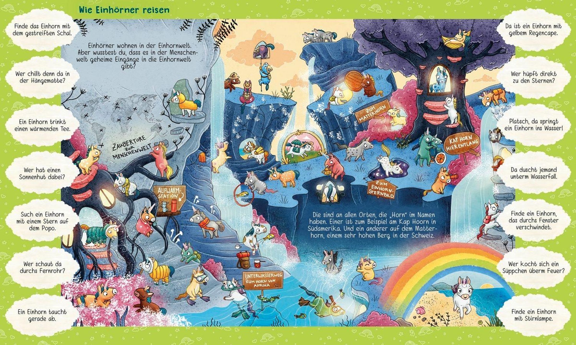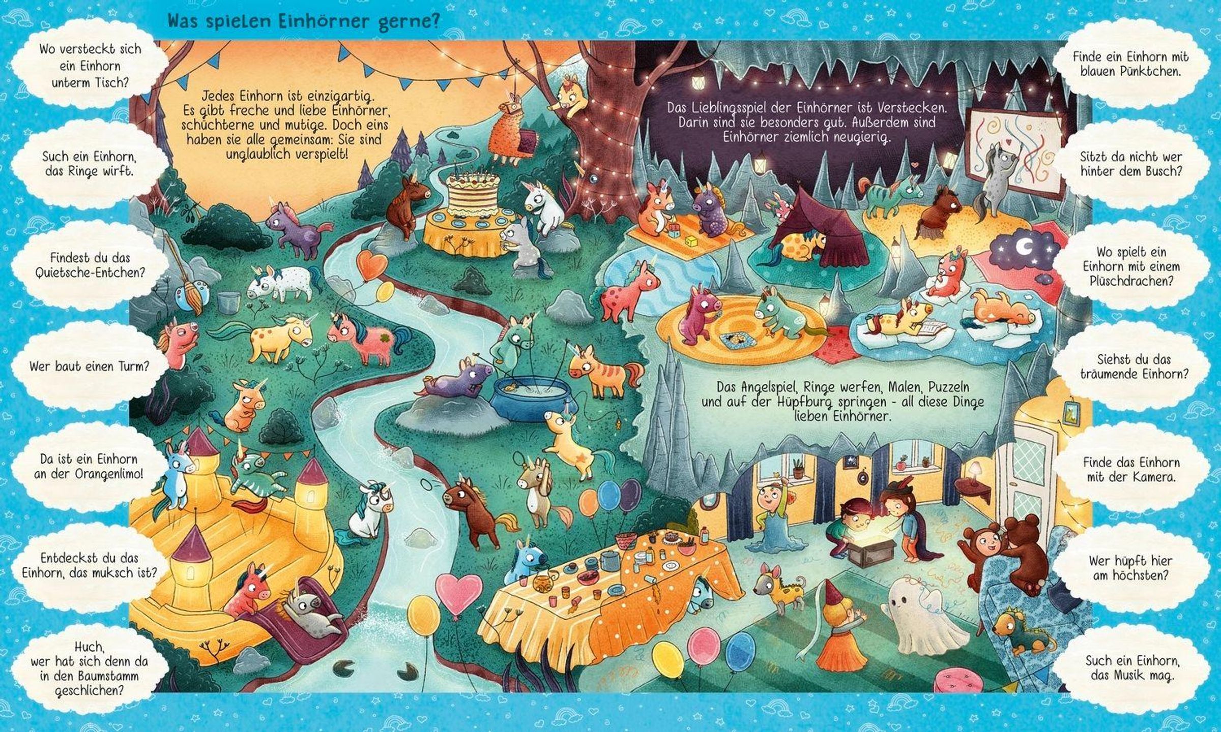Willkommen in der fabelhaften Welt der Einhörner! Auf jeder Seite wuseln und flitzen kleine, große, schlafende, spielende, futternde und tanzende Einhörner durchs Bild. Wer findet das Einhorn beim Ringewerfen? Das Hörnchen mit dem Kleeblatt am Popo? Oder das auf der Hüpfburg? Dieses zauberhaft gestaltete Pappbuch lädt Einhorn-Fans ab 2 Jahren ein, auf jeder Seite immer noch mehr fantastische Dinge zu entdecken. Spielerisches Suchen fördert dabei ganz nebenbei Konzentration und Sprache - und macht einfach riesigen Spaß. Für alle, die von "101 Einhörner" nicht genug bekommen können!