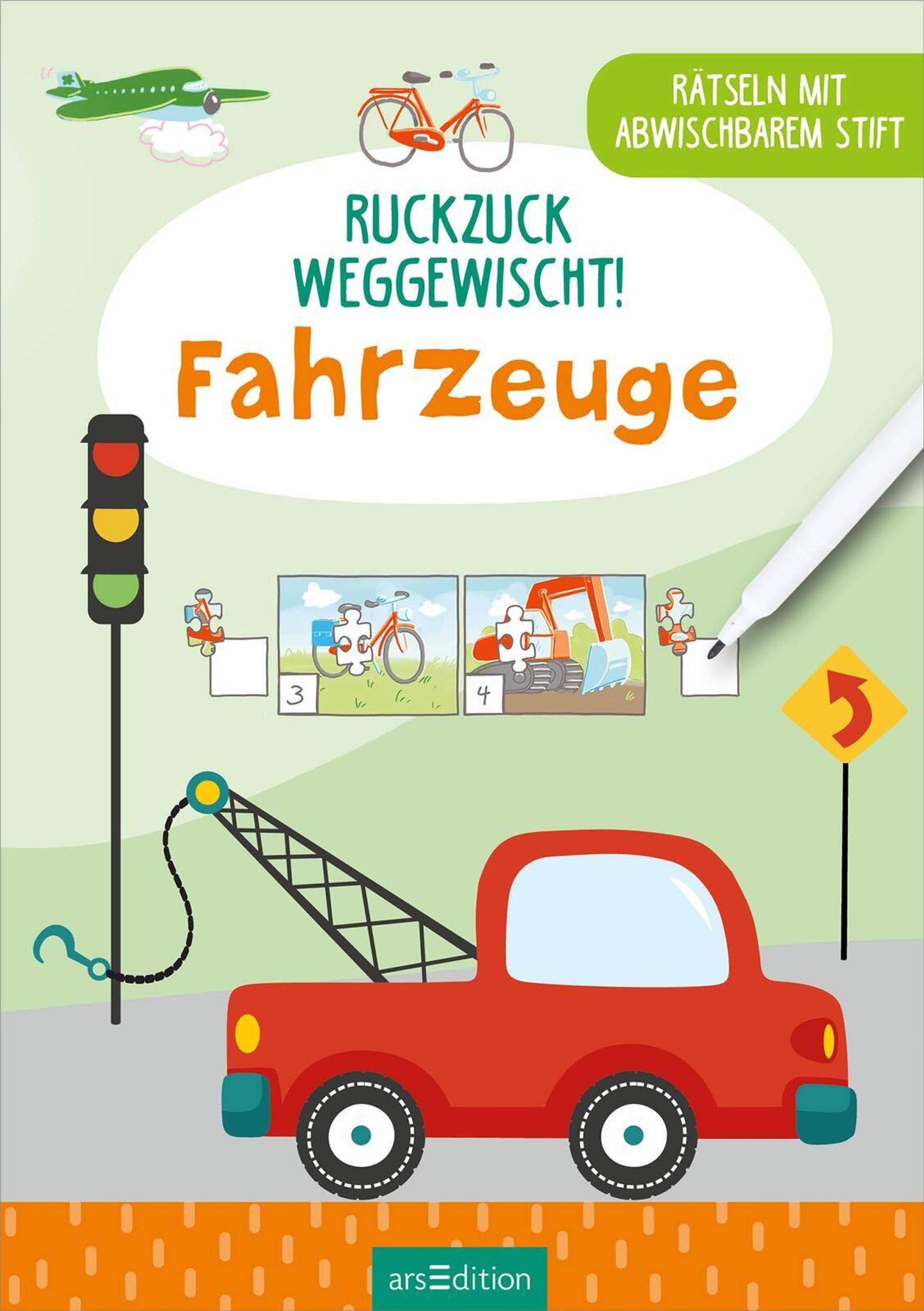 Dem Heft liegt ein abwischbarer Stift bei, mit dem die Kinder die netten Rätsel rund um Polizeitauto, Lkw & Co. immer wieder neu lösen können. Ist eine Lösung falsch, lässt sich die Tinte ganz ohne Wasser oder Reinigungsmittel nur mit einem Taschentuch entfernen - einfach ruckzuck weggewischt!