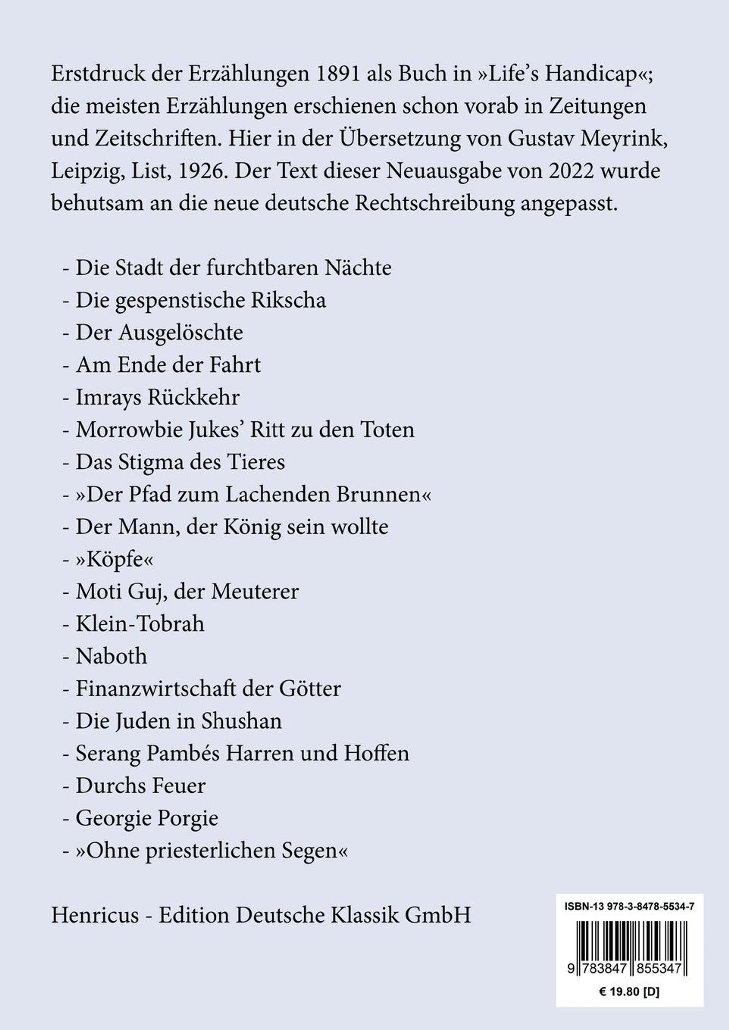 Erstdruck der Erzählungen als Buch in >>Life's Handicap<<, 1891, wobei die meisten Erzählungen schon in Zeitungen und Zeitschriften vorab erschienen. Hier in der Übersetzung von Gustav Meyrink, Leipzig, List, 1926.