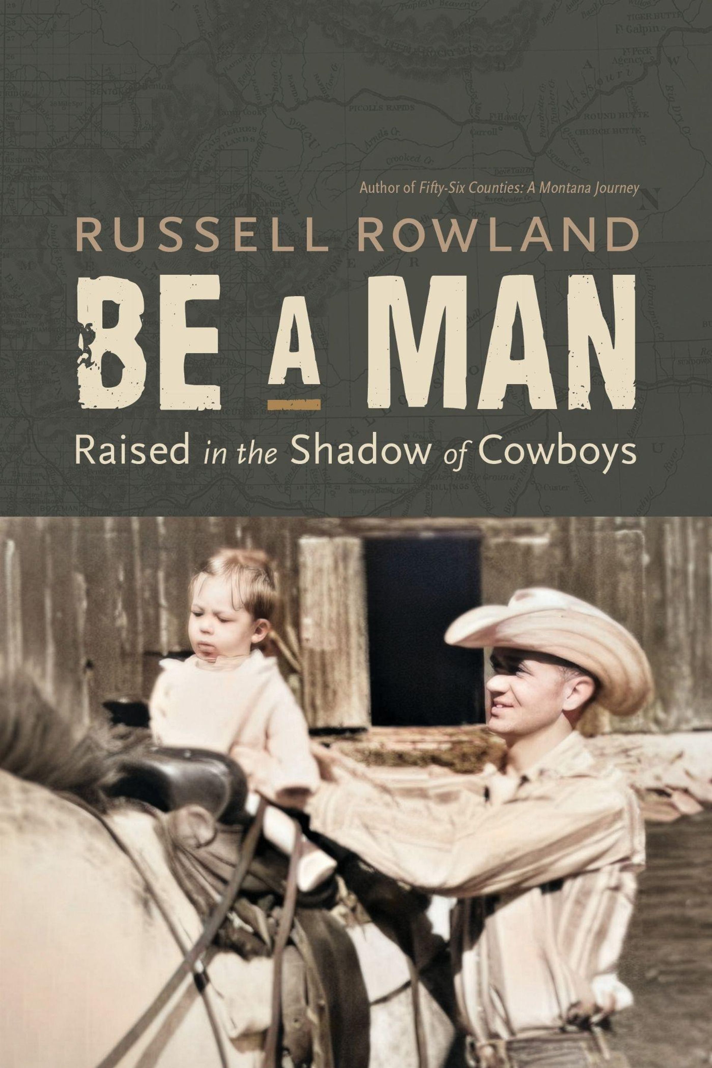 "Russell Rowland, BE A MAN, Raised in the Shadow of Cowboys." Ein Mann hält ein Kind auf einem Pferd vor einem Holzgebäude., Buch