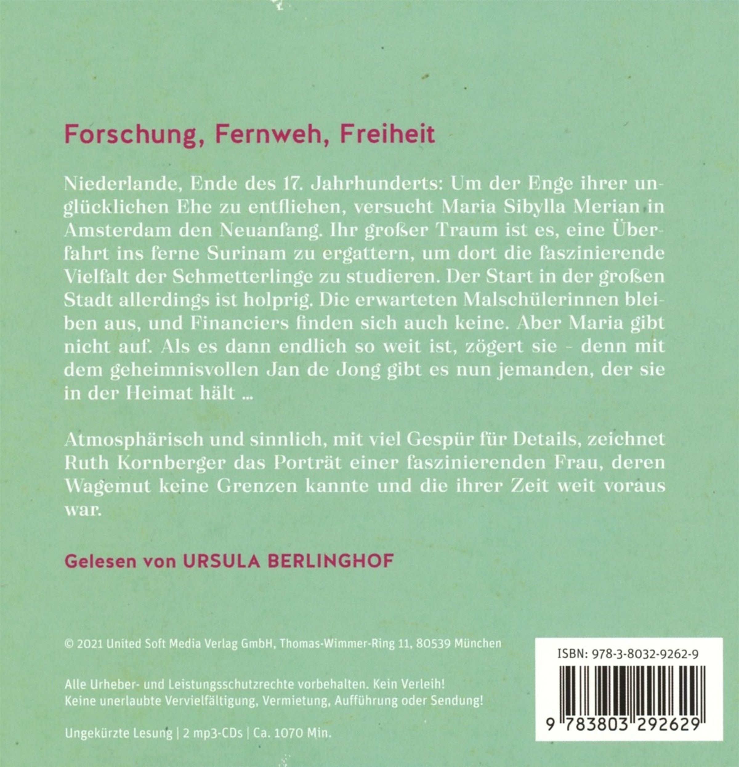 Niederlande, Ende des 17. Jahrhunderts: Um der Enge ihrer unglücklichen Ehe zu entfliehen, versucht die Malerin und Naturforscherin Maria Sibylla Merian in Amsterdam den Neuanfang. Ihr großer Traum ist es, von dort eine Überfahrt ins ferne Surinam zu ergattern, um im tropischen Regenwald die faszinierende Vielfalt der Schmetterlinge zu studieren. Der Start in der großen Stadt allerdings ist holprig. Die erwarteten Malschülerinnen bleiben aus, und Financiers für eine Forschungsreise nach Übersee finden sich auch keine. Aber Maria gibt nicht auf. Hartnäckig rennt sie Türen ein, knüpft Kontakte und bringt ihre ältere Tochter unter die Haube. Doch als es endlich so weit ist, zögert sie - denn mit dem geheimnisvollen Jan de Jong, der immer wieder ihren Weg kreuzt, gibt es nun jemanden, der sie in der Heimat hält ... Atmosphärisch und sinnlich, mit viel Gespür für Details, zeichnet Ruth Kornberger ein Portrait der Künstlerin und Forscherin Maria Sibylla Merian - einer faszinierenden Frau, deren Wagemut keine Grenzen kannte und die ihrer Zeit weit voraus war.