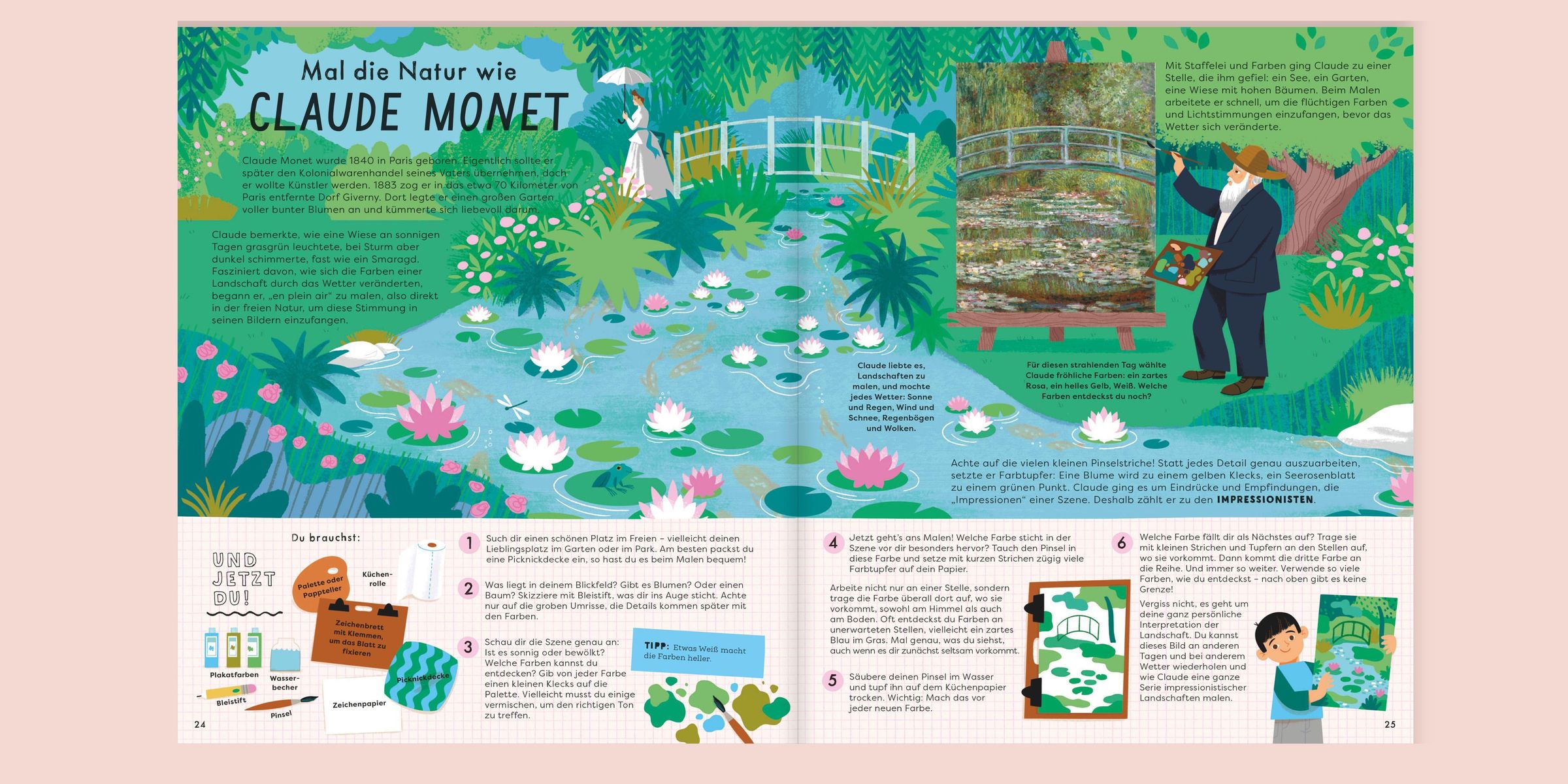 Warum war Claude Monet so fasziniert von seinem Garten? Was träumte Salvador Dalí? Wie kreiert Bridget Riley ihre optischen Täuschungen? Und was unterscheidet Impressionismus von Pop-Art oder Street-Art von Skulptur? Dieses Buch macht neugierig, erklärt anschaulich und motiviert zum Ausprobieren. Von der Steinzeit bis zur Gegenwart stellt es fundiert und kindgerecht bedeutende Künstler: innen und ihre Meisterwerke vor und macht anhand von Fotos echter Kunstwerke mit unterschiedlichen Stilen und Medien bekannt. Zu jeder Künstler: in gehört eine passende Mitmachaufgabe, die mit leicht erhältlichen Materialien, klaren Anleitungen und unkomplizierten Techniken einfach umzusetzen ist. Ob Farben mischen wie eine Höhlenmalerin, Collagen schneiden wie Henri Matisse oder sich unsichtbar machen wie Liu Bolin -- hier heißt es: direkt loslegen!