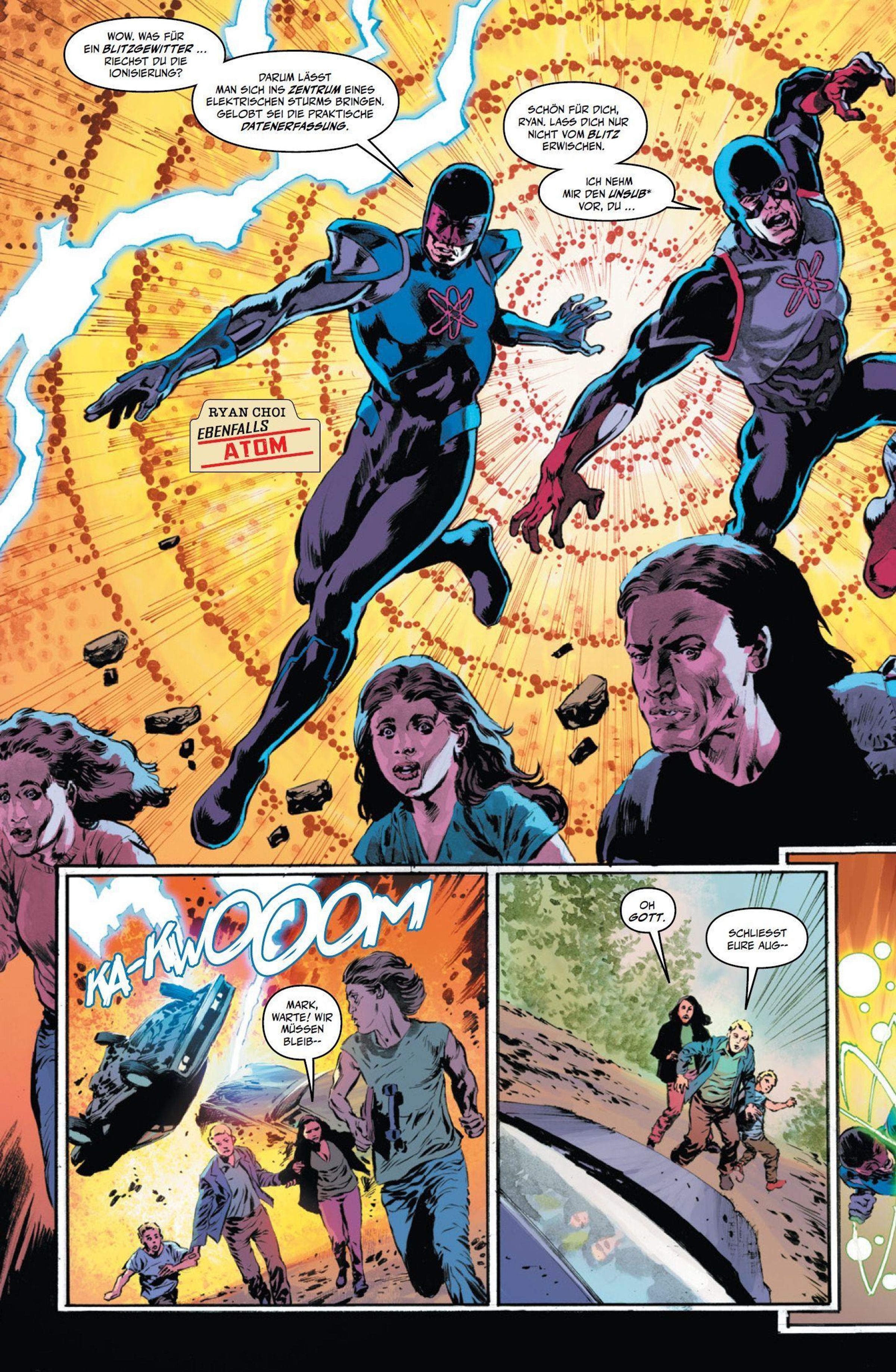 DIE ATOMARE SUPERWAFFE! Die Justice League Unlimited beschützt vom Wachturm im Orbit aus die gesamte Erde. Alle Superhelden des Planeten sind eingeladen, in diesem Superteam mitzuwirken - doch einige sind dazu nicht in der Lage! Denn noch immer sind nach Absolute Power viele Superhelden ohne ihre Kräfte, ein Problem, dem sich zwei Genies der Liga widmen: Ray Palmer und Ryan Choi, die beide unter dem Namen Atom bekannt sind und sich auf subatomare Größe schrumpfen können.