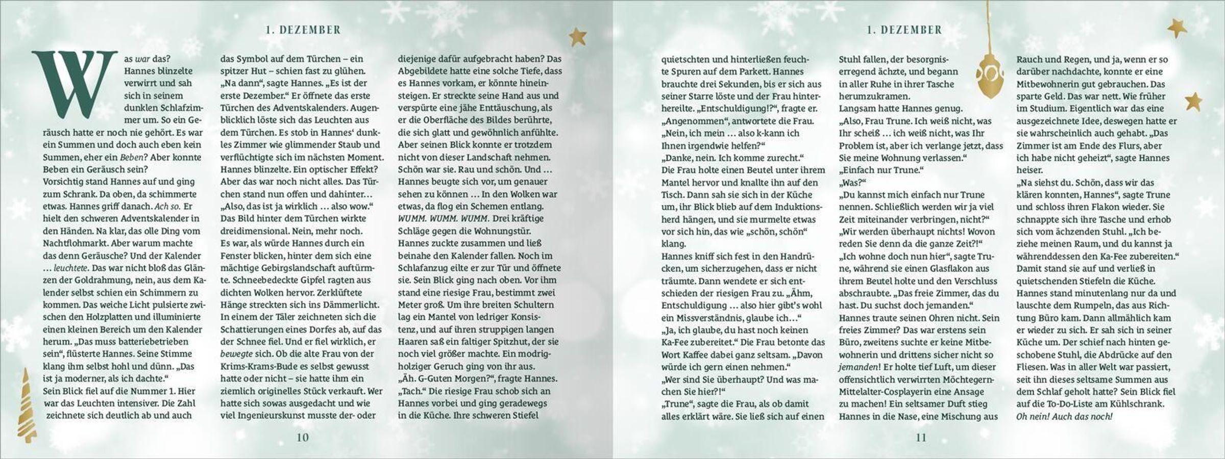 Hannes liebt Ordnung, Listen und Routinen - bis ihm auf einem Nachtflohmarkt ein uralter Adventskalender in die Hände fällt, der sein Leben auf den Kopf stellt. Plötzlich wachsen in seiner Kleinstadt geheimnisvolle Mauern, Dinge verändern sich auf unerklärliche Weise und seine neue Mitbewohnerin scheint aus einer anderen Welt zu stammen. Jeden Tag im Advent öffnet Hannes ein Türchen - und mit jedem Türchen wird seine Welt ein bisschen verrückter, magischer und herausfordernder. Denn gemeinsam mit seinem chaotischen Nachbarn Davy muss er nicht nur das magische Durcheinander beseitigen, sondern auch den Mut finden, seinem Herzen zu folgen.