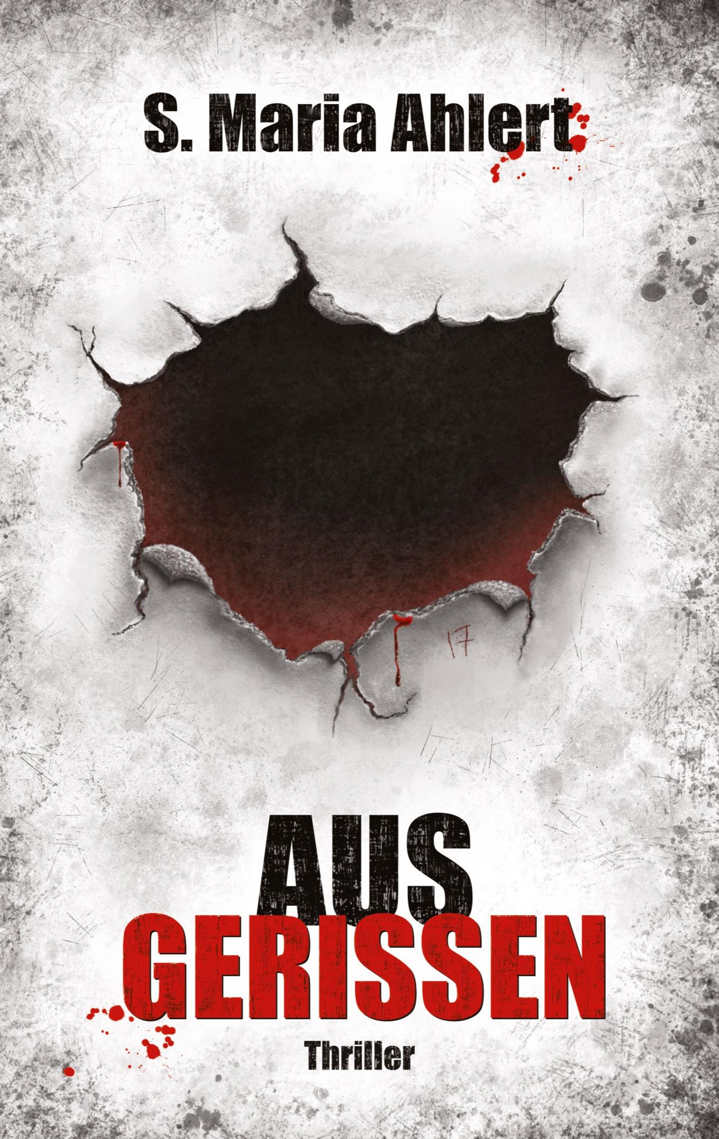 Text: "S. Maria Ahlert", "AUS GERISSEN", "Thriller". Zerrissenes Papier; darunter rotes, blutartiges Element., Buch