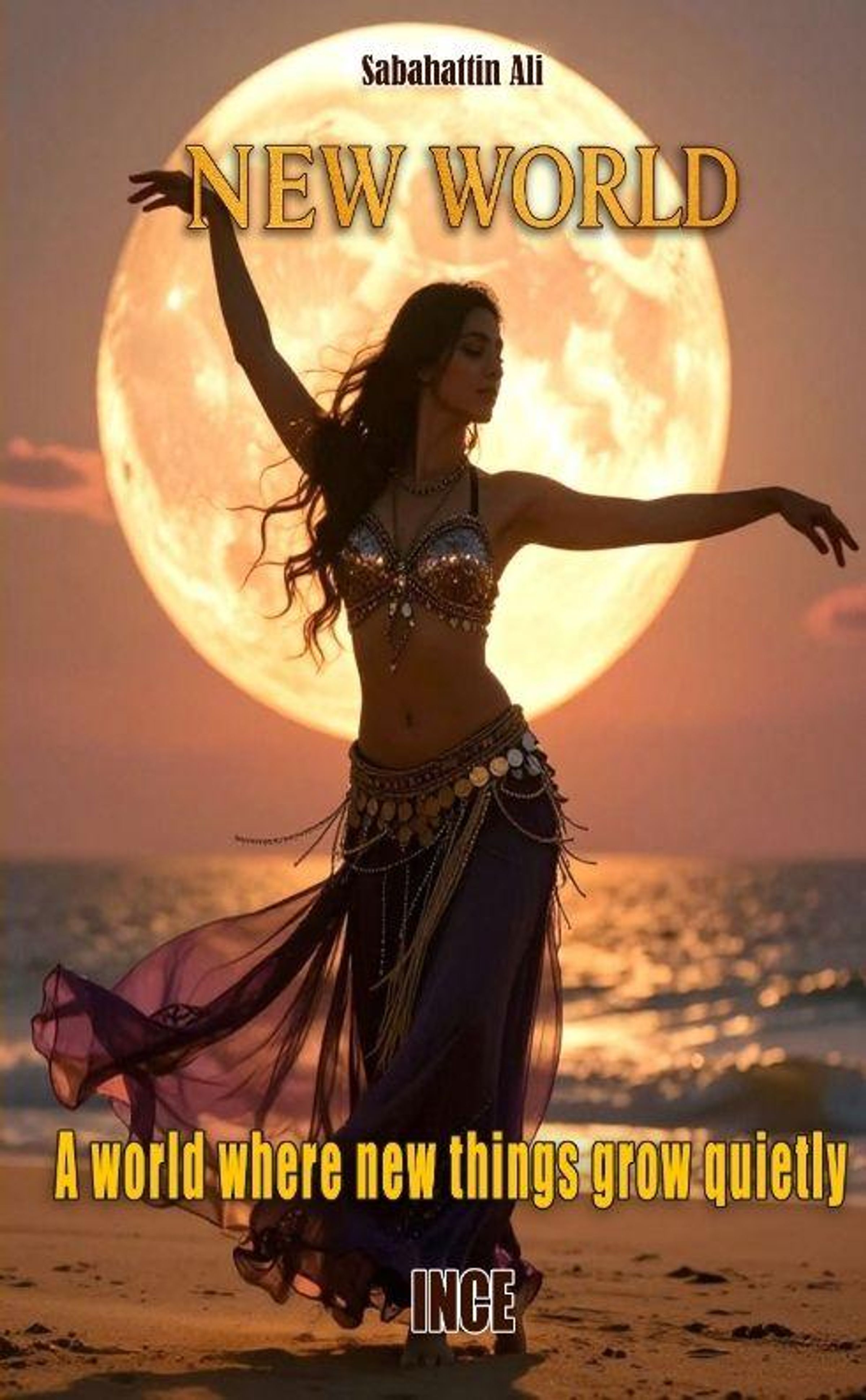 "NEW WORLD" und "A world where new things grow quietly" über Tänzerin vor großem Mond am Strand., Buch