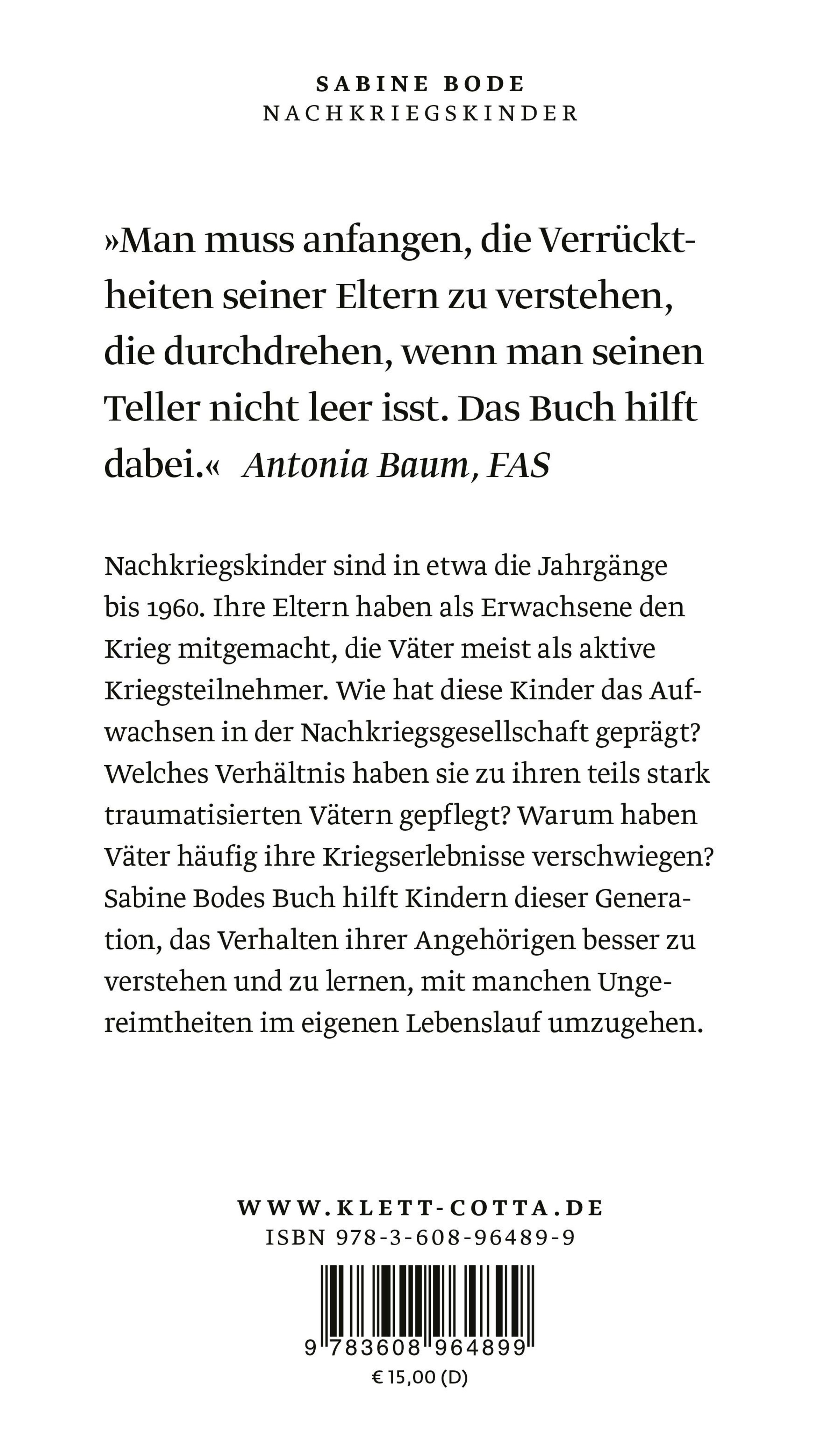 Nachkriegskinder sind in etwa die Jahrgänge bis 1960. Ihre Eltern haben als Erwachsene den Krieg mitgemacht, die Väter meist als aktive Kriegsteilnehmer. Wie hat diese Kinder das Aufwachsen in der Nachkriegsgesellschaft geprägt? Welches Verhältnis haben sie zu ihren teils stark traumatisierten Vätern gepflegt? Warum haben Väter häufig ihre Kriegserlebnisse verschwiegen? Sabine Bodes Buch hilft Kindern dieser Generation, das Verhalten ihrer Angehörigen besser zu verstehen und zu lernen, mit manchen Ungereimtheiten im eigenen Lebenslauf umzugehen.