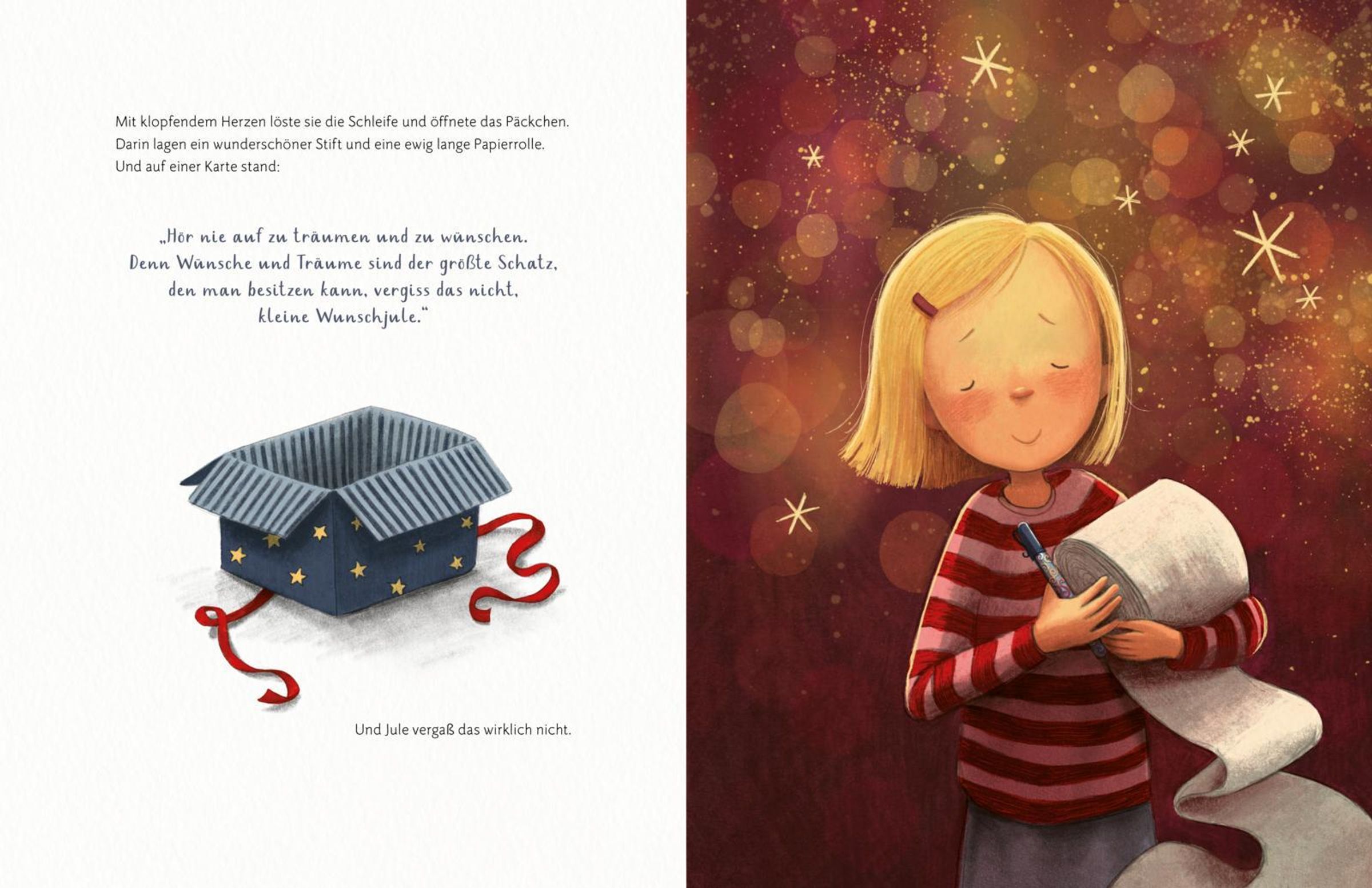 Jule hat viele Wünsche und sie liebt es, sie vor Weihnachten aufzuschreiben. In diesem Jahr ist ihr Wunschzettel so lang, dass ihr der Weihnachtsmann nur ein Geschenk bringt: einen Zauberstab, mit dem sie sich ihre Wünsche selbst erfüllen kann. Jule wünscht und wünscht. Doch je mehr Spielsachen sich um sie herum auftürmen, desto weniger Freude machen sie ihr. Schließlich begreift Jule, dass der wahre Schatz nicht im Besitzen liegt, sondern im Wünschen selbst ...