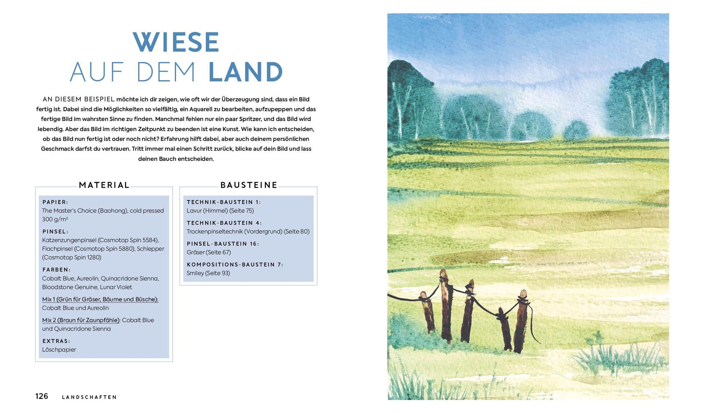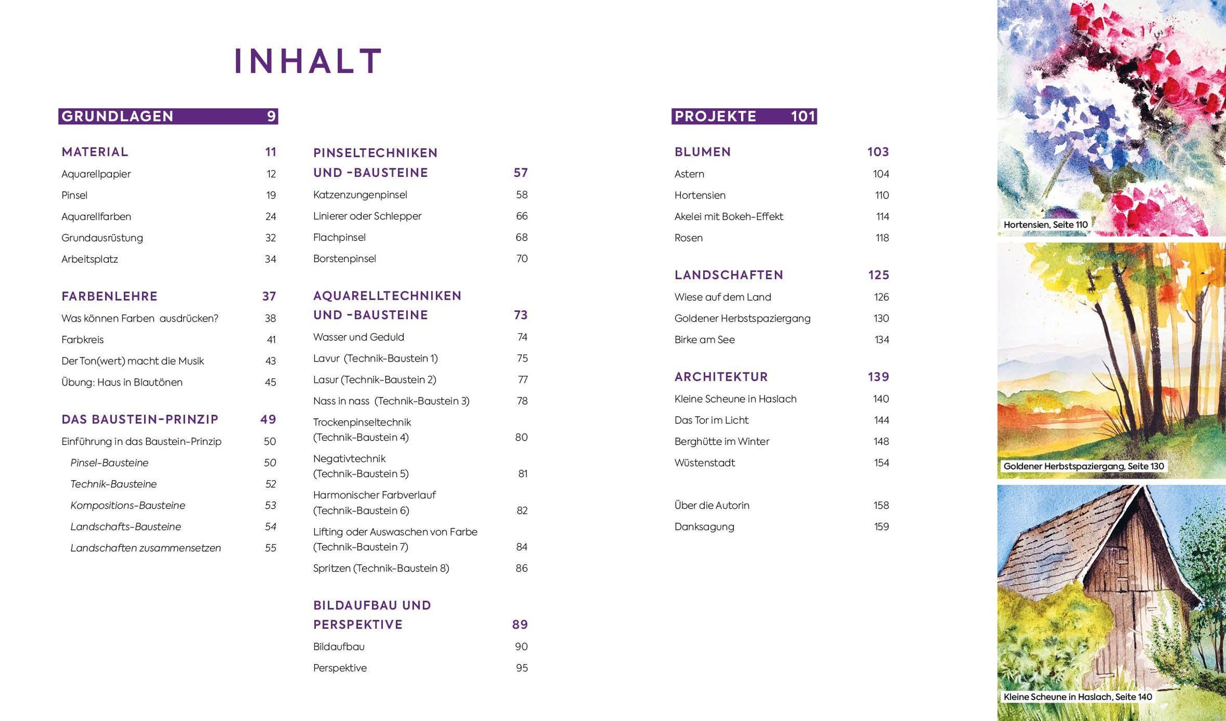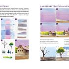 Titel: "Aquarell leicht gemacht". Bunte Illustrationen: eine Blume, ein Baum, Landschaften mit Hütten., Buch