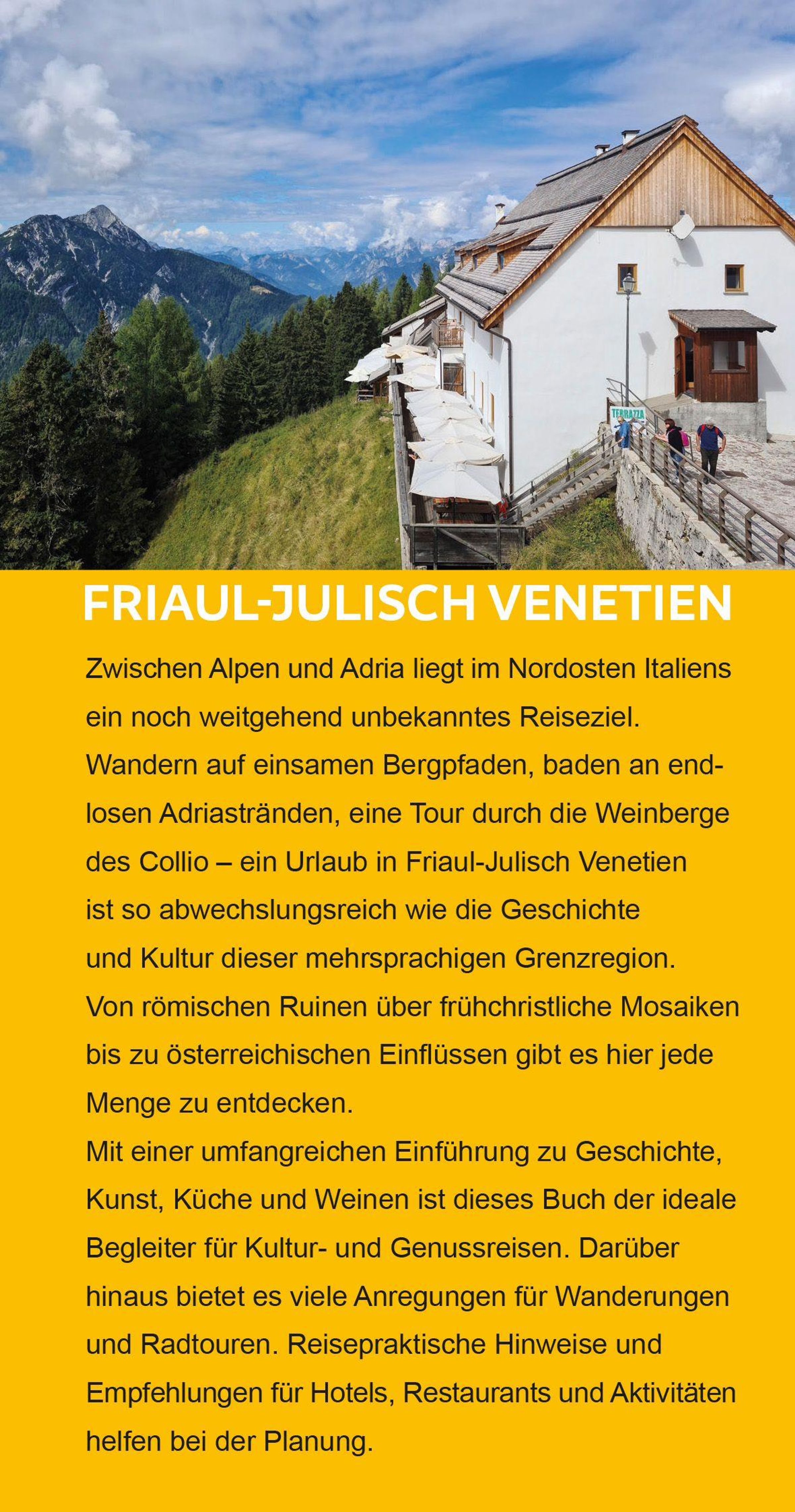 Der Trescher-Reiseführer FRIAUL-JULISCH VENETIEN begleitet kompetent durch den facettenreichen Landstrich, stellt die schönsten Orte und Sehenswürdigkeiten vor und bietet viele Anregungen für Wanderungen und Radtouren. Eine umfangreiche Einführung macht mit Geschichte, Natur, Kultur und Küche bekannt. Ausflüge ins nahe Slowenien, Empfehlungen für Hotels und Restaurants, ein kleiner Sprachführer und zahlreiche praktische Reisetipps komplettieren das Buch zum idealen Begleiter für Genießer, Kunstfreunde und Aktivurlauber unterwegs im Nordosten Italiens.