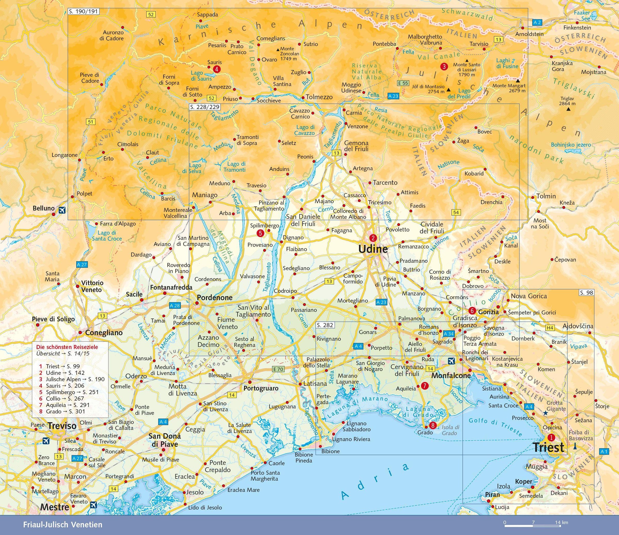 Im Norden laden die Felstürme der Karnischen und Julischen Alpen mit ihren urigen Bergdörfern zum Klettern und Wandern ein. Ein Paradies für alle, die Ursprünglichkeit und Entschleunigung suchen. Weiter südlich schmückt sich die friulanische Tiefebene mit Obst- und Weingärten. Charmante Städtchen, mittelalterliche Burgen, langobardische und venezianische Kunstschätze begeistern Kunst- und Kulturinteressierte. Genießer schwärmen vom Schinken aus San Daniele, dem strohgelben Montasiokäse und den Weißweinen, die im Weinbaugebiet Collio gekeltert werden. Badeurlauber kommen an den kilometerlangen feinsandigen Adriastränden auf ihre Kosten.