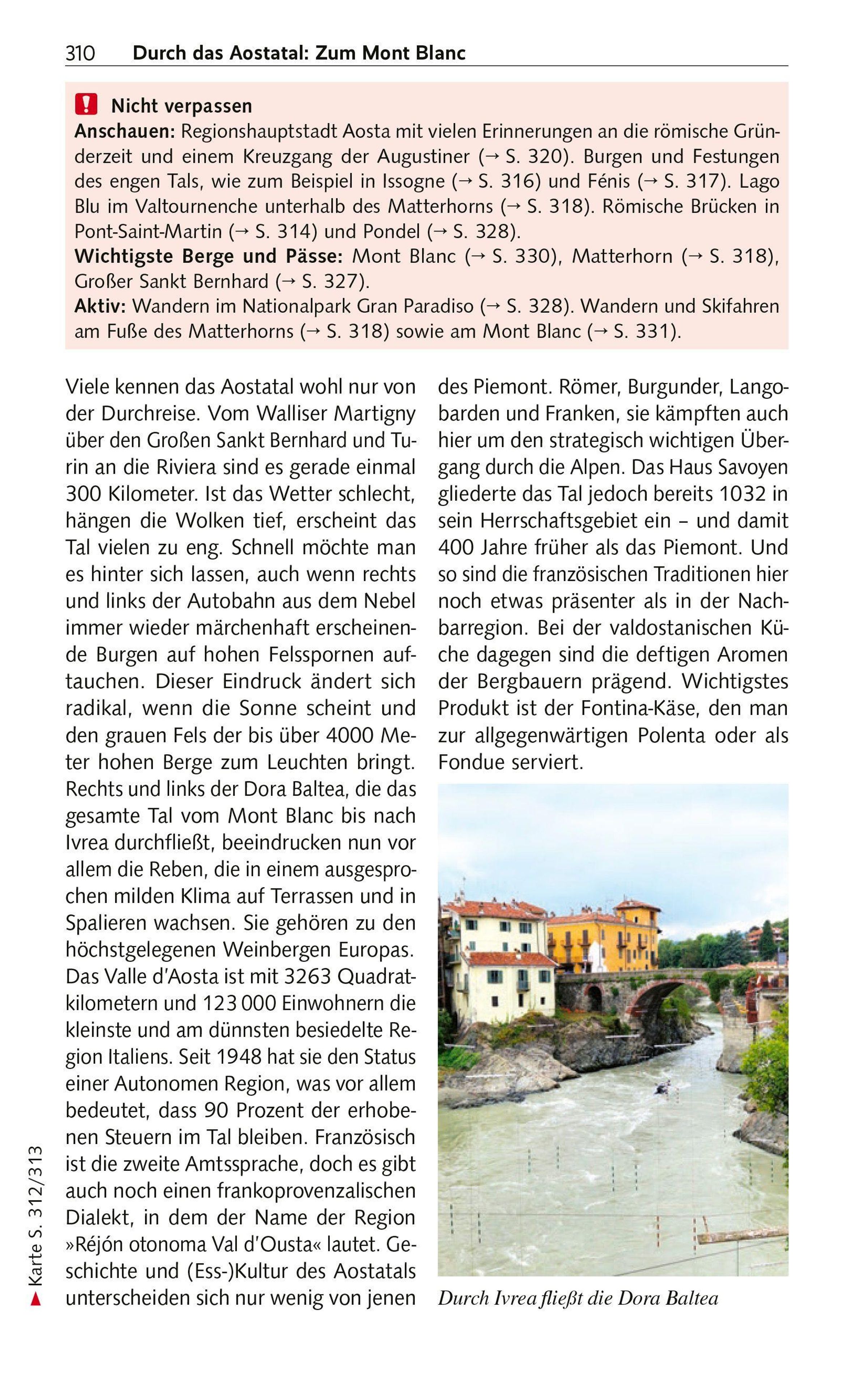 Auf drei Seiten umrahmen die Alpen das "Land am Fuß der Berge". Wandern in den einsamen Tälern rund um den 3841 Meter hohen Monviso oder im Nationalpark Val Grande zählt zu den eindrucksvollen Erlebnissen. Während Skisportler im Walsertal Valsesia auf ihre Kosten kommen, warten der Lago Maggiore und Lago d'Orta auf Badeurlauber. Hoch über den Seen steuern nicht nur Pilger die Sakralbauten der sieben Heiligen Berge an, seit 2003 UNESCO-Welterbe. Und auch der Mont Blanc ist nicht weit. Durch das burgenreiche Aostatal und den Nationalpark Gran Paradiso geht es auf einen Abstecher nach Frankreich zur höchsten europäischen Bergspitze.