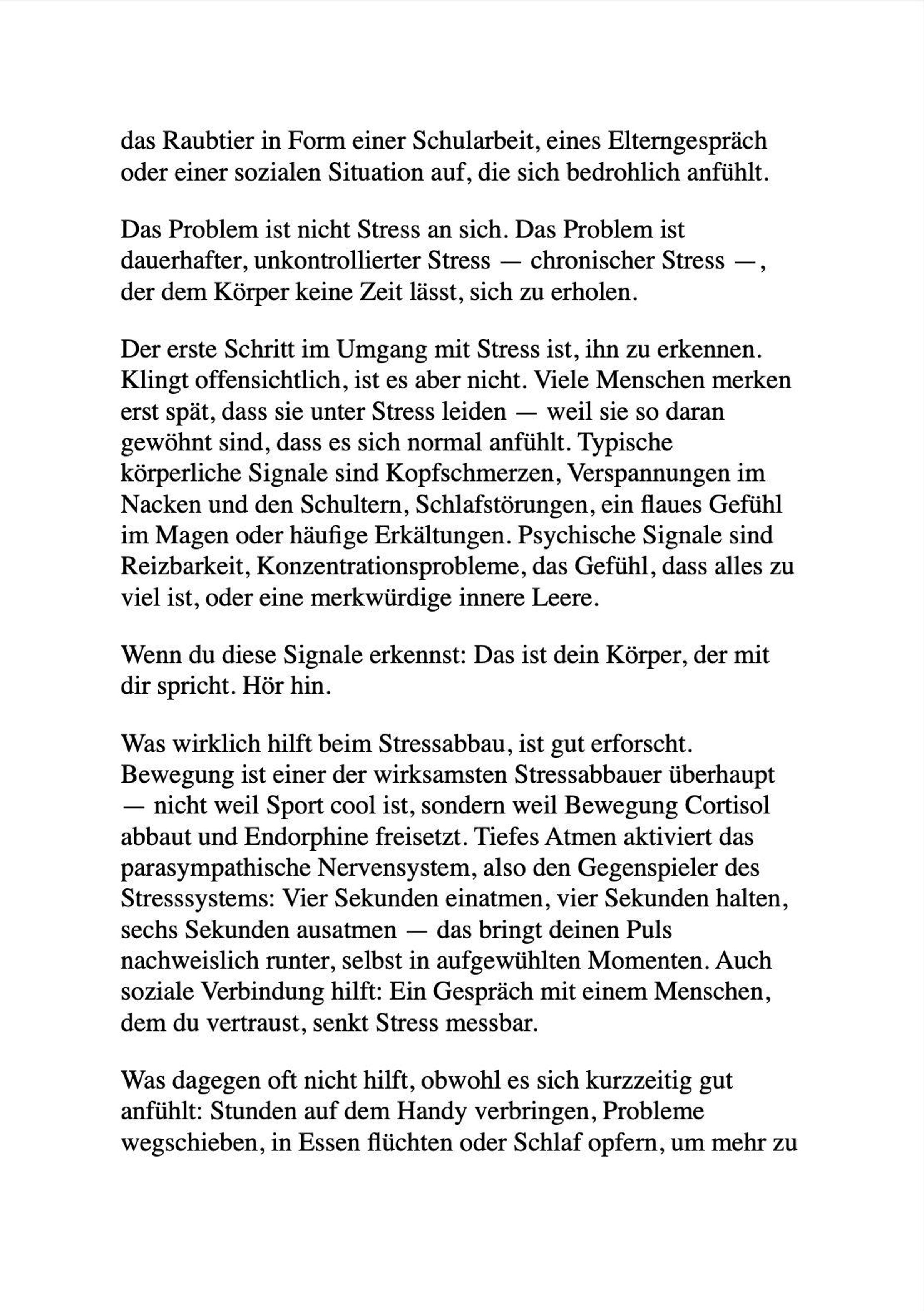 Ihren Körper zu verstehen und gut für ihre Gesundheit zu sorgen Mit Emotionen wie Stress, Unsicherheit, Angst und Druck gesund umzugehen Selbstvertrauen aufzubauen - ohne sich mit anderen vergleichen zu müssen Freundschaften und Beziehungen respektvoll und klar zu gestalten Mit Schule, Geld, Alltag und digitalen Medien bewusst umzugehen Rückschläge zu verarbeiten und daran zu wachsen Eigene Werte zu entwickeln und Entscheidungen selbstbewusst zu treffen
