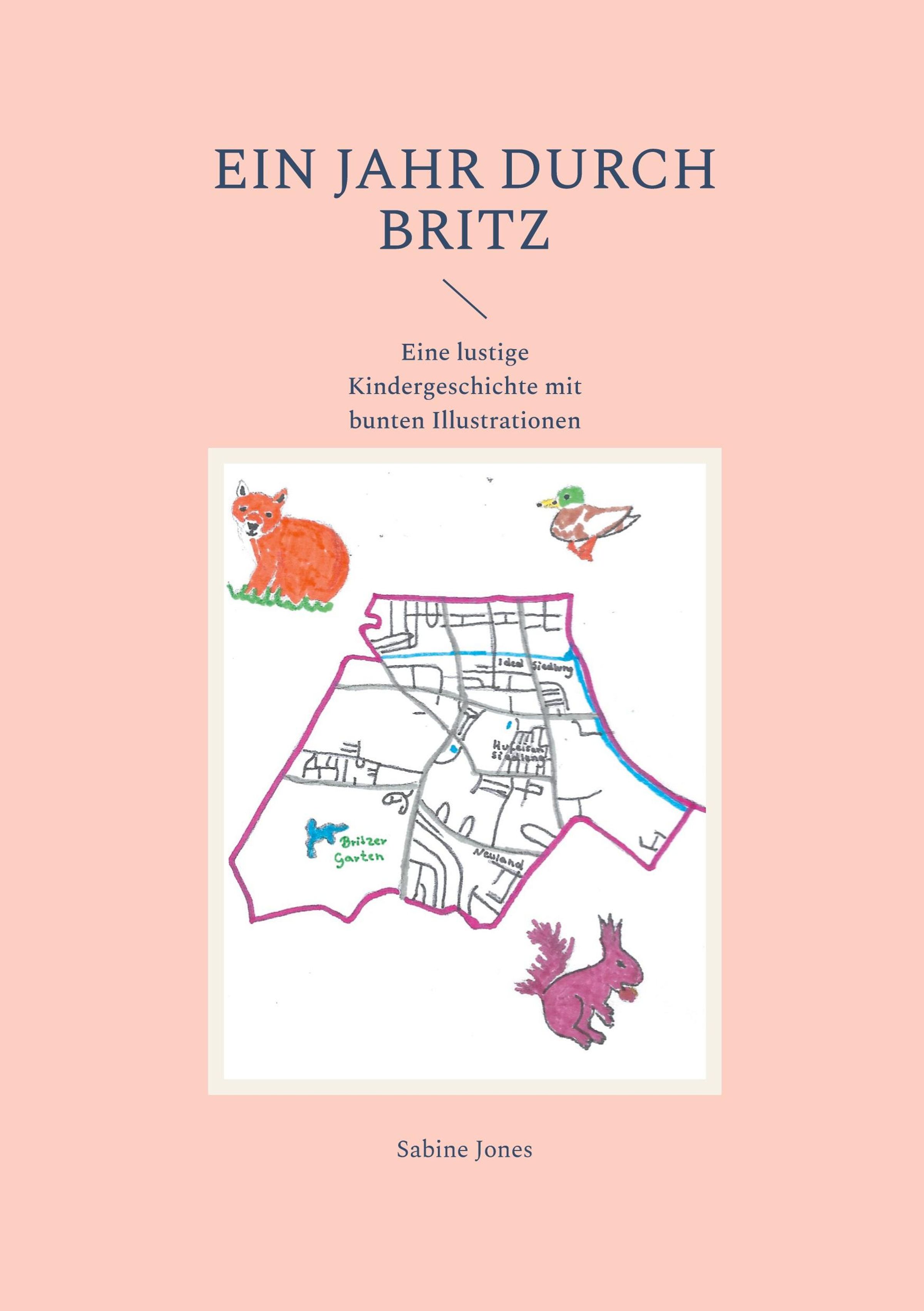 Text: "EIN JAHR DURCH BRITZ", "Eine lustige Kindergeschichte mit bunten Illustrationen", "Britzer Garten", "Sabine Jones". Eine Karte mit Tieren., Buch