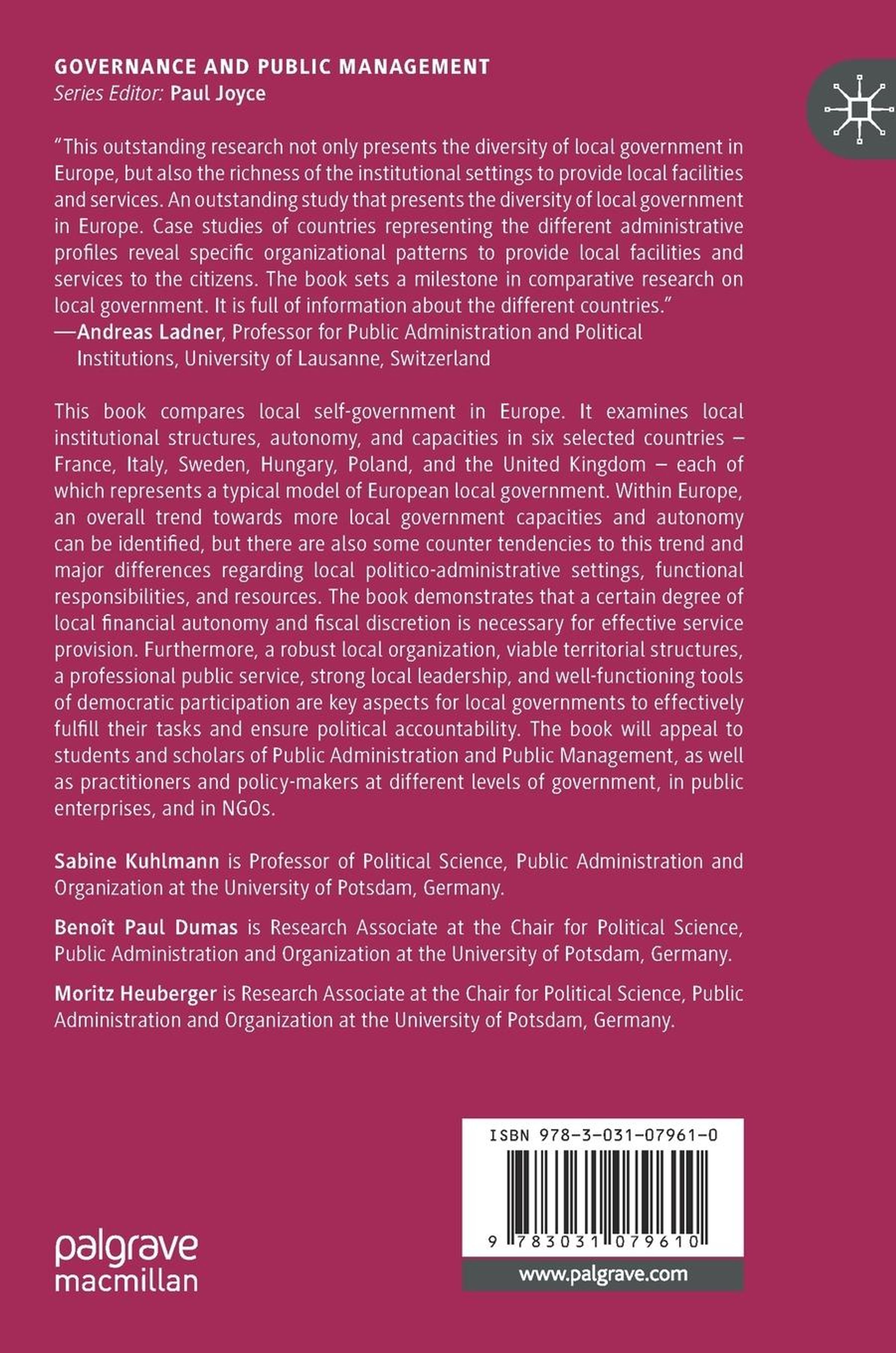 This book compares local self-government in Europe. It examines local institutional structures, autonomy, and capacities in six selected countries - France, Italy, Sweden, Hungary, Poland, and the United Kingdom - each of which represents a typical model of European local government. Within Europe, an overall trend towards more local government capacities and autonomy can be identified, but there are also some counter tendencies to this trend and major differences regarding local politico-administrative settings, functional responsibilities, and resources. The book demonstrates that a certain degree of local financial autonomy and fiscal discretion is necessary for effective service provision. Furthermore, a robust local organization, viable territorial structures, a professional public service, strong local leadership, and well-functioning tools of democratic participation are key aspects for local governments to effectively fulfill their tasks and ensure political accountability. The book will appeal to students and scholars of Public Administration and Public Management, as well as practitioners and policy-makers at different levels of government, in public enterprises, and in NGOs.