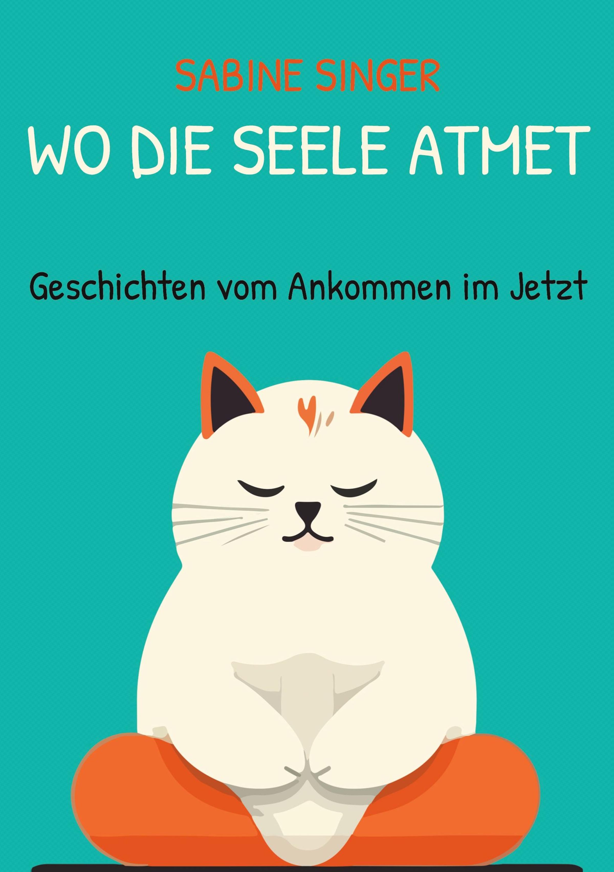 Es steht: "Sabine Singer, Wo die Seele atmet, Geschichten vom Ankommen im Jetzt." Illustration einer meditierenden Katze., Buch