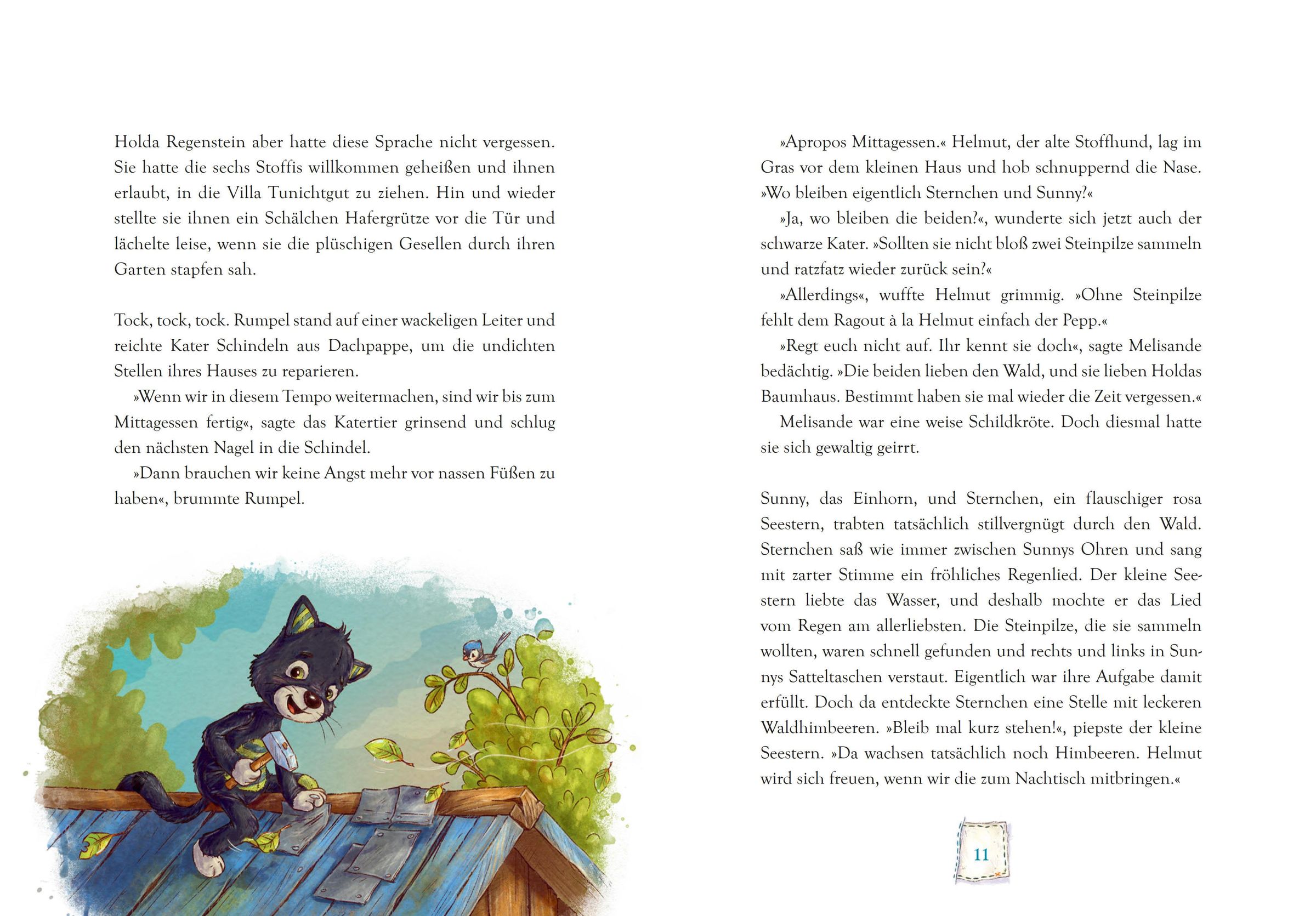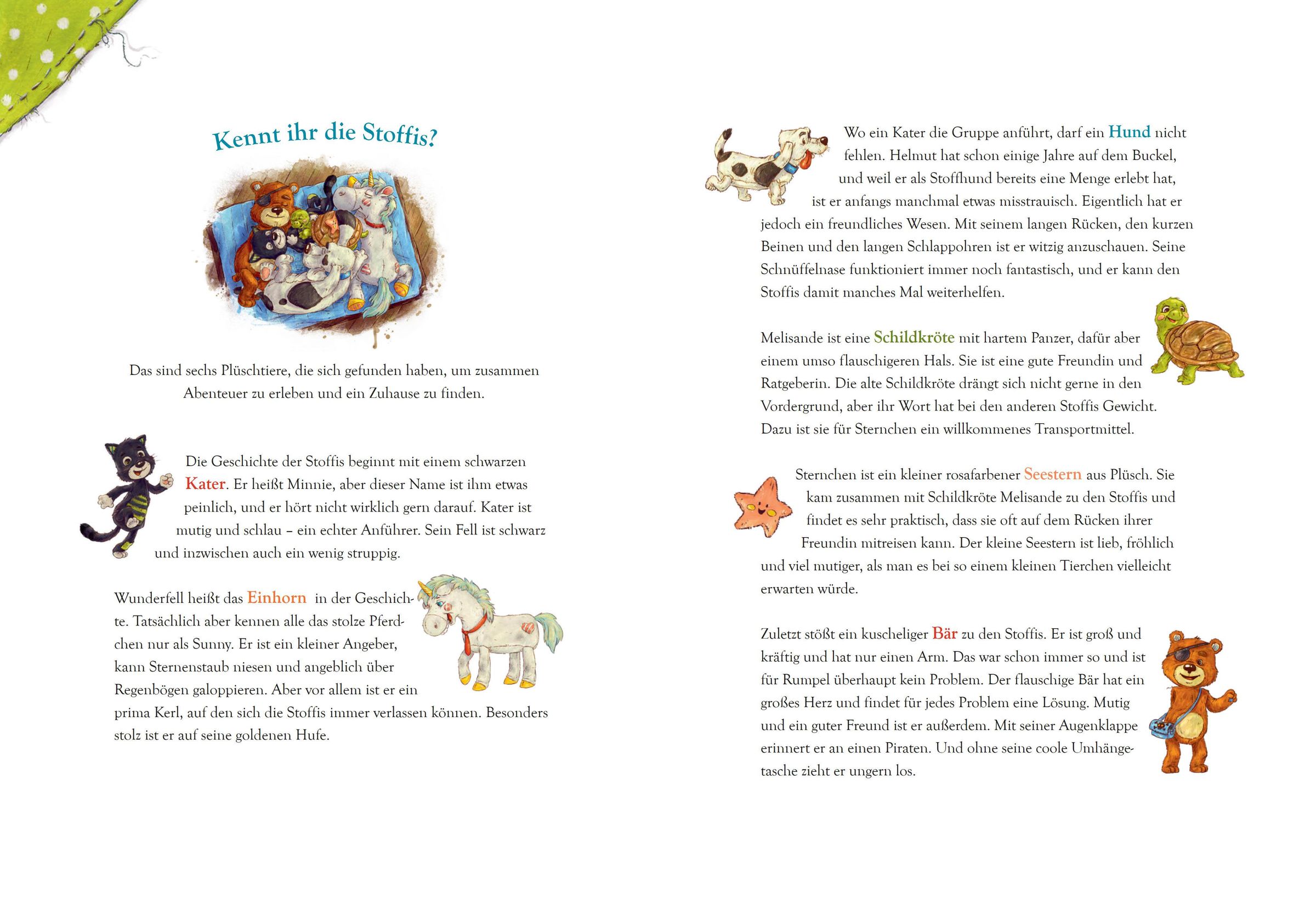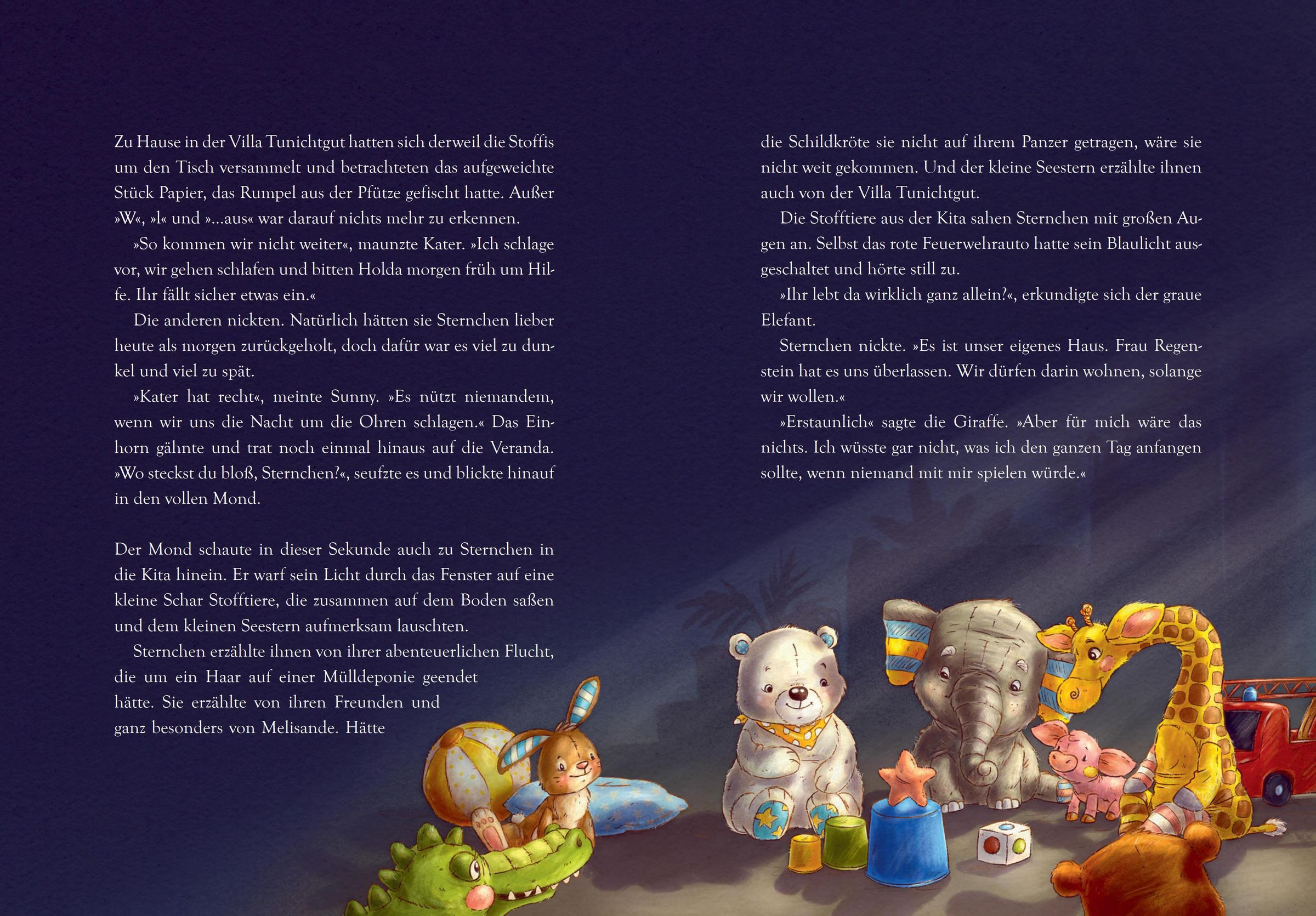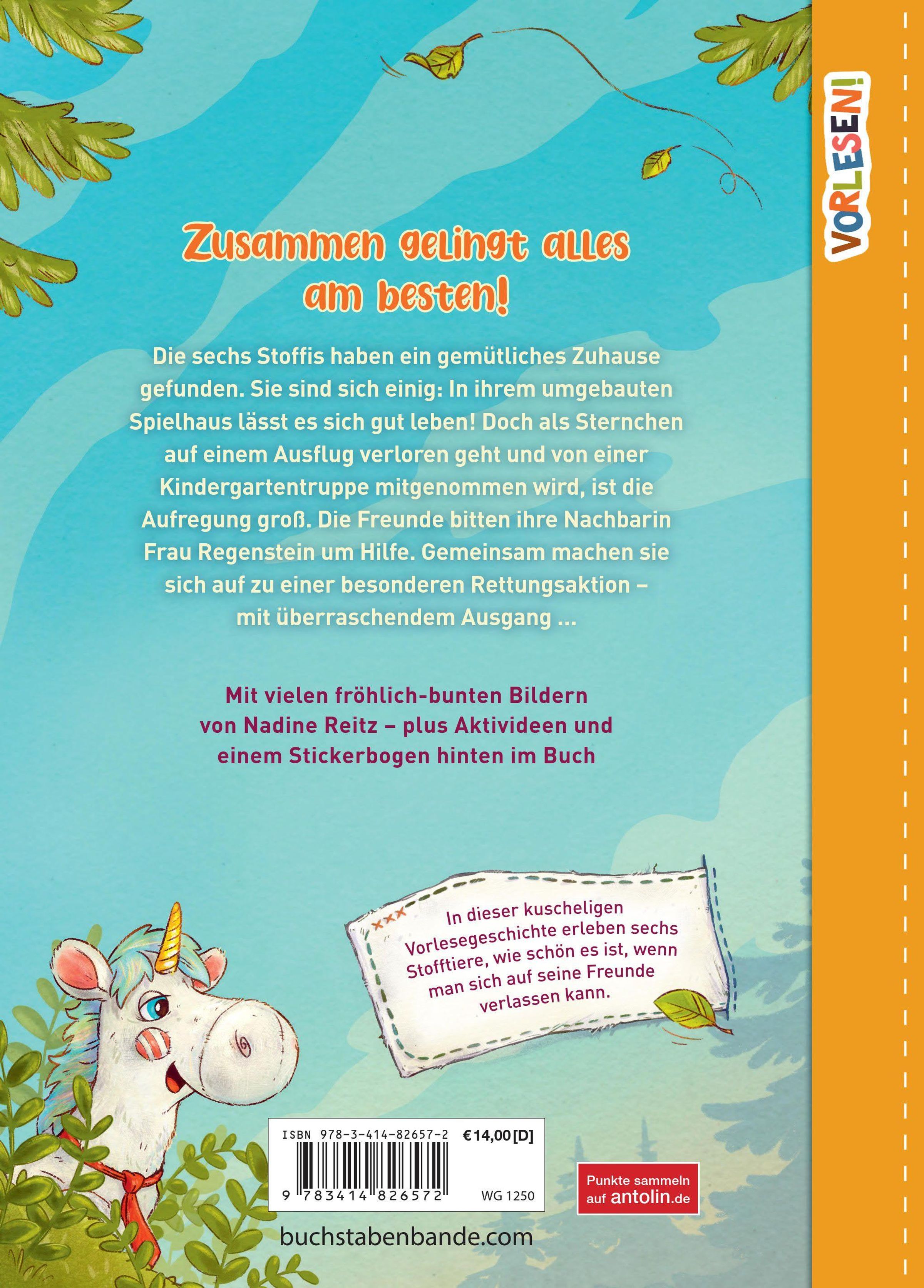 Die sechs Stoffis haben ein gemütliches Zuhause gefunden. Sie sind sich einig: In ihrem umgebauten Spielhaus lässt es sich gut leben! Doch als Sternchen auf einem Ausflug verloren geht und von einer Kindergartentruppe mitgenommen wird, ist die Aufregung groß. Die Freunde bitten ihre Nachbarin Frau Regenstein um Hilfe. Gemeinsam machen sie sich auf zu einer besonderen Rettungsaktion - mit überraschendem Ausgang ...