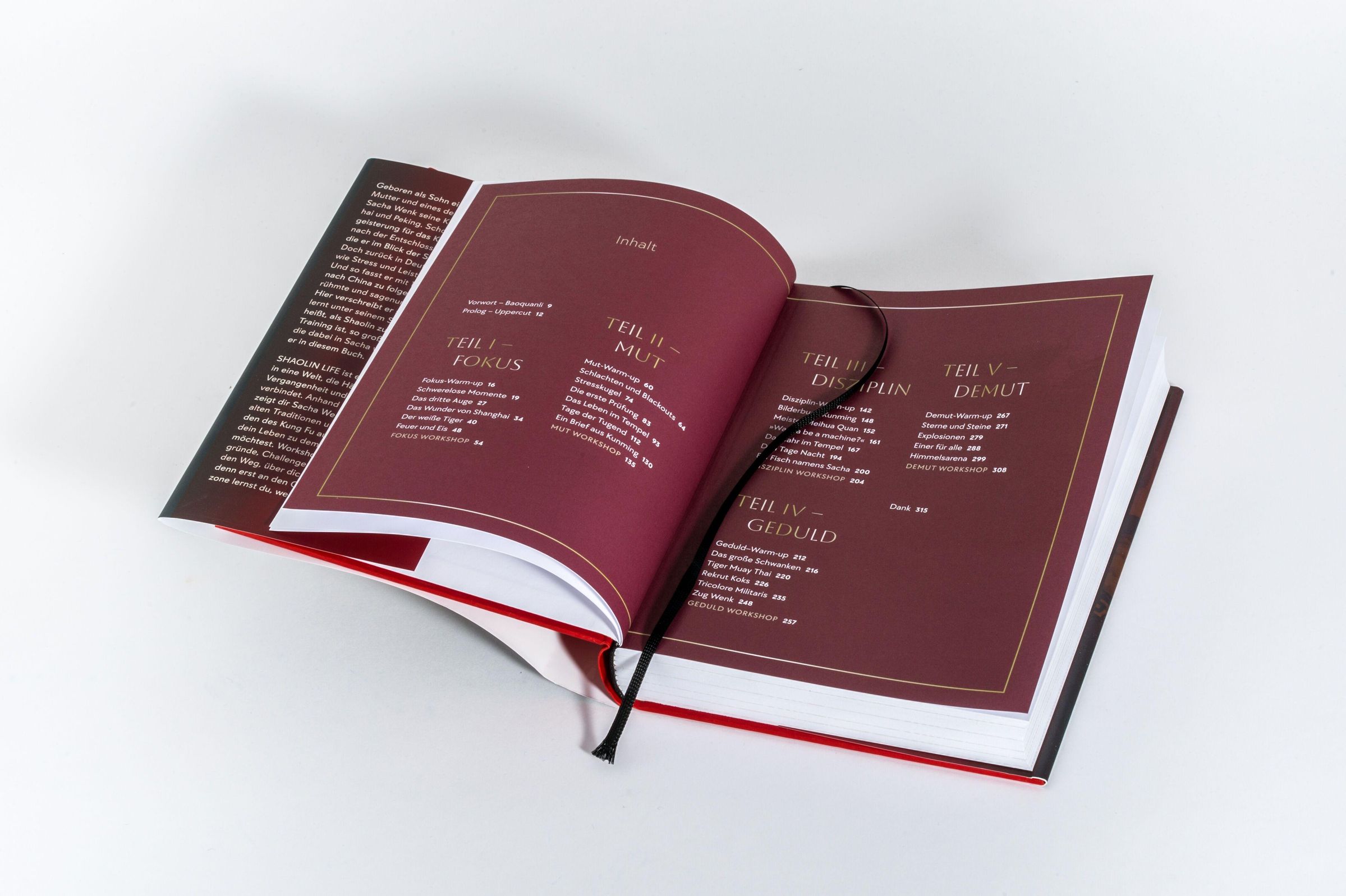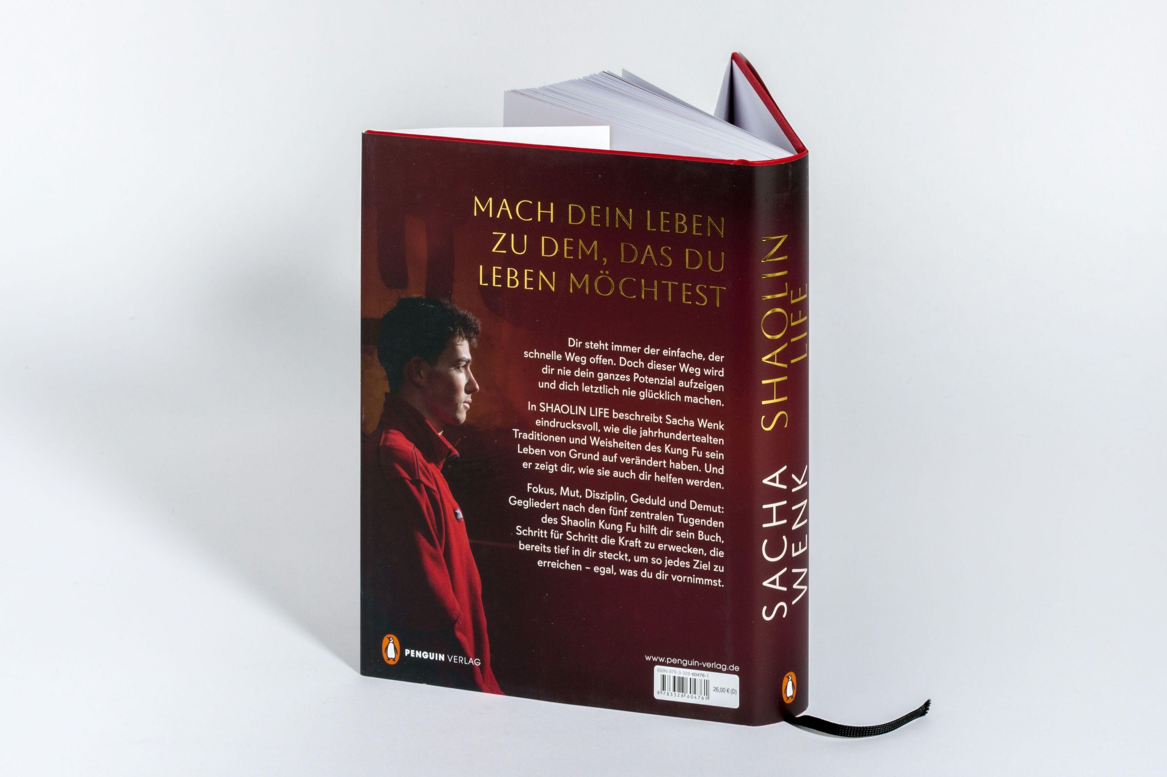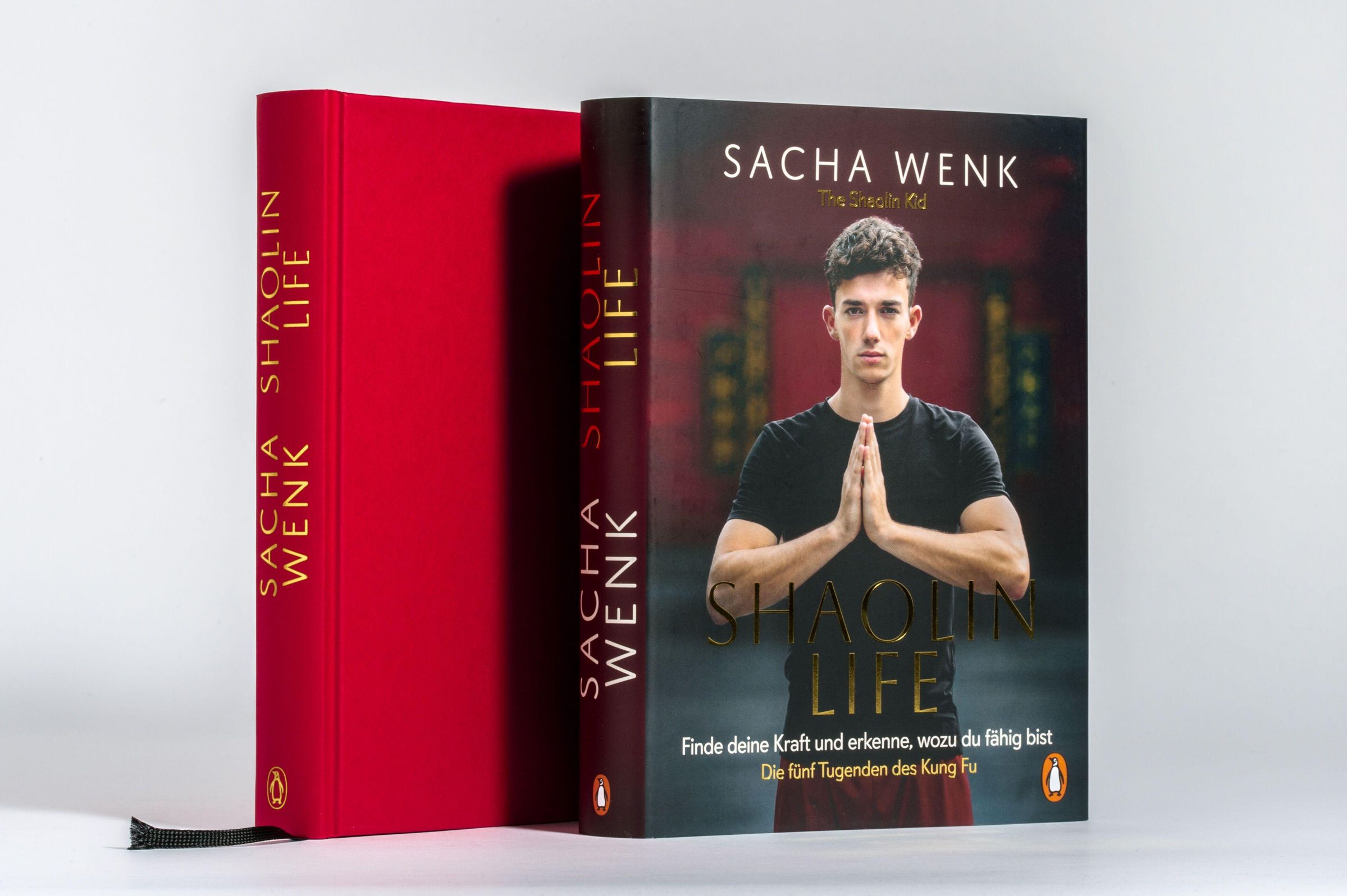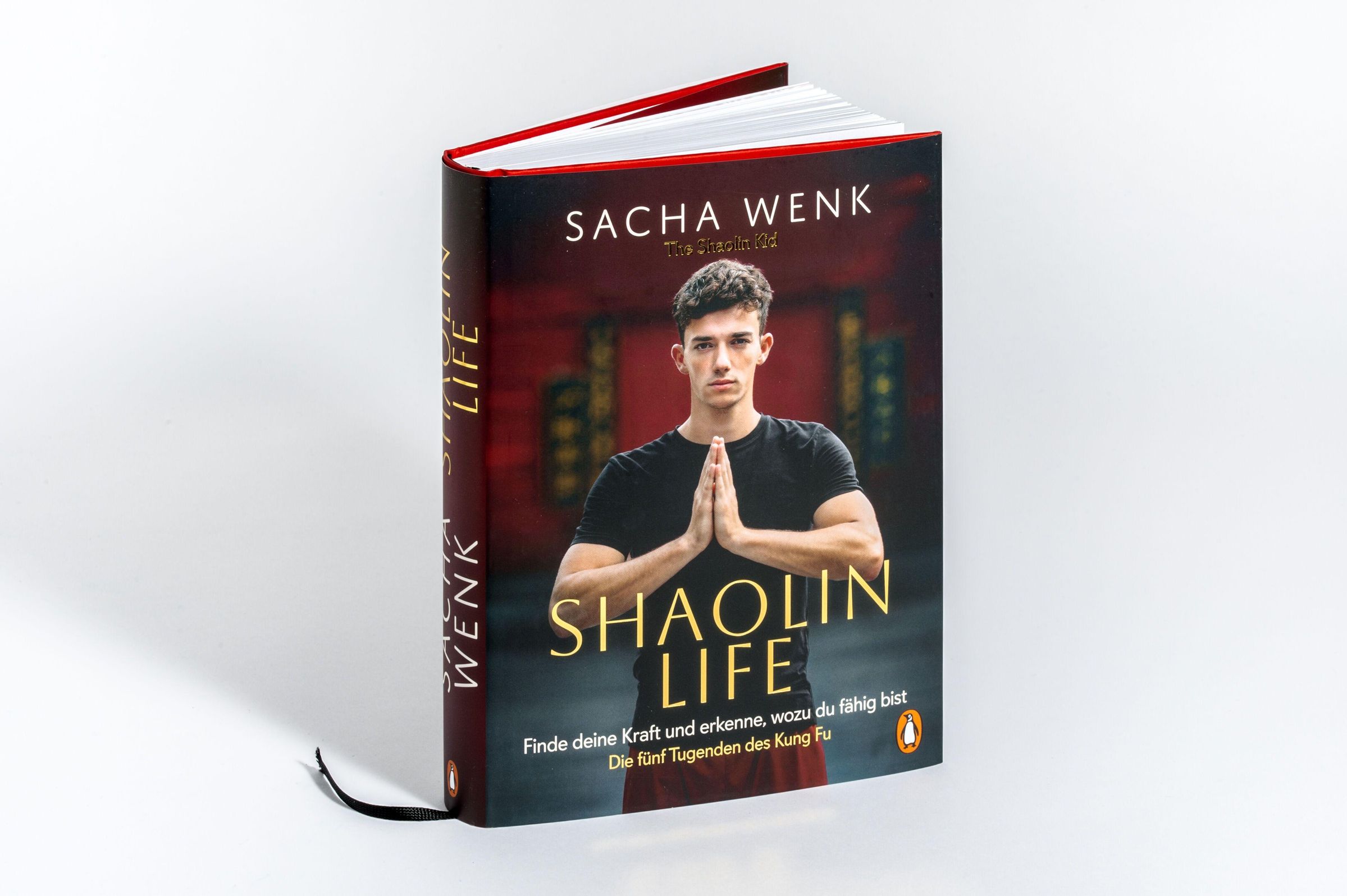 "Sacha Wenk, The Shaolin Kid, Shaolin Life. Finde deine Kraft und erkenne, wozu du fähig bist. Die fünf Tugenden des Kung Fu." Ein Mann in Gebetshaltung., Buch