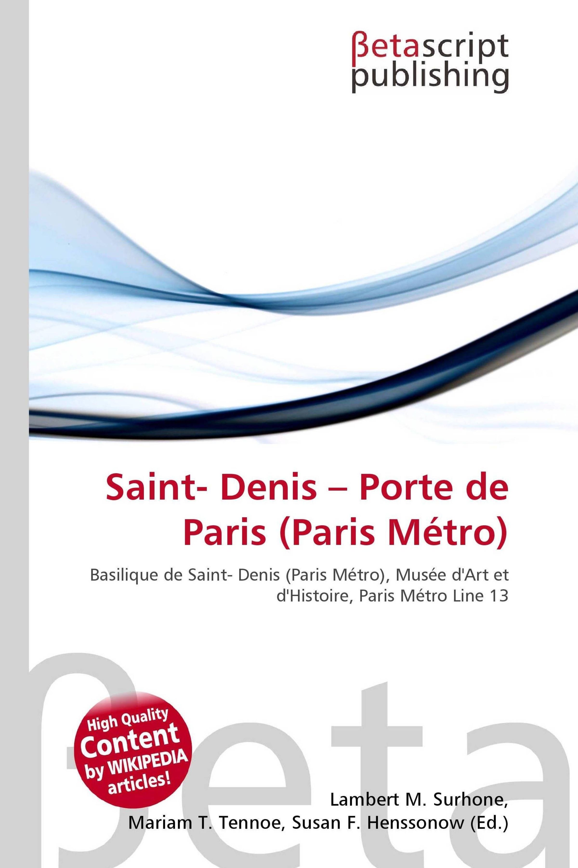 Please note that the content of this book primarily consists of articles available from Wikipedia or other free sources online. Saint-Denis - Porte de Paris is a station on line 13 of the Paris Métro in the commune of Saint-Denis. The station has a flat roof supported by beams. Its walls are vertical are adorned with white tiles used for advertising, especially for sports tournaments at the Stade de France. The station opened on 26 May 1976 when the line was extended from Carrefour Pleyel to Basilique de Saint-Denis. It was later renovated for the opening of the Stade de France to enable it to handle large flows of passengers. It now has a large hall with many gates to channel large crowds using the station to attend events at the Stade de France.