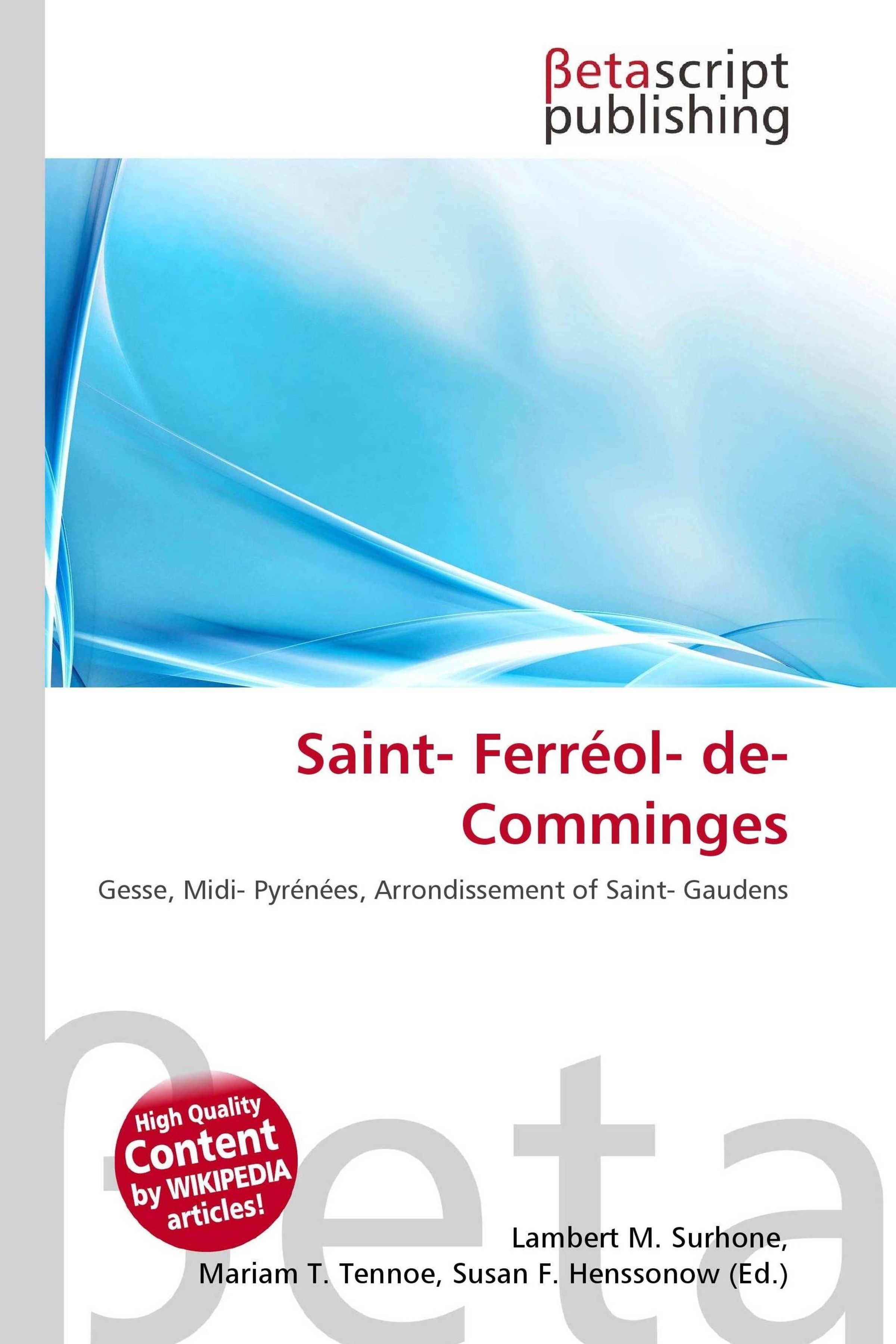 Please note that the content of this book primarily consists of articles available from Wikipedia or other free sources online. Saint-Ferréol-de-Comminges is a commune in the Haute-Garonne department in south-western France. Haute-Garonne is a department in the southwest of France named after the Garonne river. Its main city is Toulouse. Haute-Garonne is one of the original 83 departments created during the French Revolution on March 4, 1790. It was created from part of the former province of Languedoc. Haute-Garonne is part of the current region of Midi-Pyrénées and is surrounded by the departments of Hautes-Pyrénées, Gers, Tarn-et-Garonne, Tarn, Aude, and Ariège. It also borders Spain in the south (province of Lleida and province of Huesca).