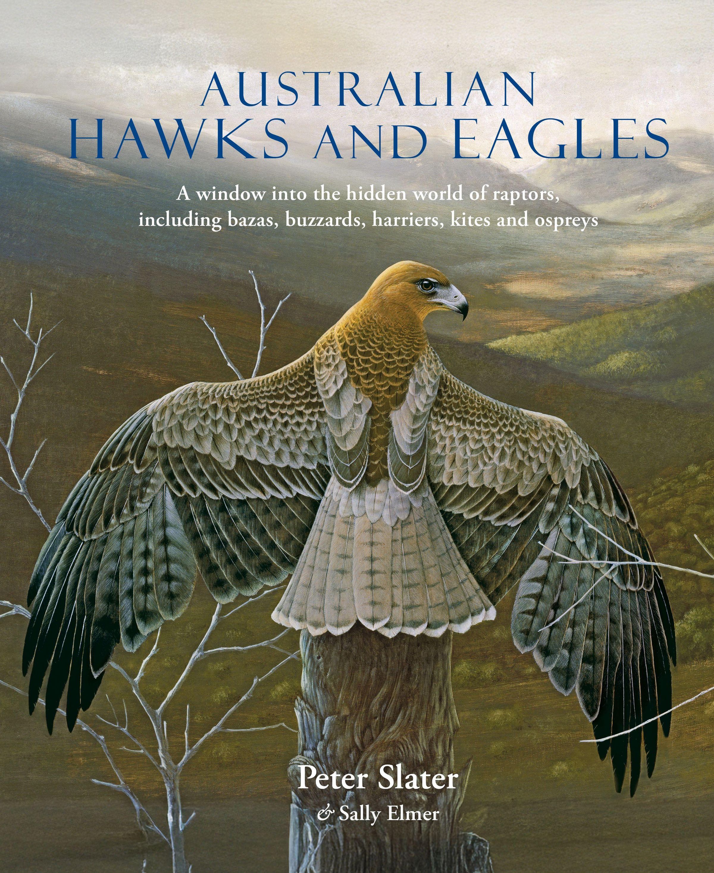 Titel: "Australian Hawks and Eagles" von Peter Slater & Sally Elmer. Illustration eines Adlers auf einem Baumstumpf., Buch