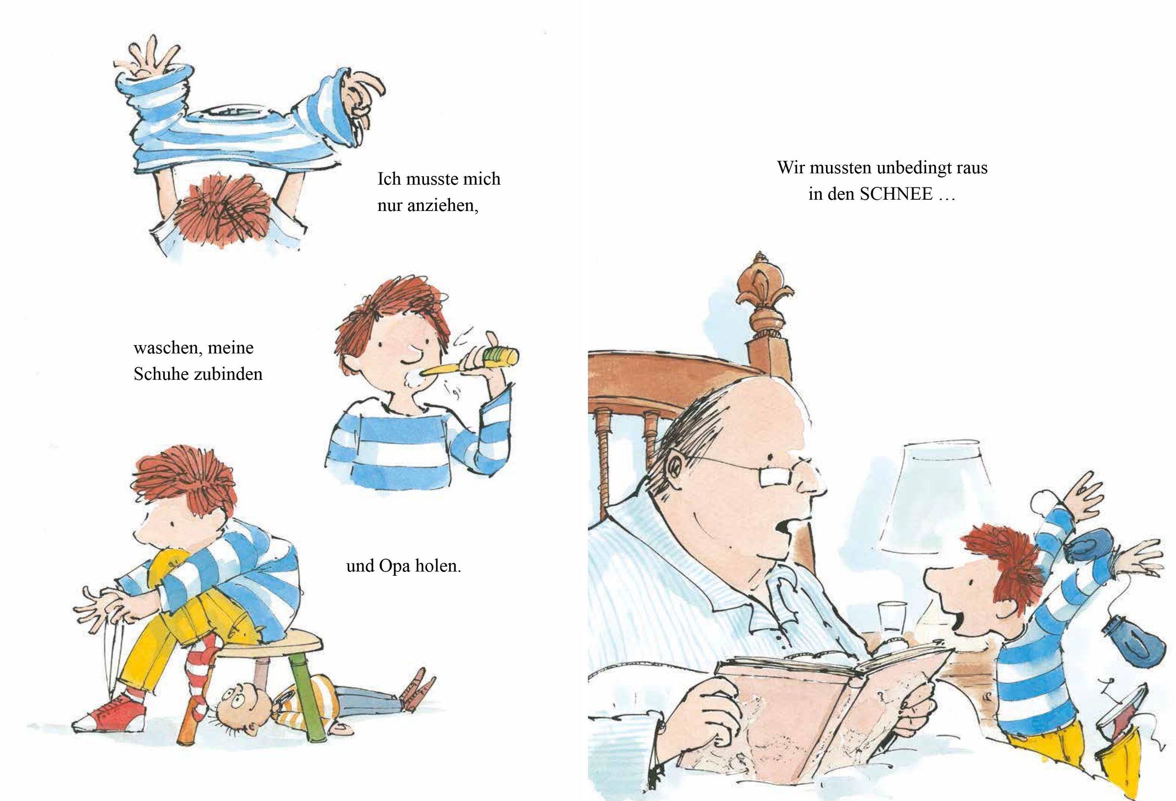 Es gibt kein schlechtes Wetter, wenn man Fantasie hat - und einen Opa, mit dem jeder Tag ein Abenteuer ist! Denn nur weil es regnet, bleiben der Junge und sein Großvater ganz sicher nicht zu Hause. Im Hochsommer wird die Suche nach dem perfekten Picknickplatz zu einer fantastischen Reise. Wenn es stürmisch wird, lassen die beiden Drachen steigen - und vielleicht fliegen sie gleich ein Stück mit? Und im Winter erleben der Junge und sein Opa das tierischste Abenteuer überhaupt!