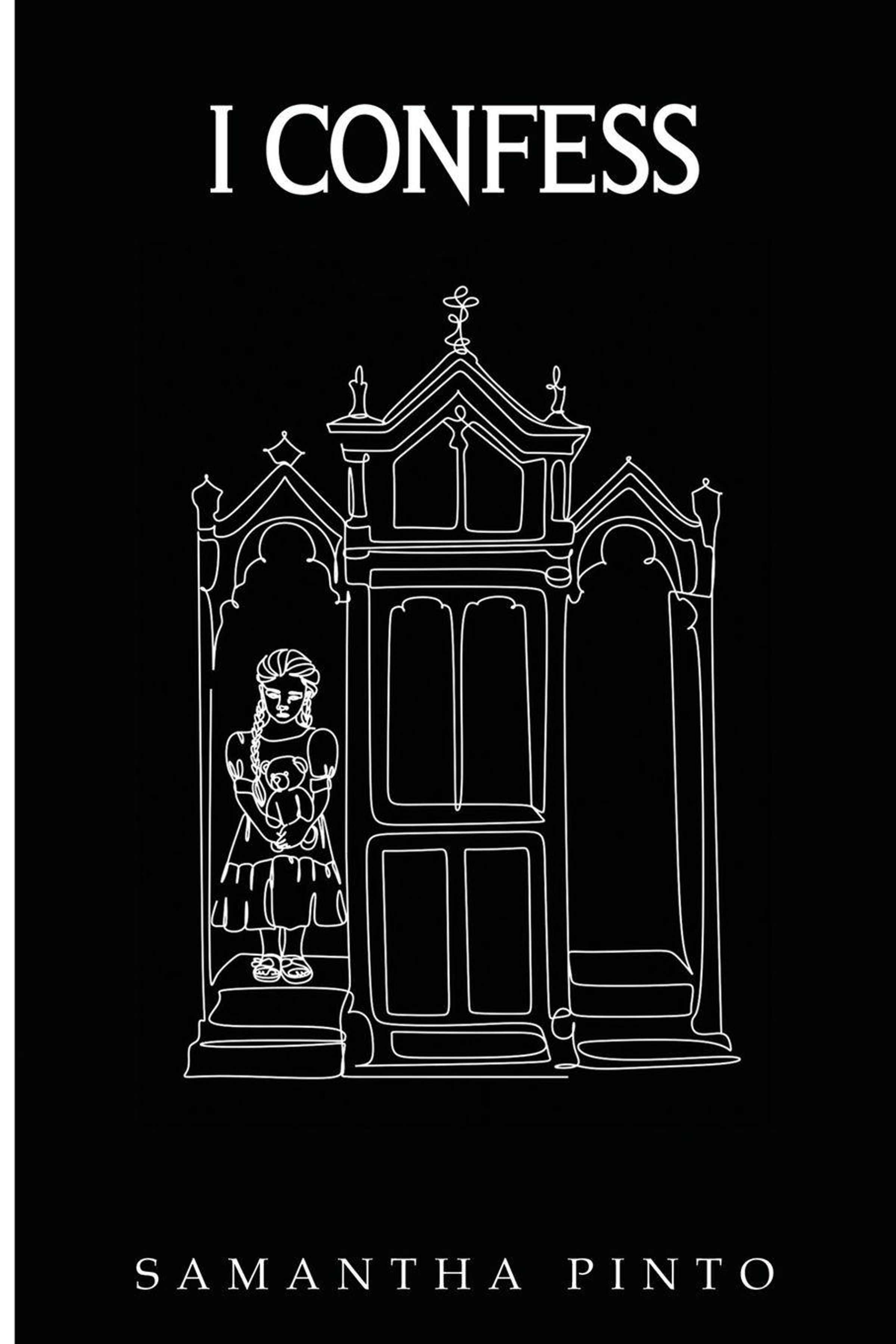 "I CONFESS" oben, "SAMANTHA PINTO" unten, dazwischen eine lineare Illustration eines Mädchens in einem Beichtstuhl., Buch