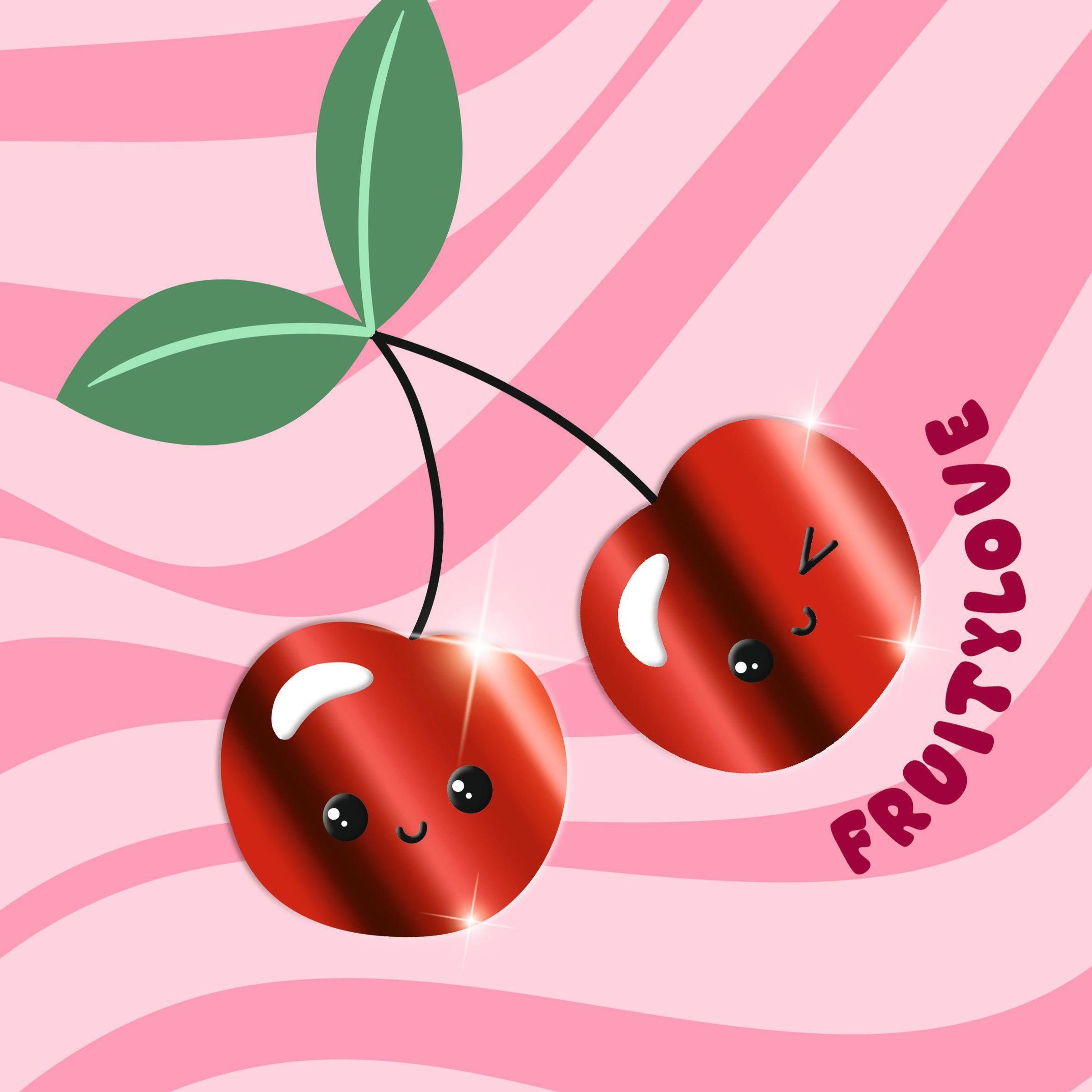 "FRUITYLOVE" steht über zwei lächelnden, illustrierten Kirschen mit Gesichtern, vor einem rosa geschwungenen Hintergrund., Diverse