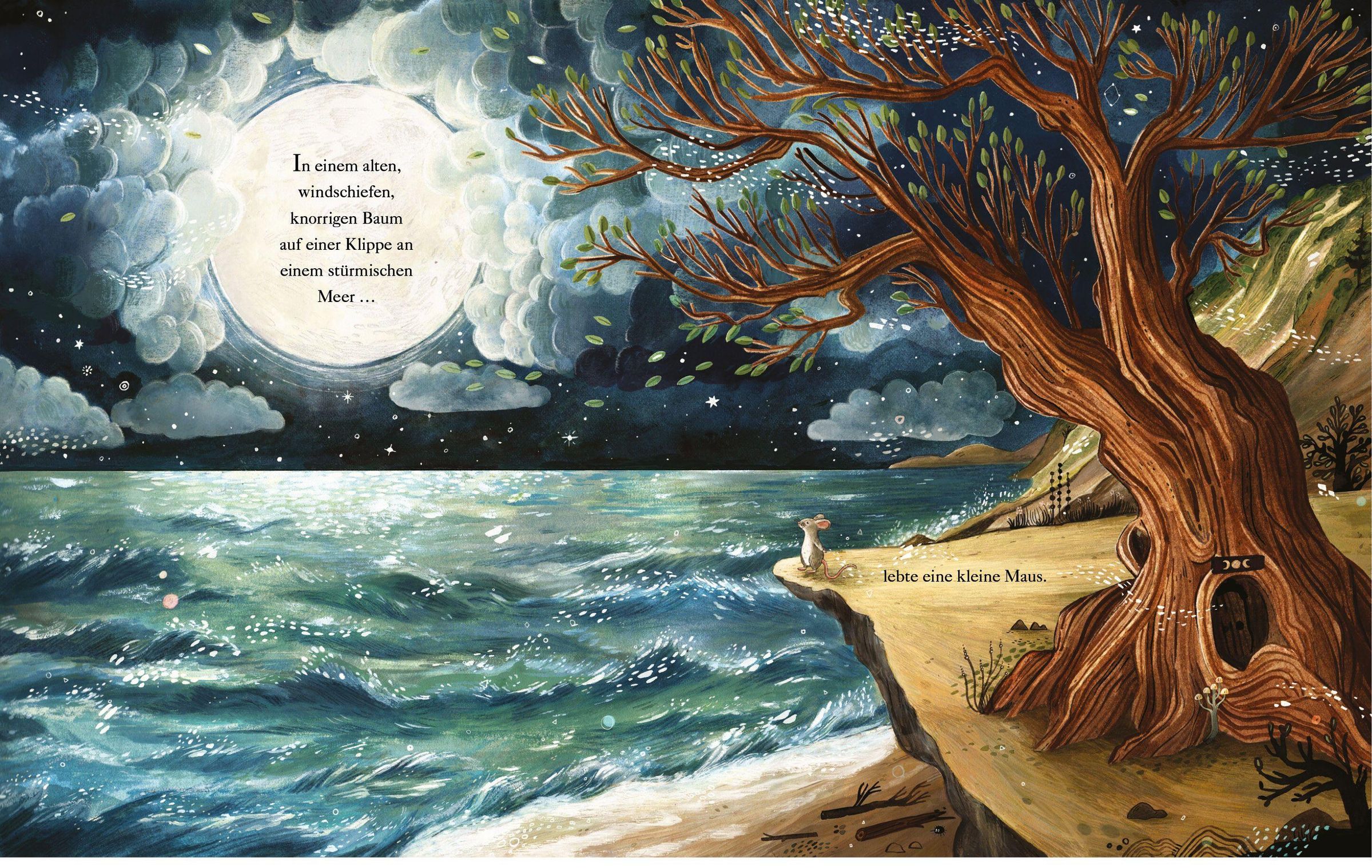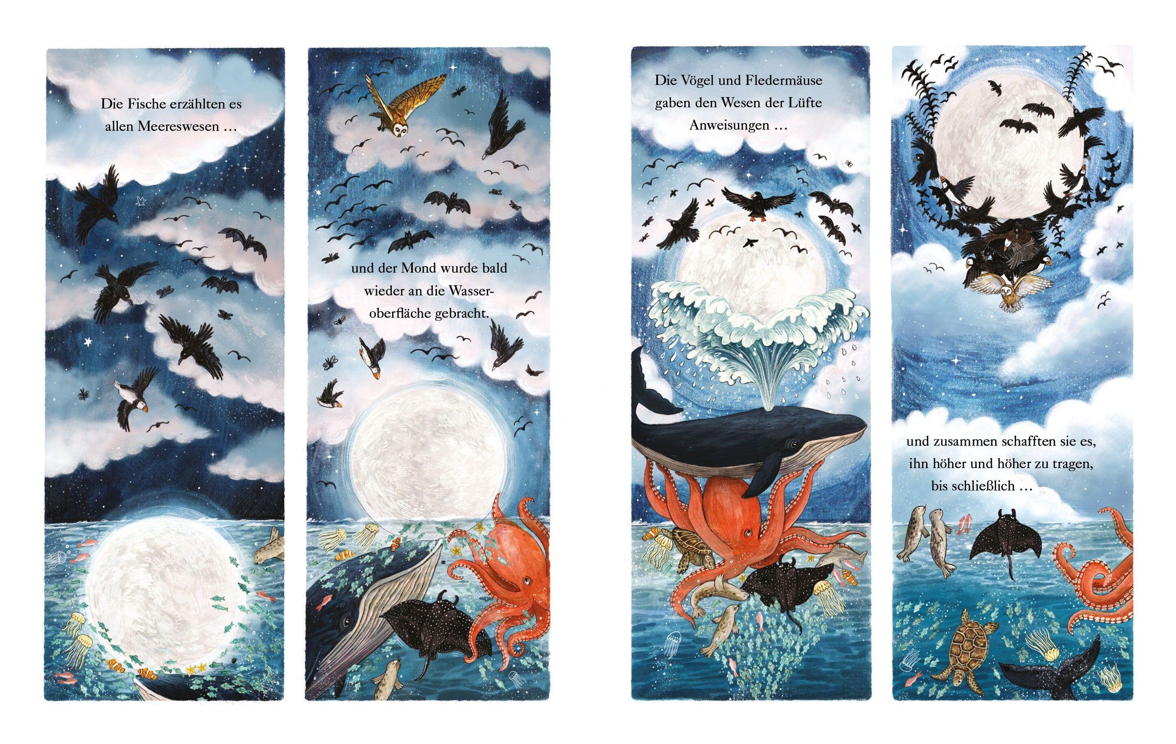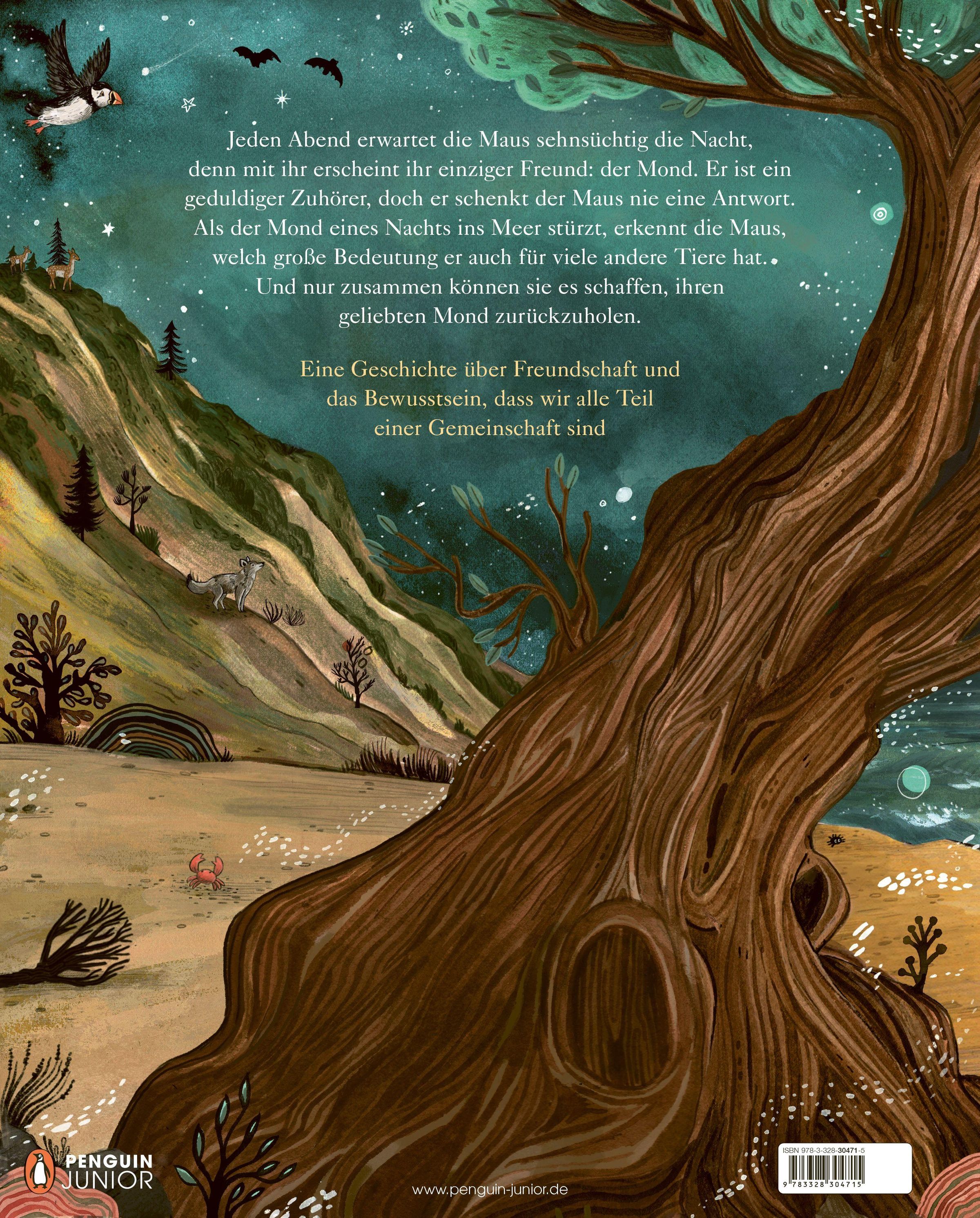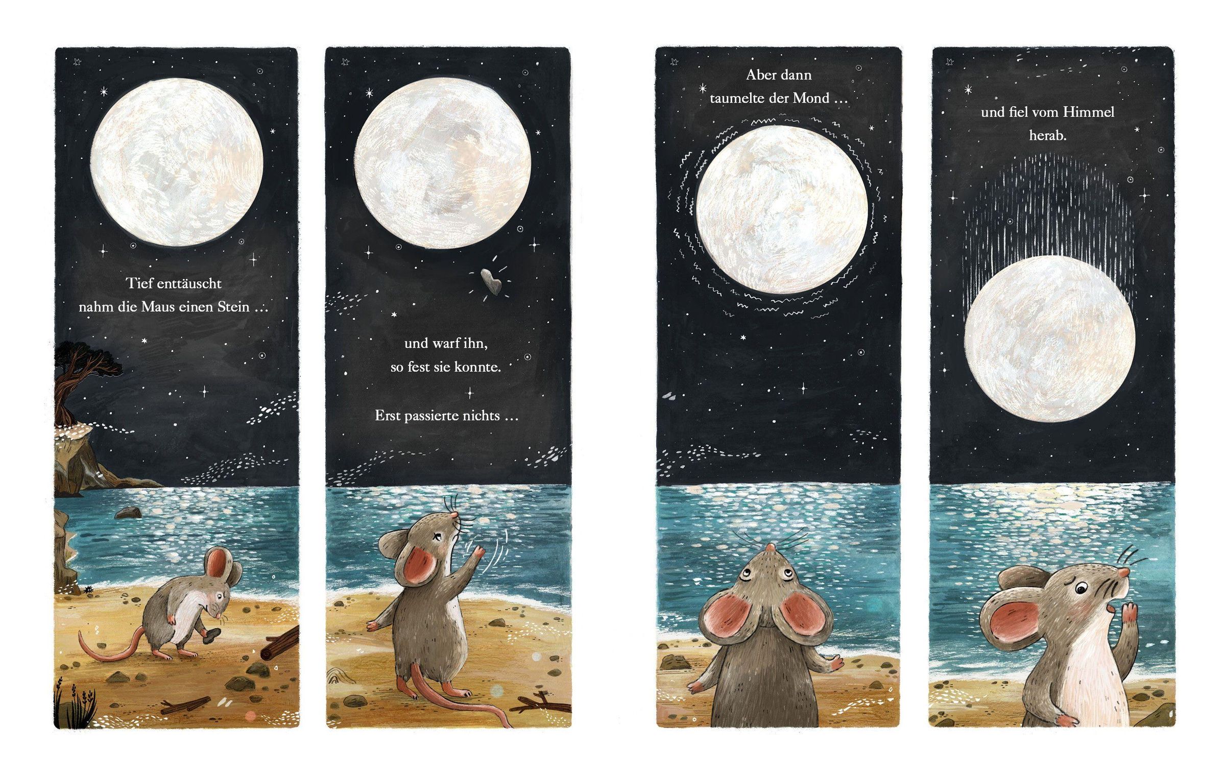 Jeden Abend erwartet die Maus sehnsüchtig die Nacht, denn mit ihr erscheint ihr einziger Freund: der Mond. Er ist ein geduldiger Zuhörer, doch er schenkt der Maus nie eine Antwort. Als der Mond eines Nachts ins Meer stürzt, erkennt die Maus, welch große Bedeutung er auch für viele andere Tiere hat. Und nur wenn alle zusammenhalten, können sie es schaffen, ihren geliebten Mond zurückzuholen.