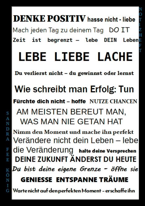 Das 60-seitige Ringbuch eignet sich als Notizbuch, Zeichenheft und oder als Geschenk für Menschen, die mit den Motivationssprüchen etwas anfangen oder diese gebrauchen können.