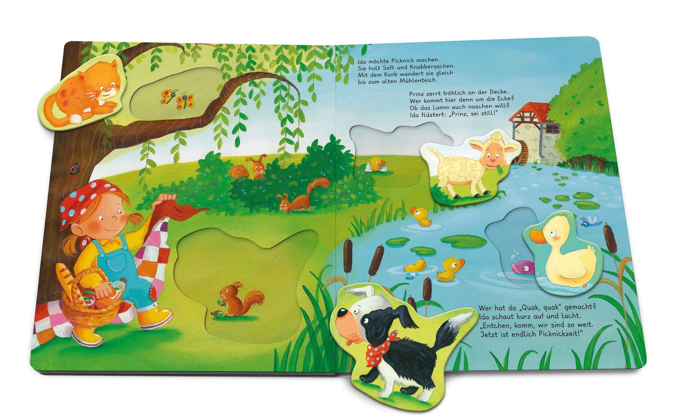 Ida freut sich, bei ihr auf dem Bauernhof ist immer etwas los! Sie gießt ihre Blumen, tollt mit ihrem Hund Prinz durch den Garten, besucht die Hühner, die Häschen und Katze Maunz - und dann macht sie auch noch ein tolles Picknick! Ein lustiger Vorlese- und Spielspaß mit großen Puzzleteilen zum Immer-Wieder- Einsetzen.