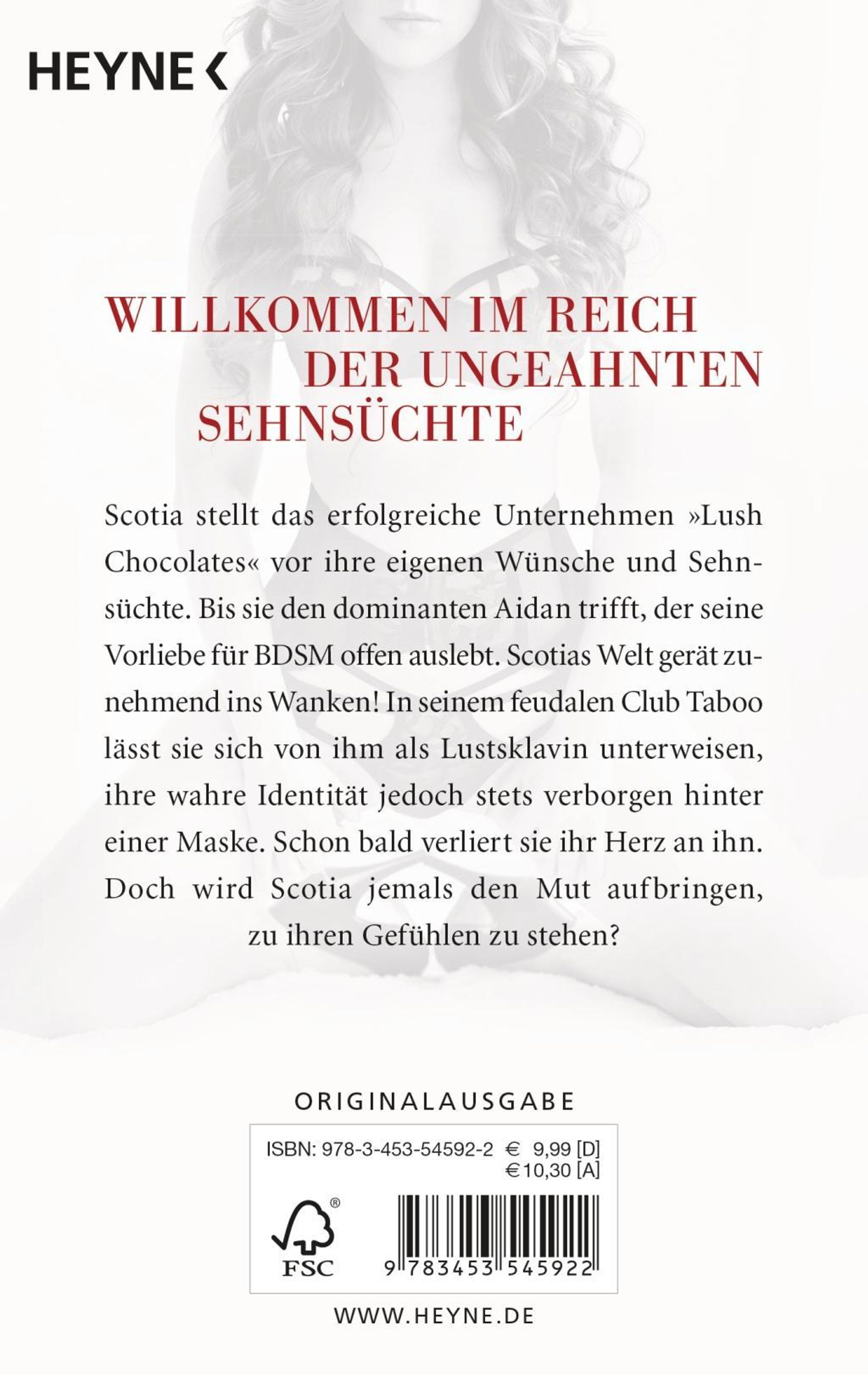 Scotia stellt das Familienunternehmen "Lush Chocolates" vor ihre eigenen Wünsche und Sehnsüchte. Bis sie den dominanten Aidan trifft, der seine Vorliebe für BDSM offen auslebt. Scotias Welt gerät ins Wanken! In seinem feudalen Club Taboolässt sie sich von ihm als Lustsklavin unterweisen, ihre wahre Identität jedoch stets verborgen hinter einer Maske. Schon bald verliert sie ihr Herz an ihn. Doch wird Scotia jemals den Mut aufbringen, zu ihren Gefühlen zu stehen?