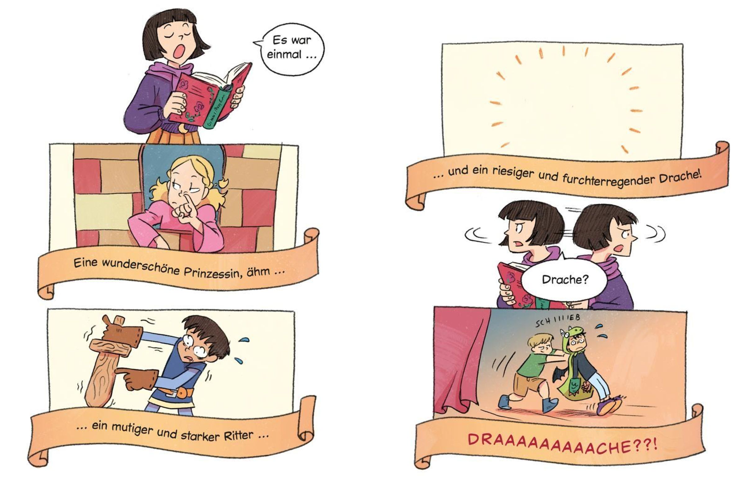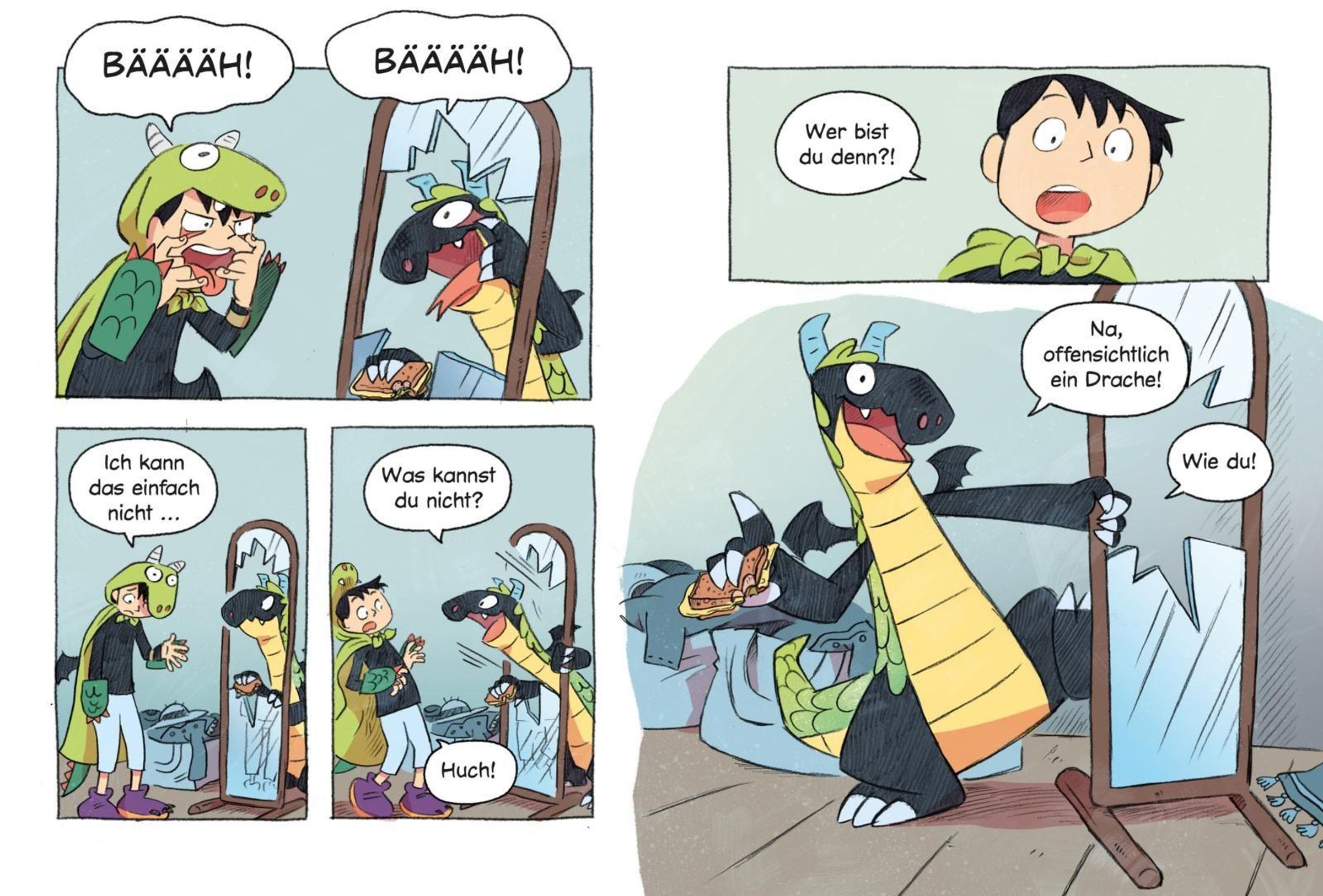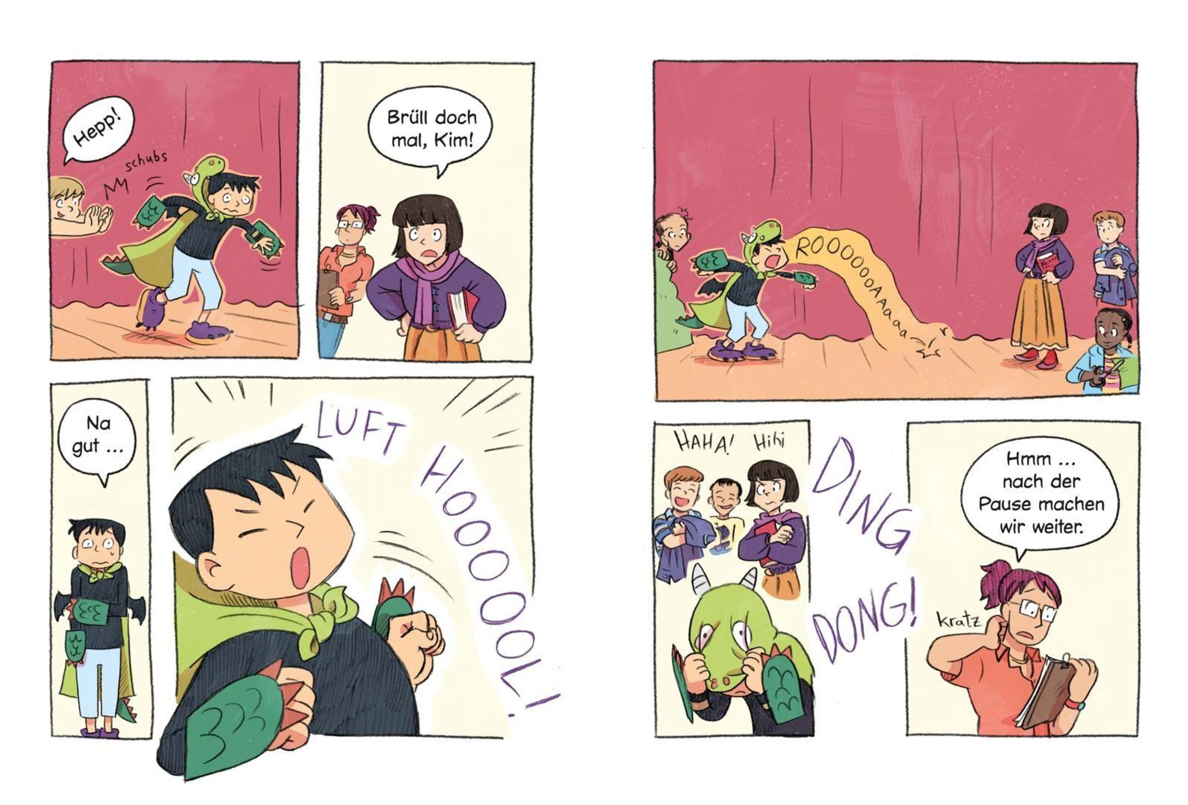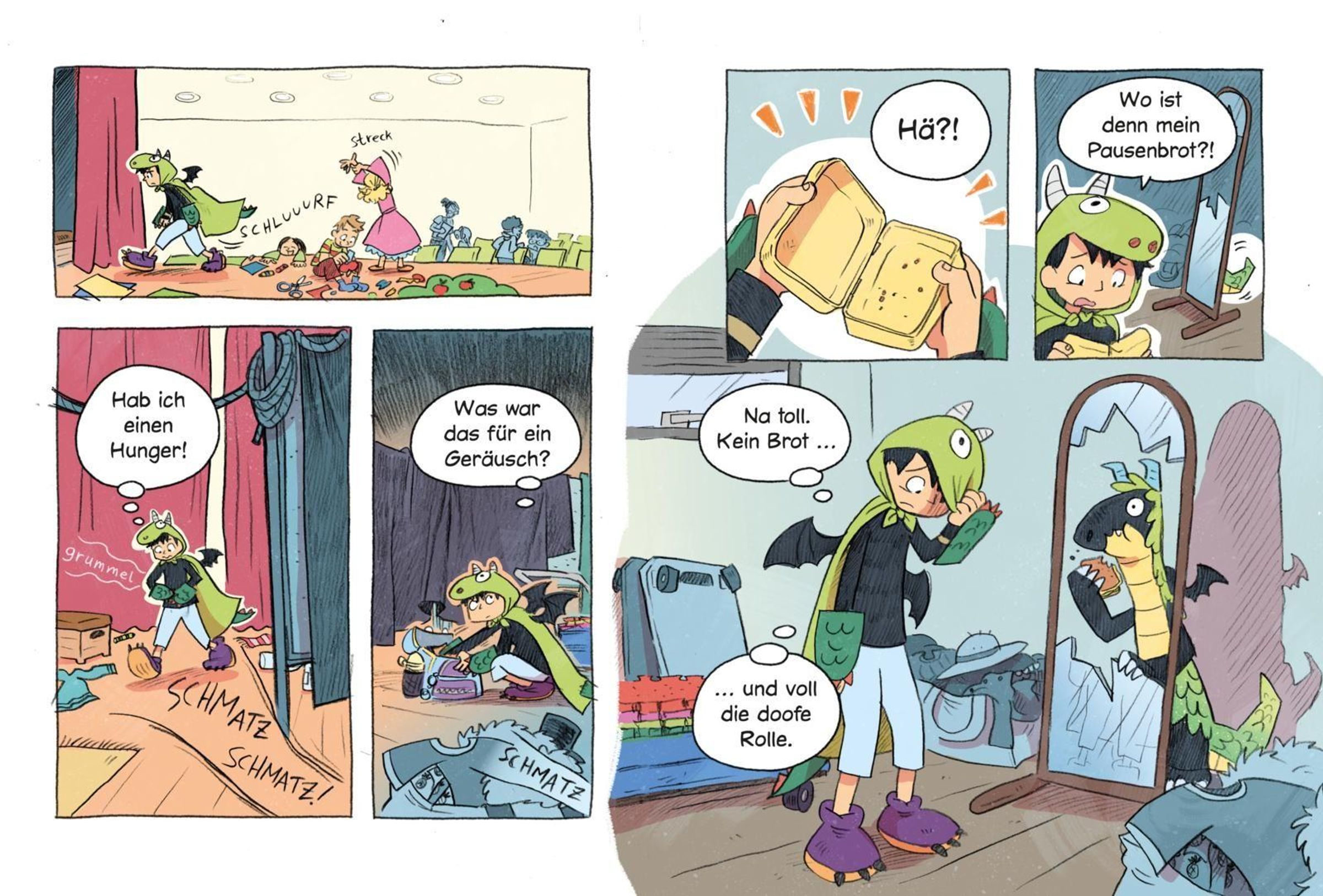 Kim ist entsetzt: Ausgerechnet er soll im Schultheater den Drachen spielen! Brüllen, fauchen, Feuer spucken, das ist so gar nicht sein Ding. Doch dann taucht hinter der Bühne plötzlich ein echter Drache auf - Drago! Der isst heimlich Pausenbrote, ist nicht besonders furchteinflößend ... und will eigentlich nur tanzen. Gemeinsam bringen Kim und Drago das Märchenstück ganz schön durcheinander und erfinden kurzerhand ihr eigenes Ende. Am Schluss ist klar: Mut hat viele Gesichter und manchmal braucht es Seifenwasser, um einen großen Auftritt hinzulegen!