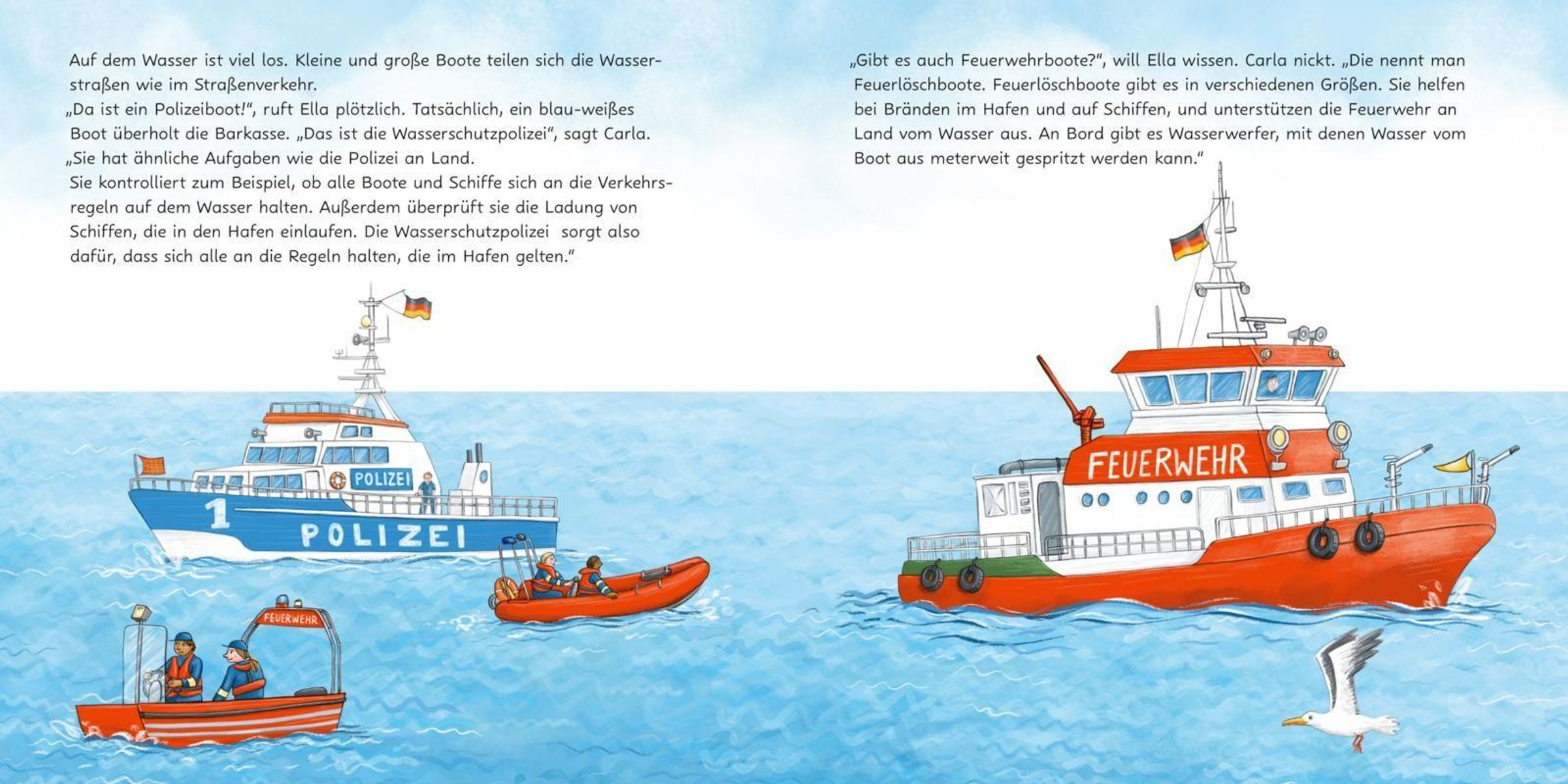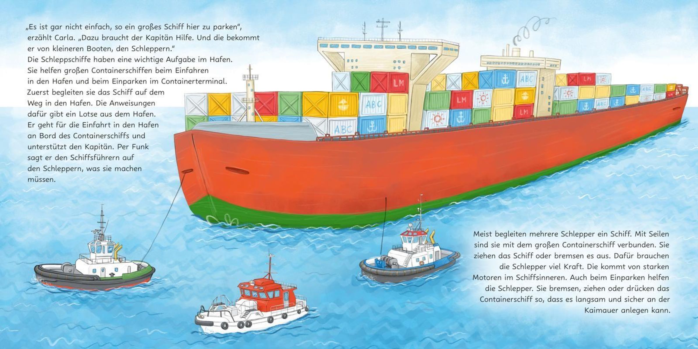 Ahoi und Leinen los! Ella, Theo und ihre Tante Hanna machen einen Ausflug in den Hafen. Dort gibt es viele verschiedene Schiffe zu sehen, vom kleinen Segelboot bis zum großen Containerschiff. Komm mit auf große Hafenrundfahrt! Ein neues Lieblingsbuch für Technikfans.