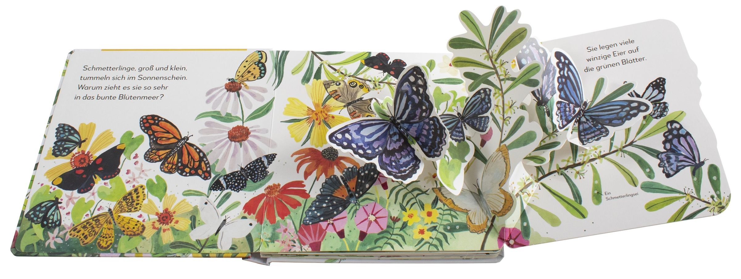 Die Schmetterlinge fliegen durch das kunterbunte Blütenmeer und bald klebt hier und da ein Ei. Was hat das zu bedeuten? Mit diesem Buch kommen schon Kleinkinder ab 2 der Natur richtig nah und können mit den großen Pop-ups unter den Klappen alles ganz genau entdecken. So weckt das Pappbilderbuch spielerisch das Interesse für Naturthemen und zeigt Kindern eines der faszinierendsten Schauspiele unserer heimischen Wiesen und Wälder.