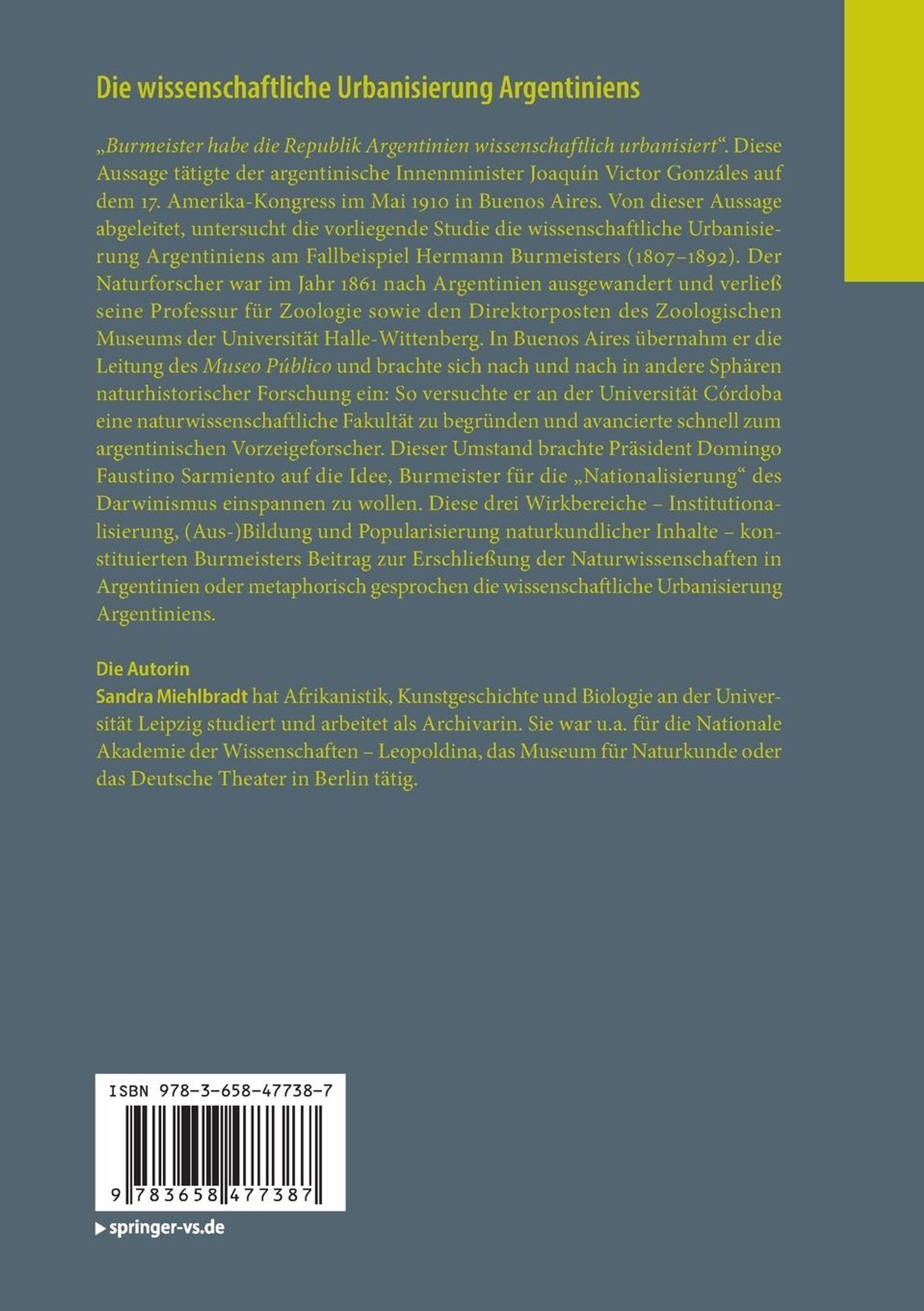 „Burmeister habe die Republik Argentinien wissenschaftlich urbanisiert ". Diese Aussage tätigte der argentinische Innenminister Joaquín Victor Gonzáles auf dem 17. Amerika-Kongress im Mai 1910 in Buenos Aires. Von dieser Aussage abgeleitet, untersucht die vorliegende Studie die wissenschaftliche Urbanisierung Argentiniens am Fallbeispiel Hermann Burmeisters (1807--1892). Der Naturforscher war im Jahr 1861 nach Argentinien ausgewandert und verließ seine Professur für Zoologie sowie den Direktorposten des Zoologischen Museums der Universität Halle-Wittenberg. In Buenos Aires übernahm er die Leitung des Museo Público und brachte sich nach und nach in andere Sphären naturhistorischer Forschung ein: So versuchte er an der Universität Córdoba eine naturwissenschaftliche Fakultät zu begründen und avancierte schnell zum argentinischen Vorzeigeforscher. Dieser Umstand brachte Präsident Domingo Faustino Sarmiento auf die Idee, Burmeister für die „Nationalisierung" des Darwinismus einspannen zu wollen. Diese drei Wirkbereiche -- Institutionalisierung, (Aus-)Bildung und Popularisierung naturkundlicher Inhalte -- konstituierten Burmeisters Beitrag zur Erschließung der Naturwissenschaften in Argentinien oder metaphorisch gesprochen die wissenschaftliche Urbanisierung Argentiniens.