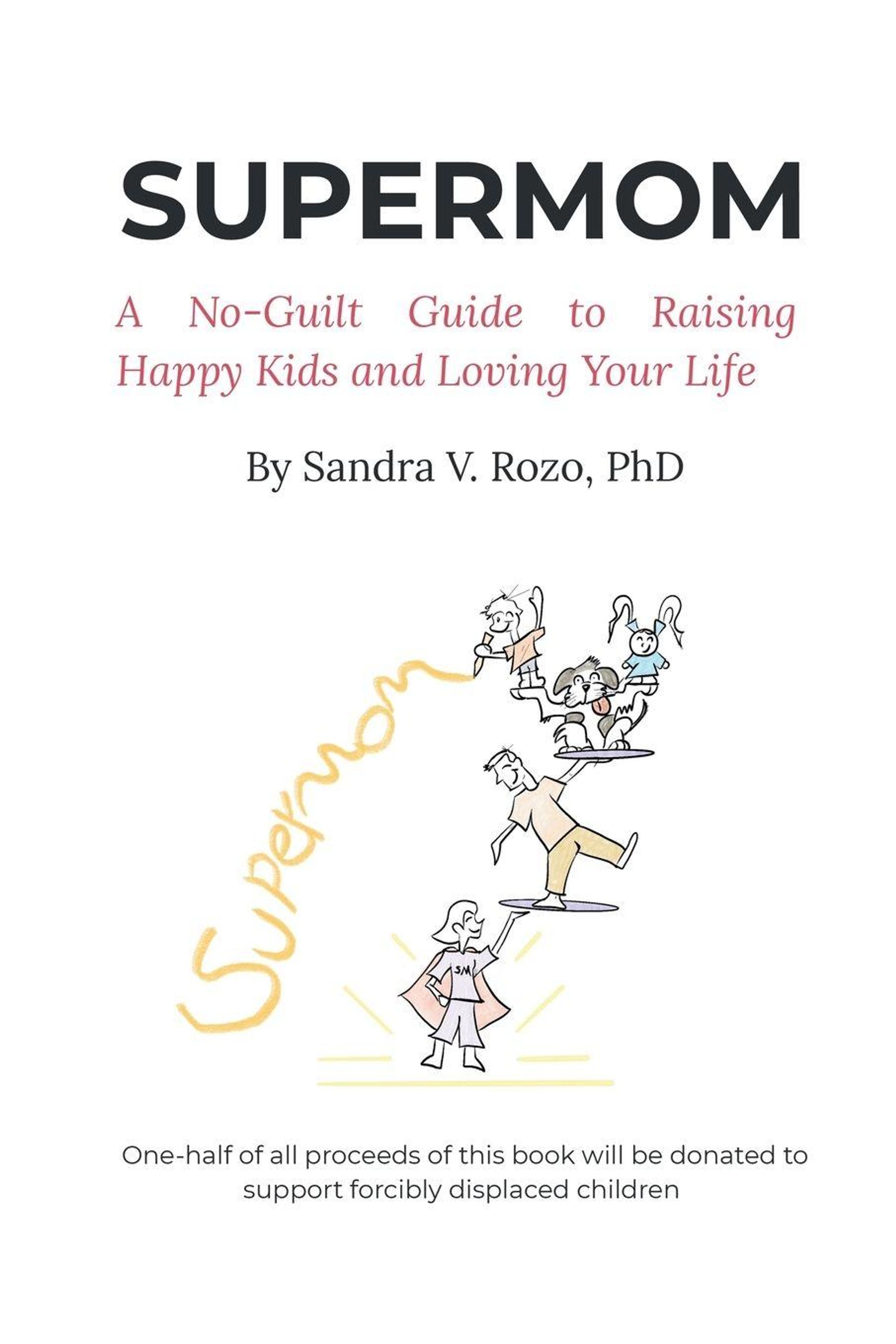 "SUPERMOМ: A No-Guilt Guide to Raising Happy Kids and Loving Your Life by Sandra V. Rozo, PhD" steht oben. Darunter eine Illustration mit einer Frau, die mehrere Kinder und Tiere balanciert., Buch