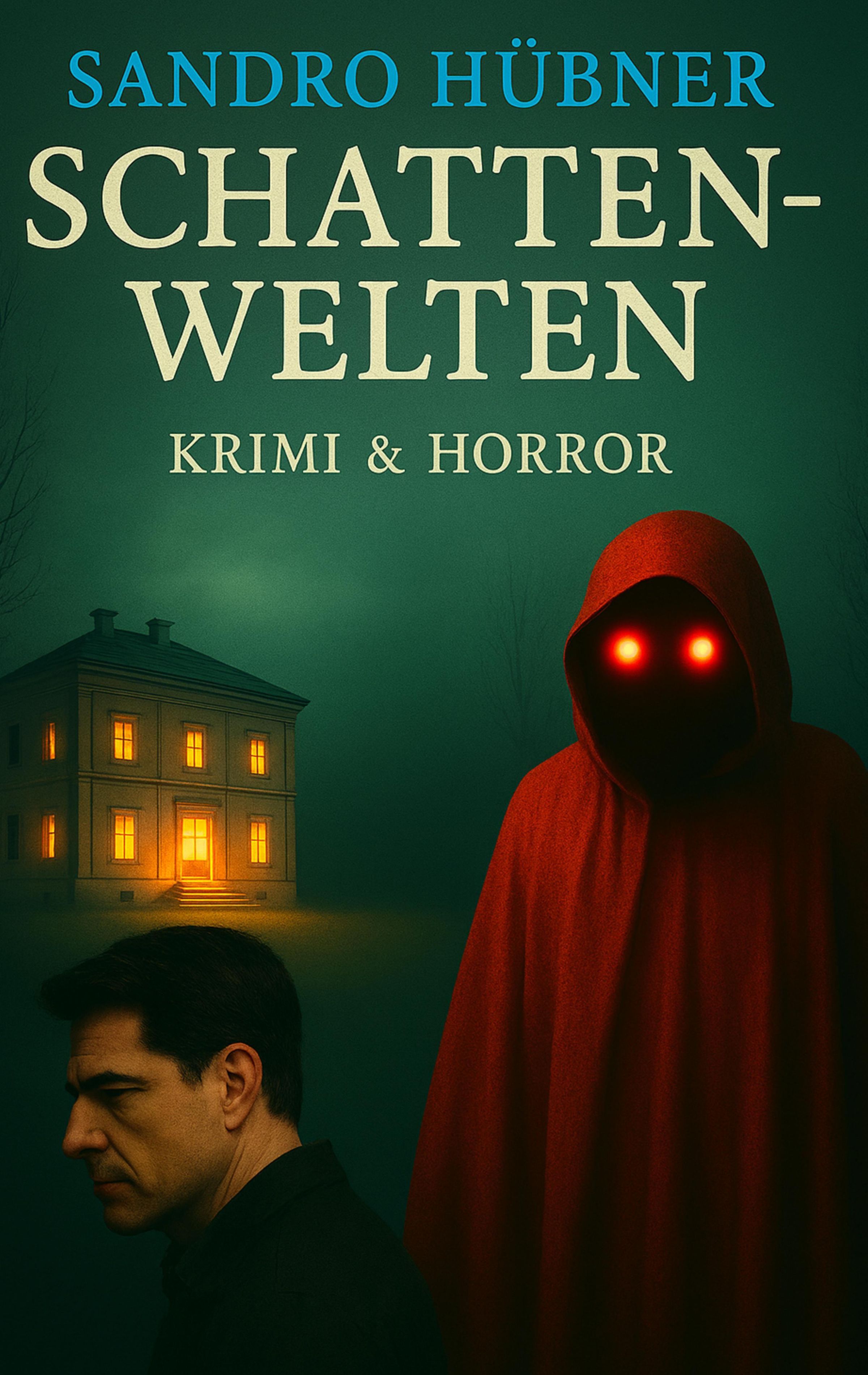 "Sandro Hübner. Schattenwelten. Krimi & Horror." Ein Mann und eine Gestalt mit roten Augen. Haus mit leuchtenden Fenstern., Buch