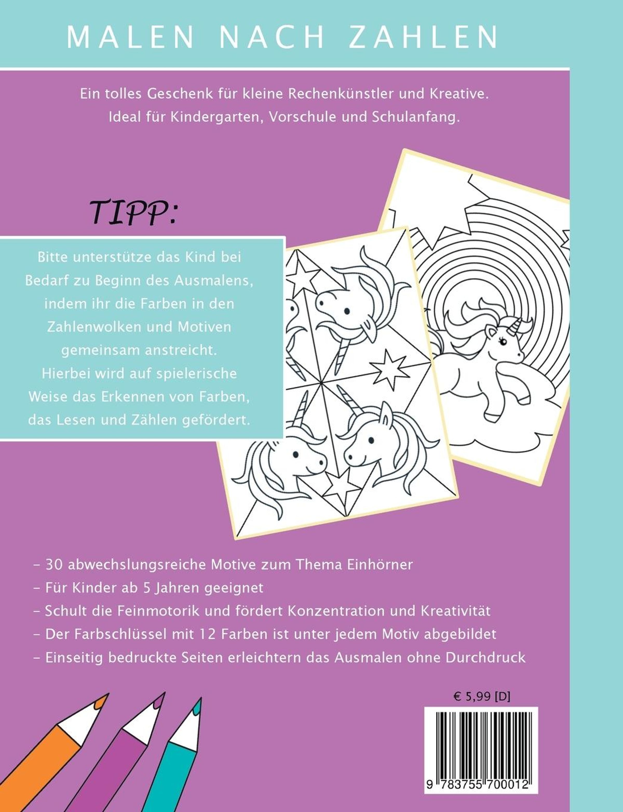 Das Malen nach Zahlen hat viele positive Auswirkungen. Es entschleunigt, schult die Feinmotorik und fördert die Konzentration und Kreativität. Dieses Malbuch enthält 30 abwechslungsreiche Motive zum Thema Einhörner, die besonders für Kinder ab 5 Jahren geeignet sind. Der Farbschlüssel mit 12 Farben ist unter jedem Motiv abgebildet, sodass ein Malspaß ohne Umblättern garantiert ist. Die einseitig bedruckten Seiten erleichtern außerdem das Ausmalen ohne Durchdruck. Ein tolles Geschenk für kleine Rechenkünstler und Kreative. Ideal für Kindergarten, Vorschule und Schulanfang. Tipp: Bitte unterstütze das Kind bei Bedarf zu Beginn des Ausmalens, indem ihr die Farben in den Zahlenwolken und Motiven gemeinsam anstreicht. Hierbei wird auf spielerische Weise das Erkennen von Farben, das Lesen und Zählen gefördert.