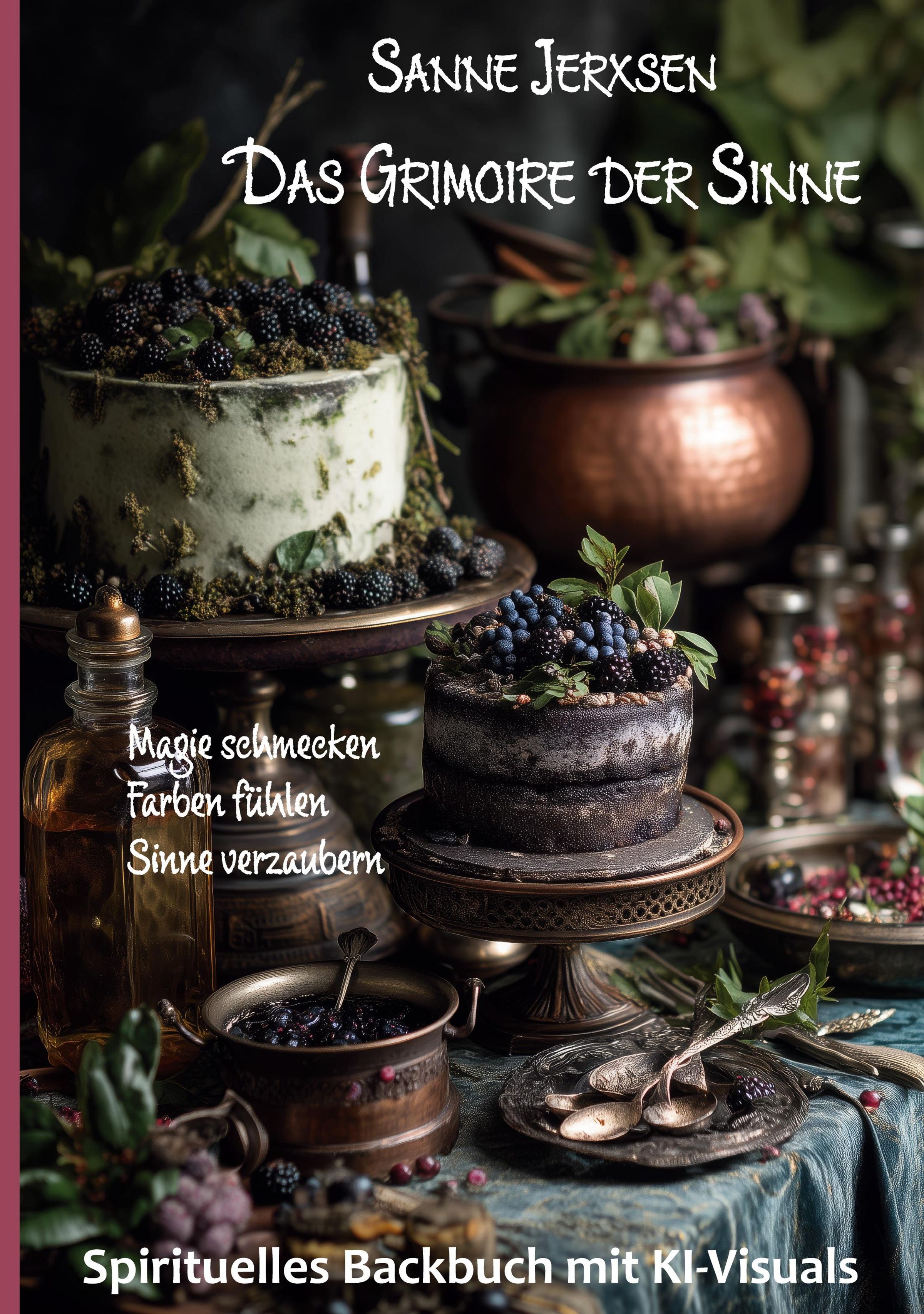 In ihrem "Grimoire der Sinne" verbindet sie diese drei Welten zu etwas völlig Neuem: Sechs magische Kuchen- und zwei Brotkreationen folgen dem Jahreskreis der Sabbate - von der Schneekristall-Tarte zu Yule bis zum transformierenden Hexenkuchen vom Waldpfad zu Samhain. Jedes der acht Rezepte wird von vier von Sanne Jerxsen professionell erstellten KI-Visuals begleitet, die die spirituelle Intention jeder süßen Schöpfung visualisieren.