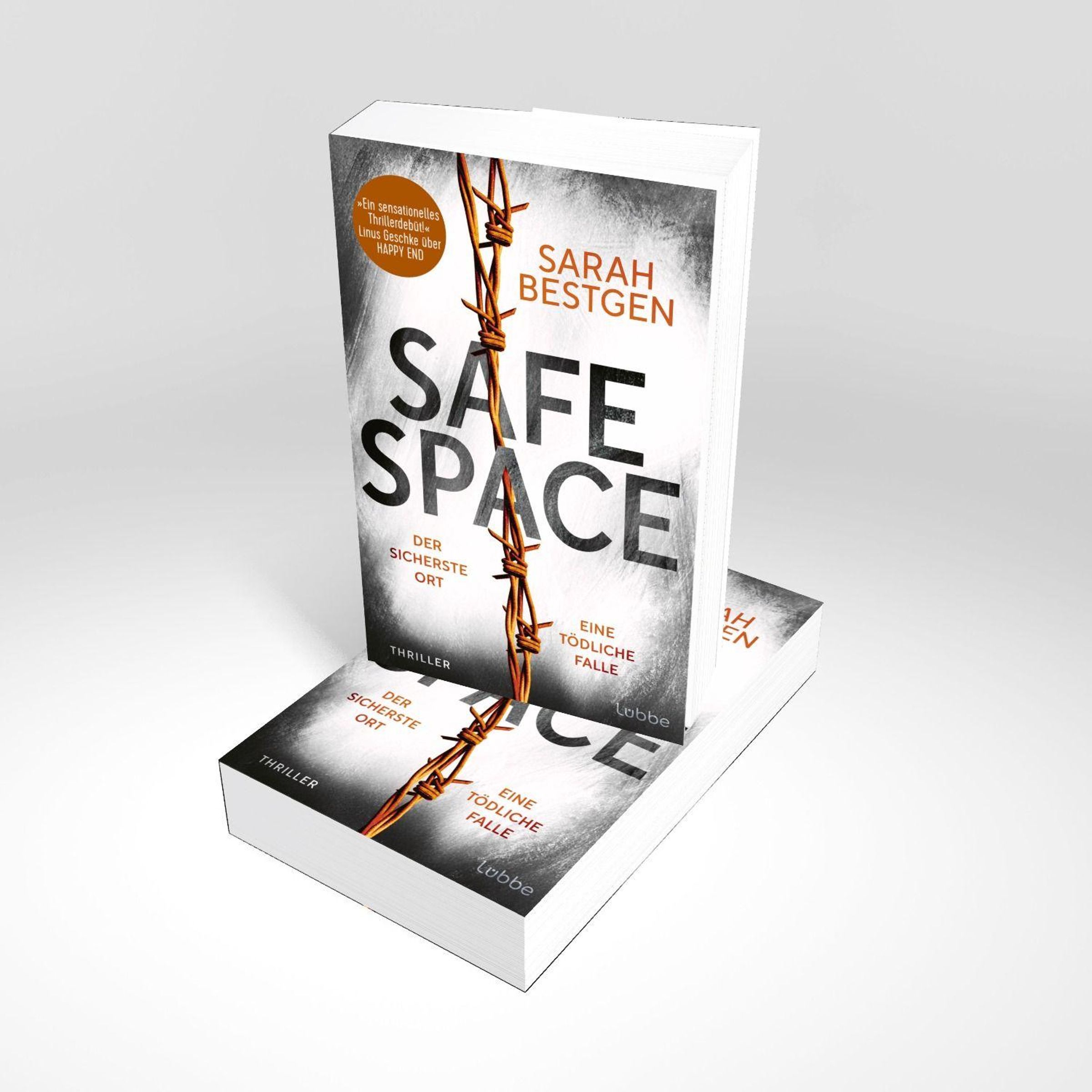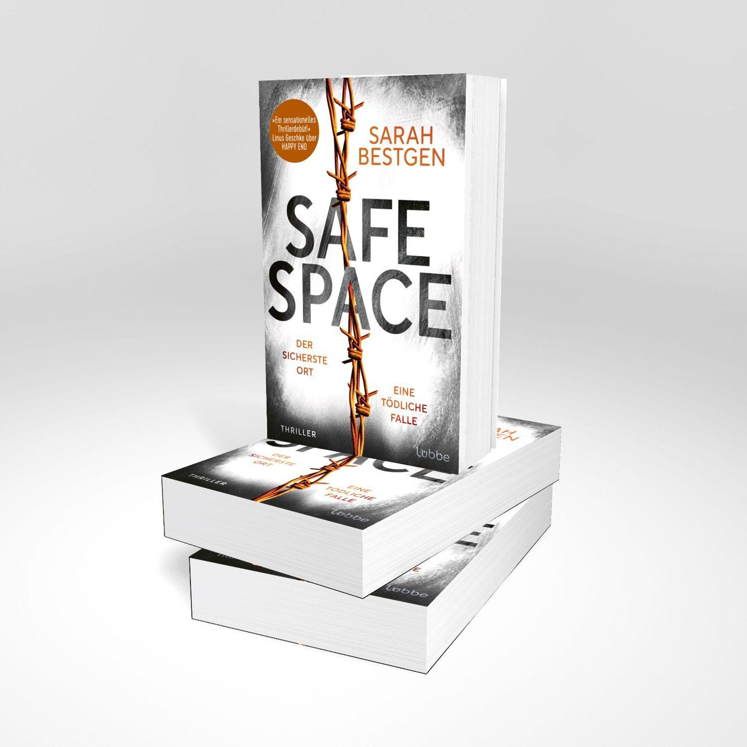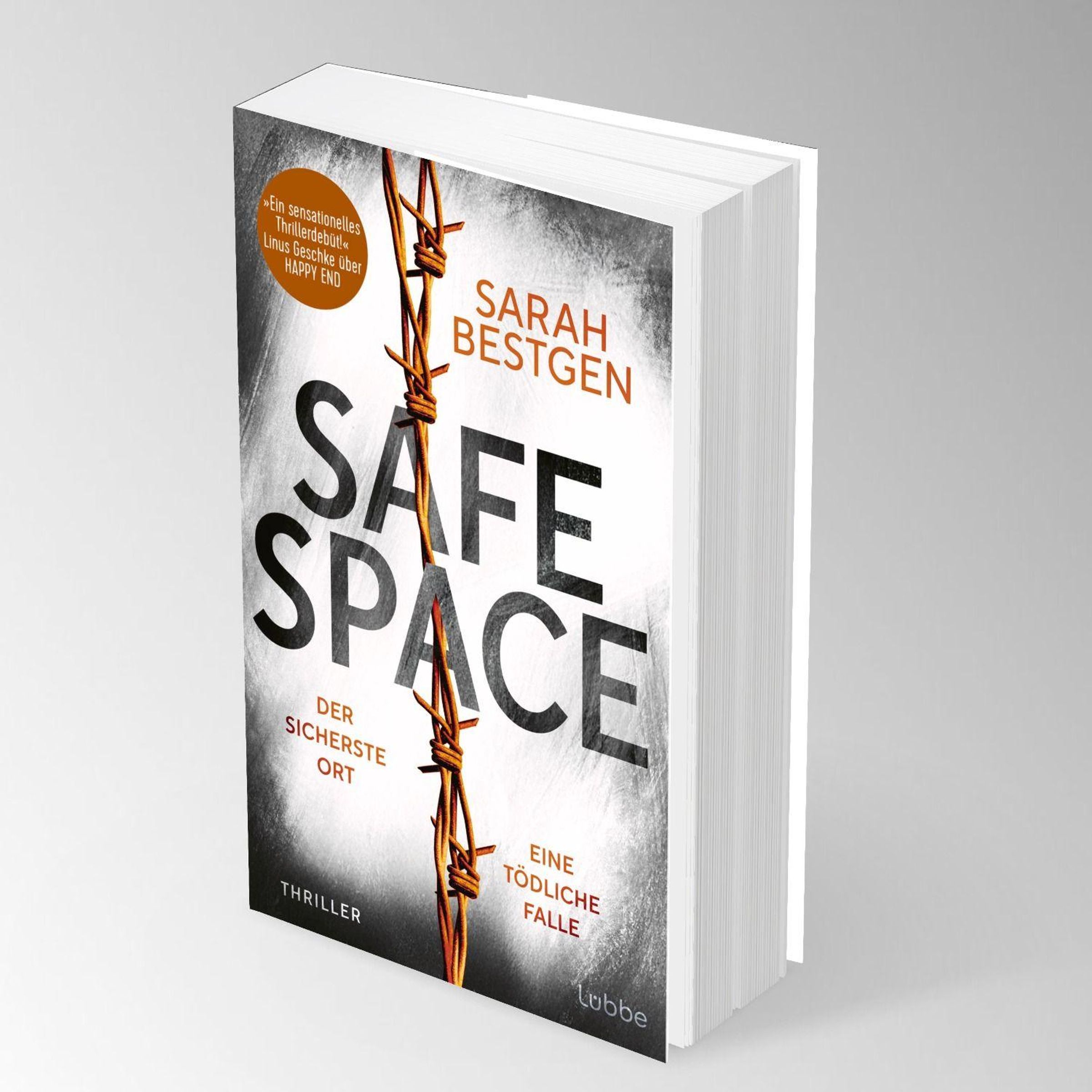 Text: "SAFE SPACE, SARAH BESTGEN, DER SICHERSTE ORT, EINE TÖDLICHE FALLE, THRILLER". Stacheldraht-Illustration auf Buchcover., Buch