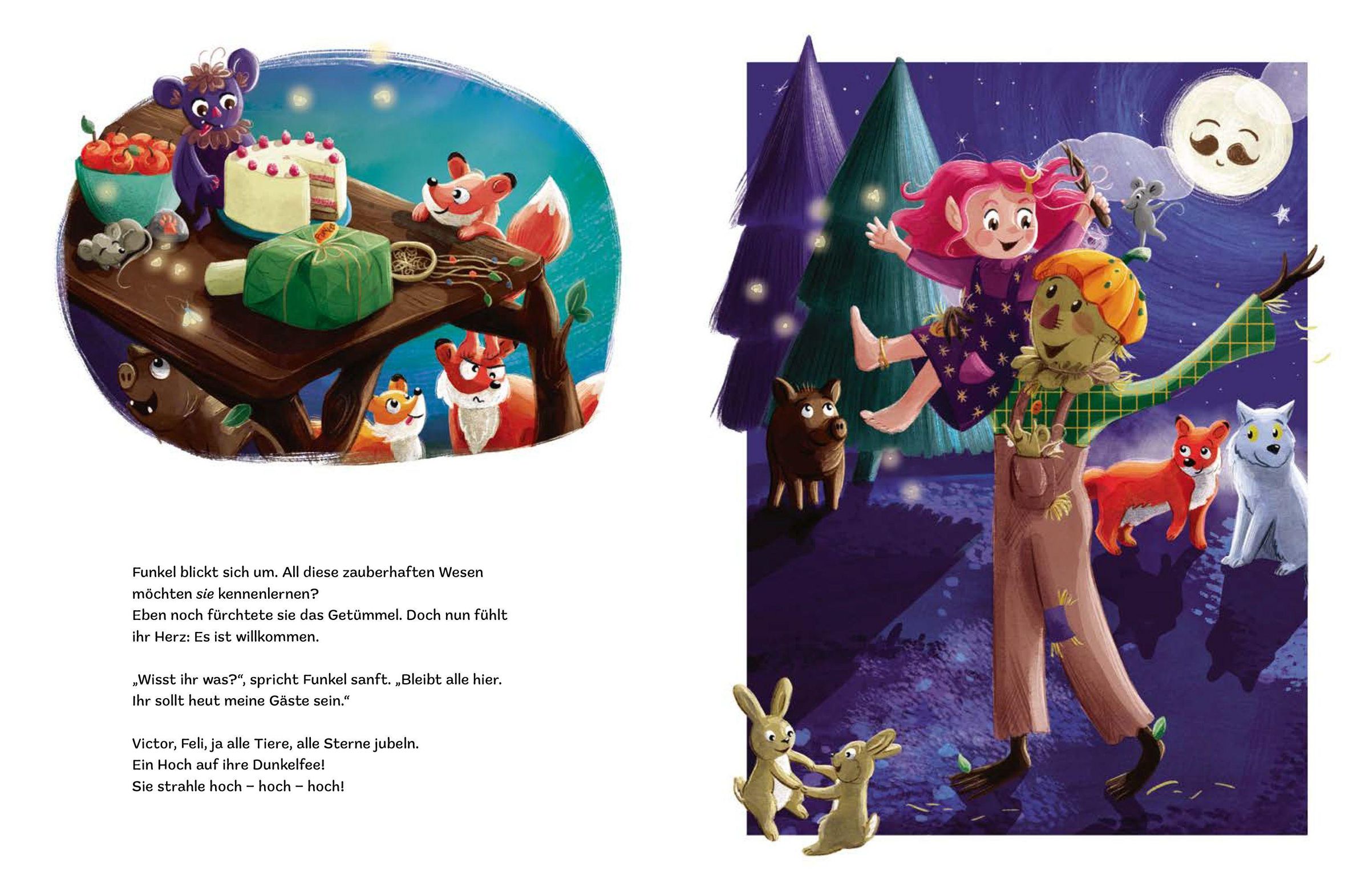 Funkel ist eine Dunkelfee. Sie liebt alles, was ein bisschen knorrig, wurzig und dunkel ist. Wenn sich die Dunkelheit über den Himmel spannt, ist die kleine Fee im Wald und hilft der Schleiereule, ihre Stimme wieder zu finden und dem Fuchs, sein Fell zu entwirren. Aber sie traut sich nur, aus ihrem Versteck heraus zu zaubern! Ganz heimlich hilft sie allen und möchte nicht entdeckt werden. Als die Waldtiere sie zu ihrem Wintersonnenfest einladen wollen, ist Funkel unsicher. Traut sie sich, dort zu erscheinen? Mit ihrem neuen Freund, Victor der Vogelscheuche, kann sie ihren Mut zusammennehmen und mutig sein!