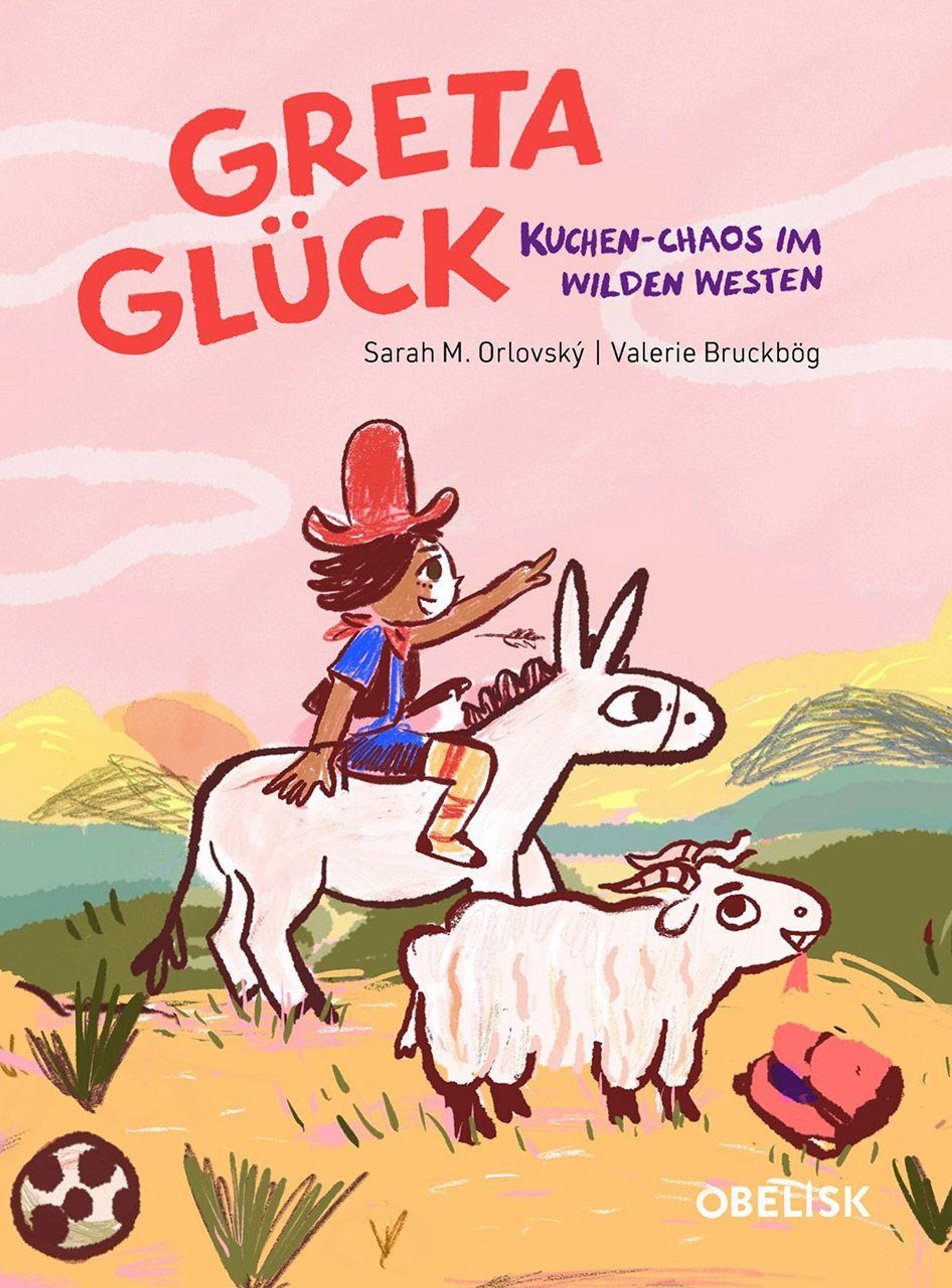 "GRETA GLÜCK: Kuchen-Chaos im Wilden Westen" von Sarah M. Orlovský, Valerie Bruckbög. Illustration von Kind auf Esel in Wüstenlandschaft., Buch