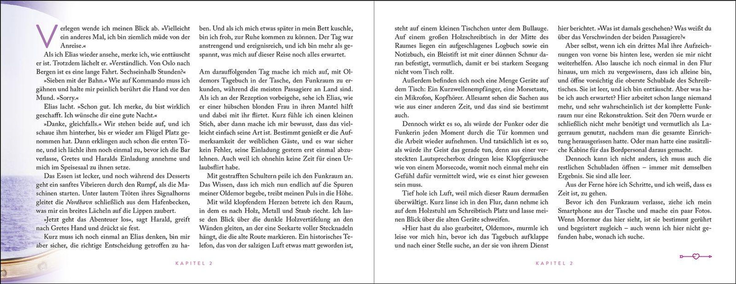 Als Iris an Bord des historischen Passagierschiffs MS Nordhavn geht, möchte sie nicht nur eine unvergessliche Zeit auf ihrer Fahrt entlang der winterlichen norwegischen Küste verbringen. Sie hat auch ein Ziel: das Geheimnis ihrer Urgroßmutter zu lüften, die einst Funkerin auf der Nordhavnwar. Doch kaum hat die Reise begonnen, erwarten sie nicht nur die traumhafte Szenerie von Norwegens Fjorden und ein außergewöhnliches Schiff, dessen Mysterien sie erkundet. Bald spürt Iris auch ein Flattern im Bauch dank des charmanten Bordpianisten Elias.